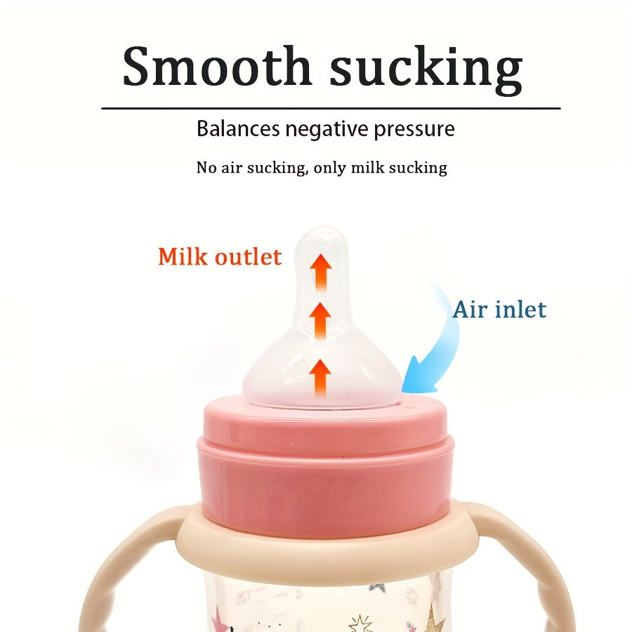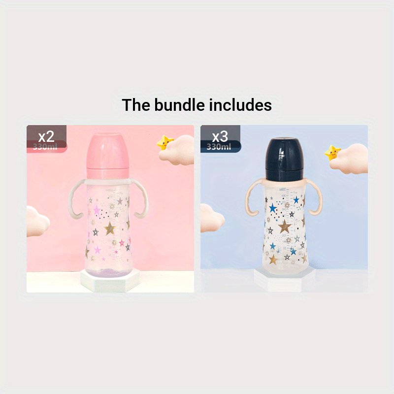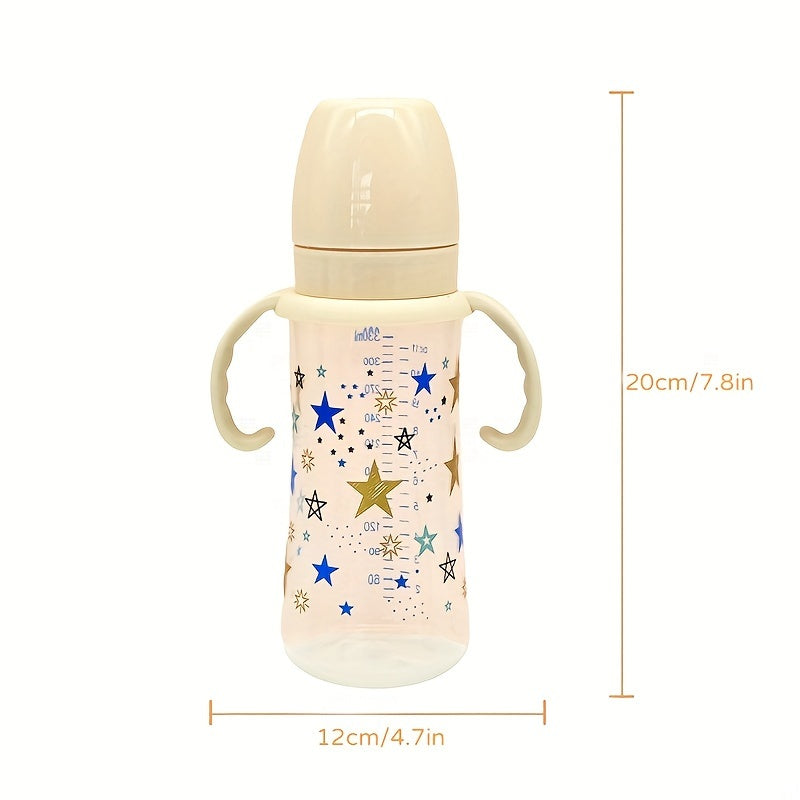 330 мл бутылка большого объема с широким диаметром, ручками и ударопрочным материалом PP. С рисунком в виде мультяшной звезды, это идеальная бутылочка для кормления для младенцев.