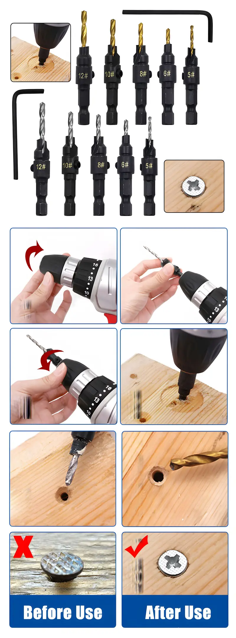 Набор сверл для зенкования дерева из 4/5 шт. с хвостовиком 1/4" с шестигранным хвостовиком