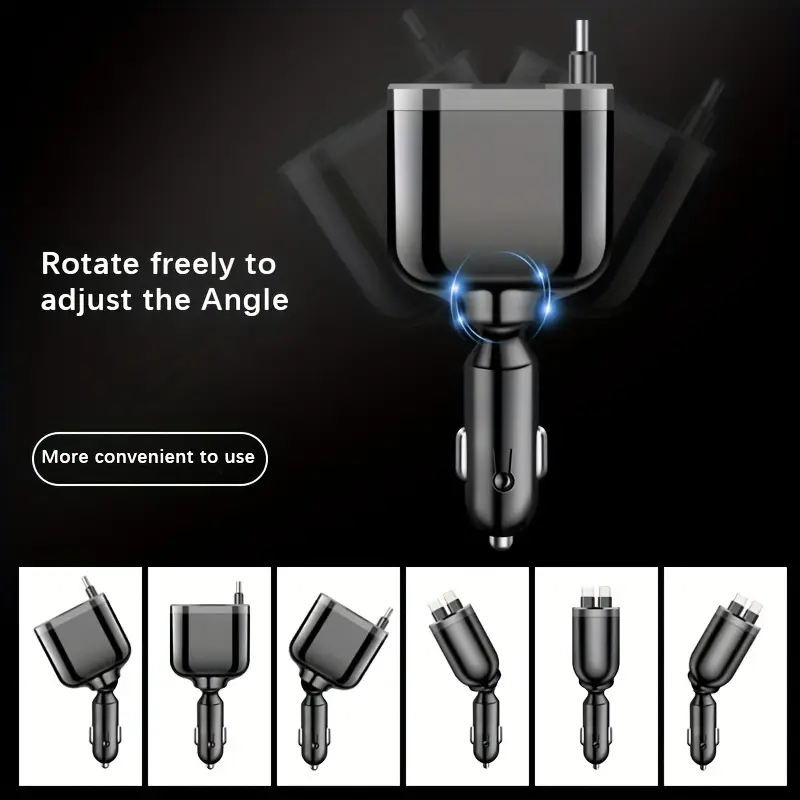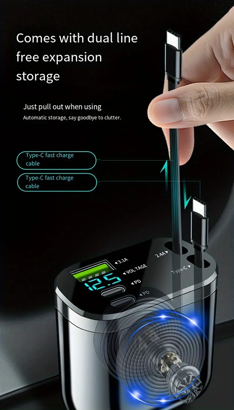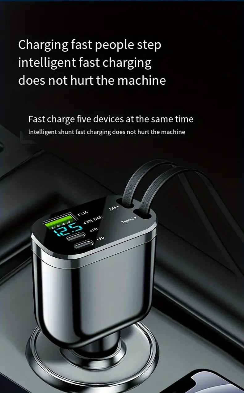 4-в-1 Быстрая зарядка для автомобиля с выдвижным кабелем, два порта PD