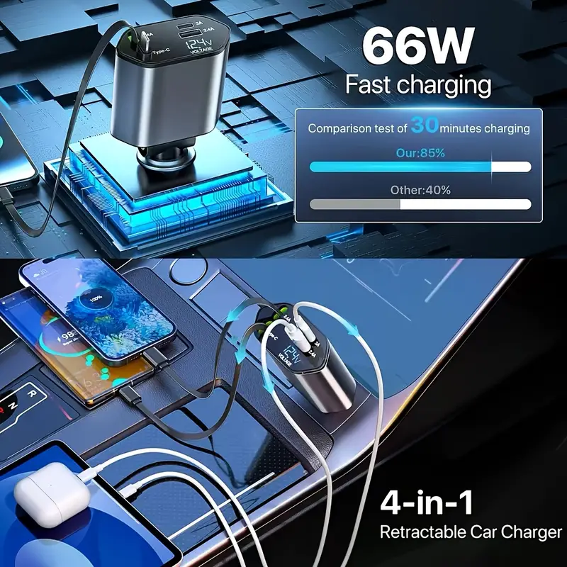4-в-1 выдвижное автомобильное зарядное устройство с 66 Вт PD QC3.0 и кабелем длиной 2,6 фута