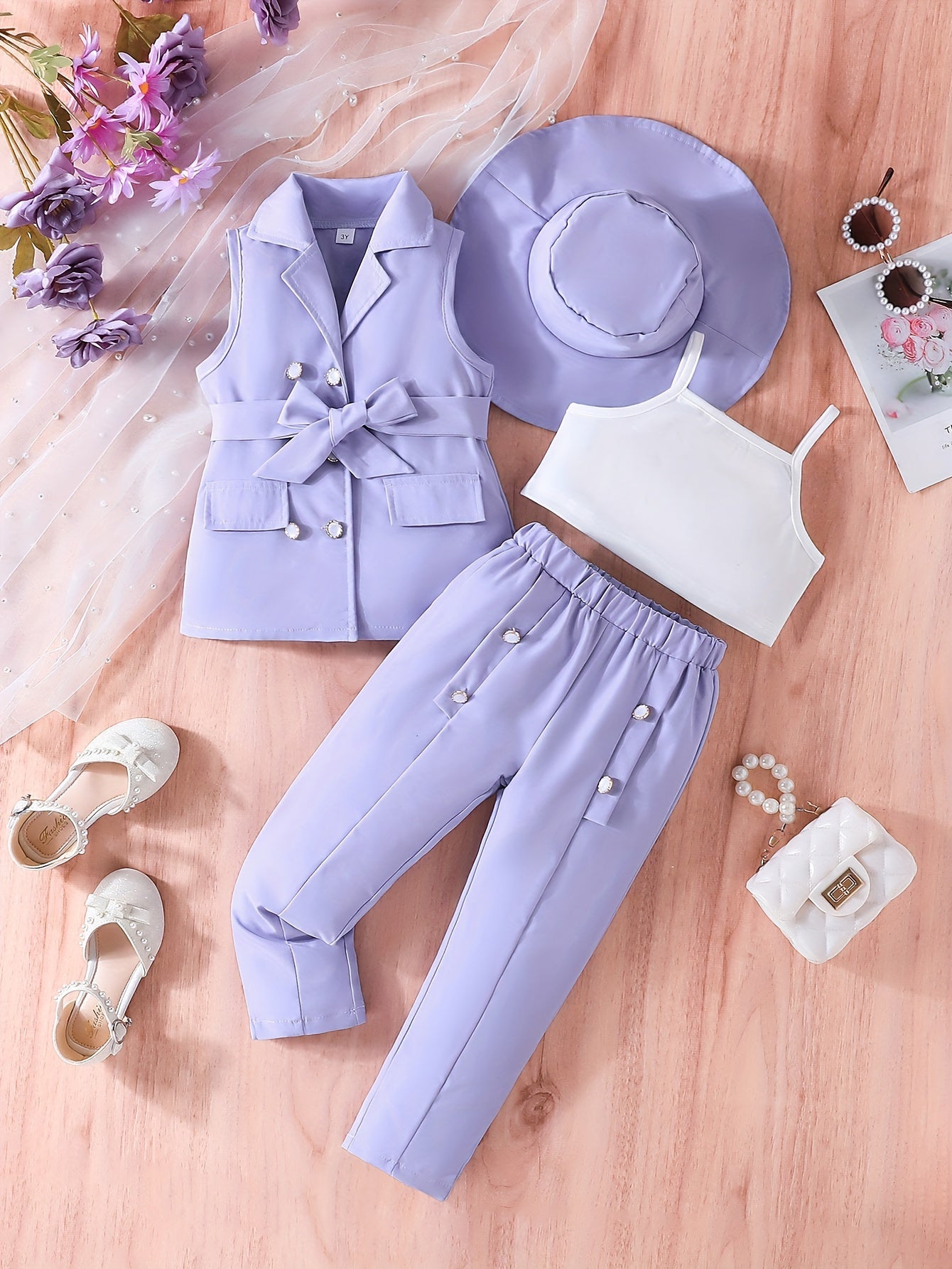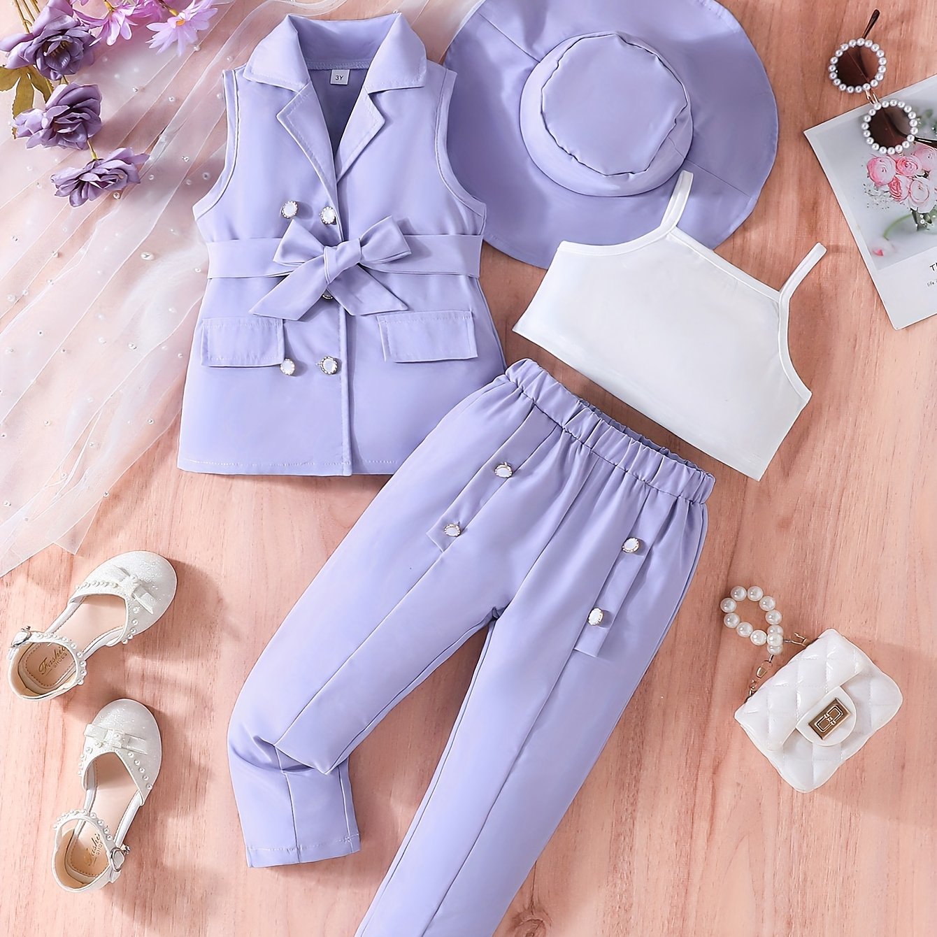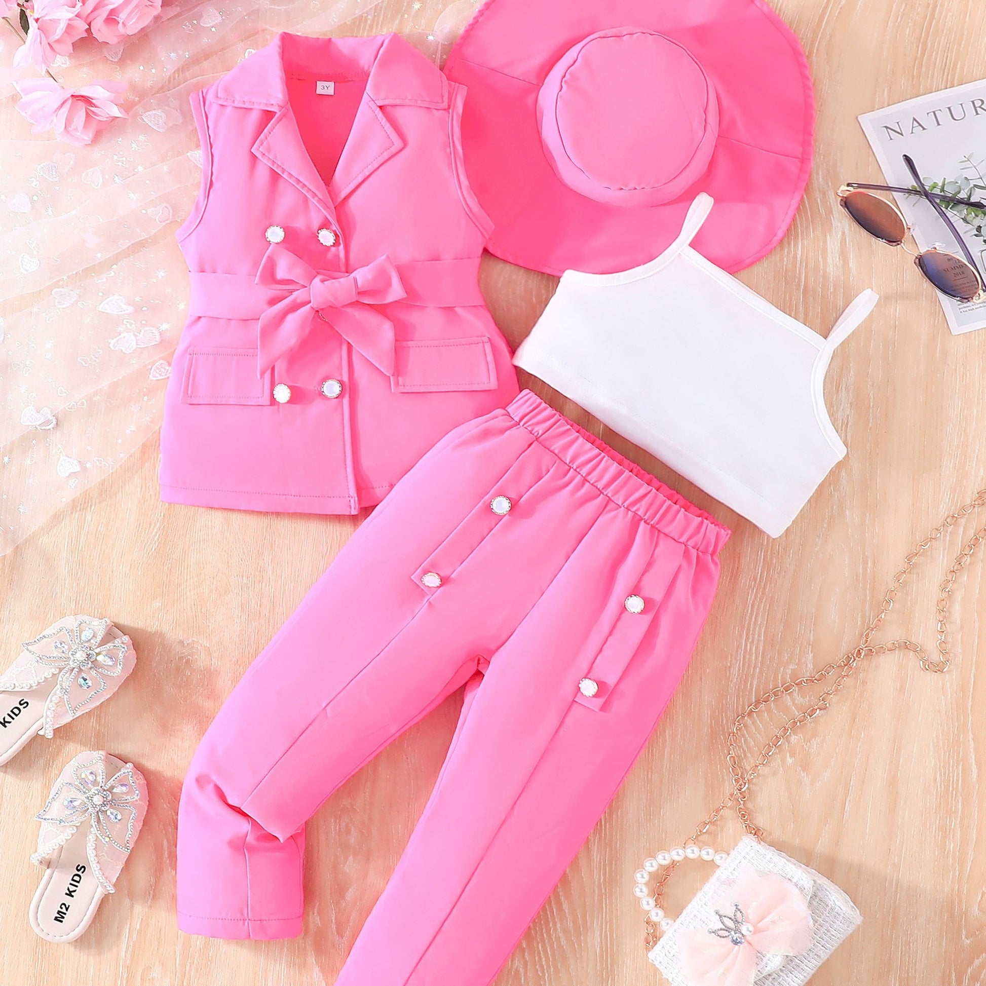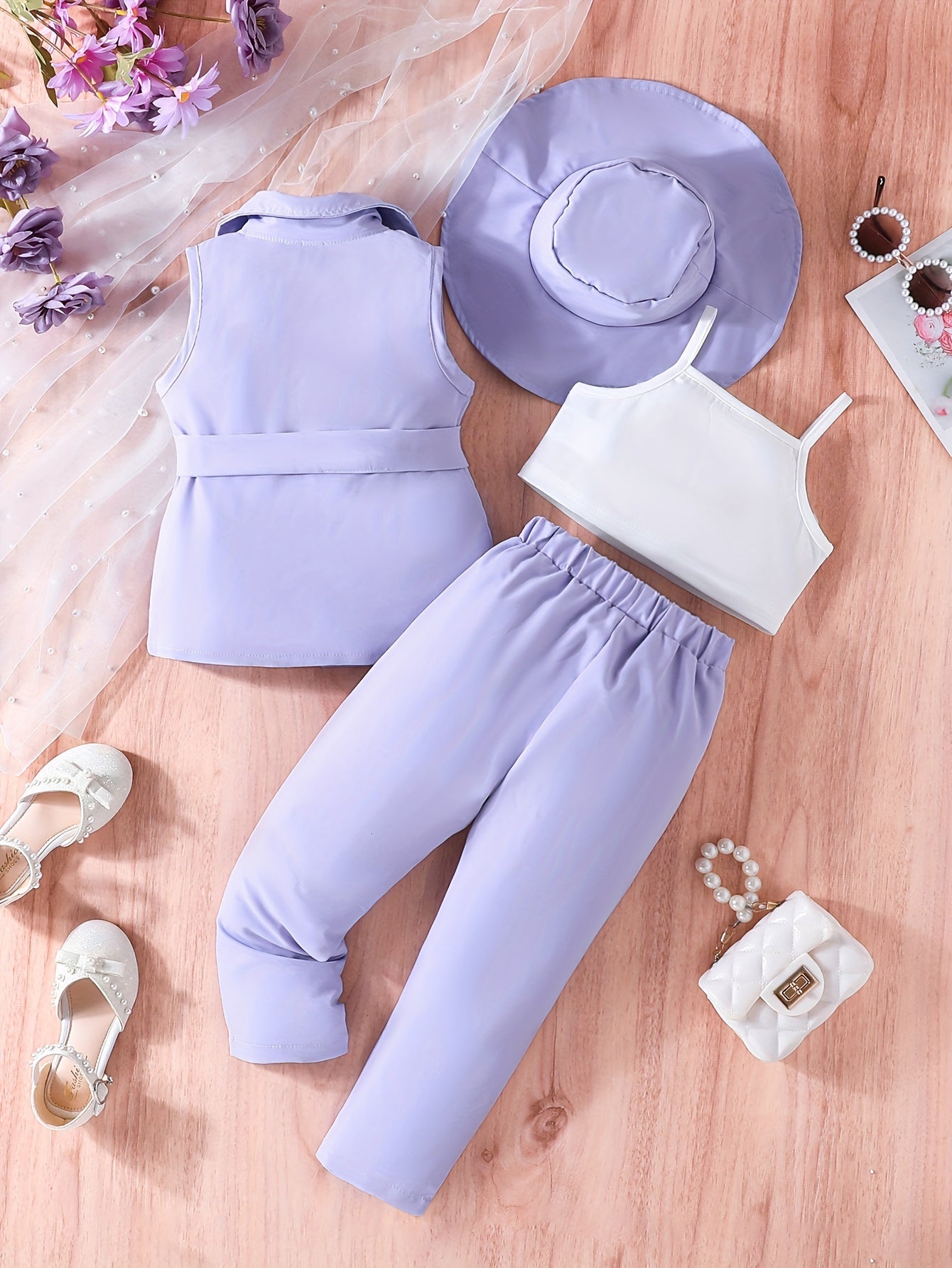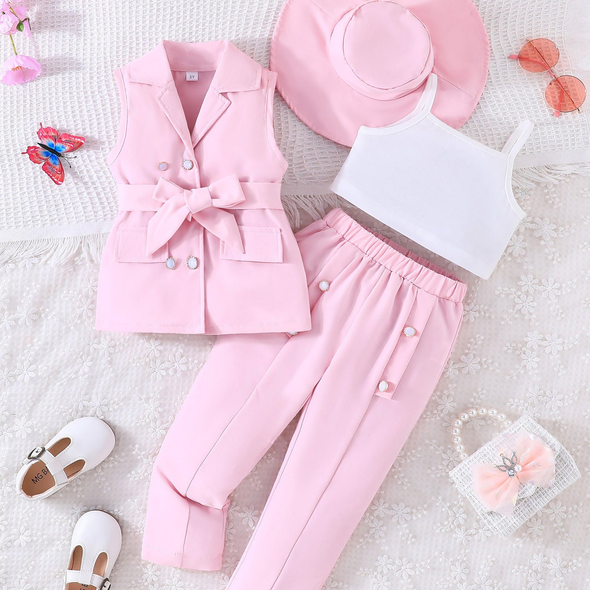 Девочкиный 4-частный костюм: жилет без рукавов, брюки, майка, шляпа, весна-лето, повседневный