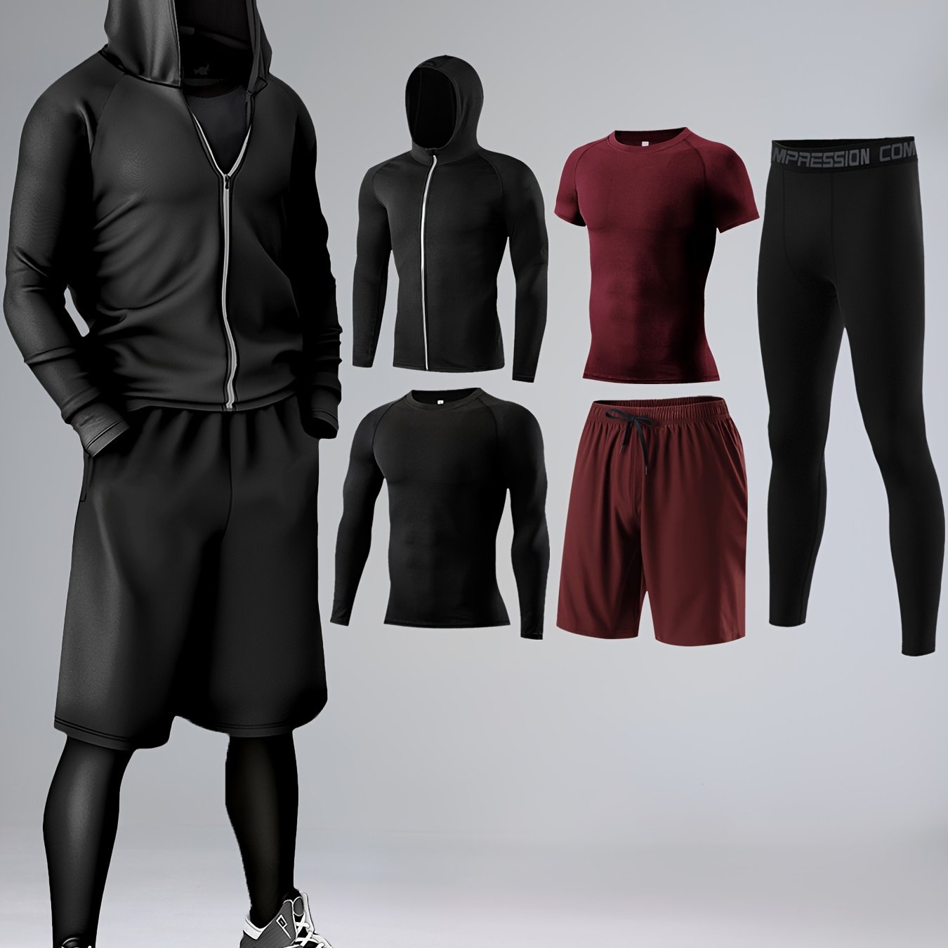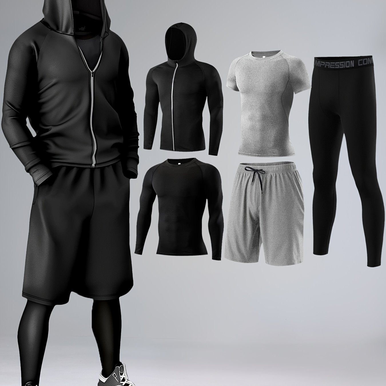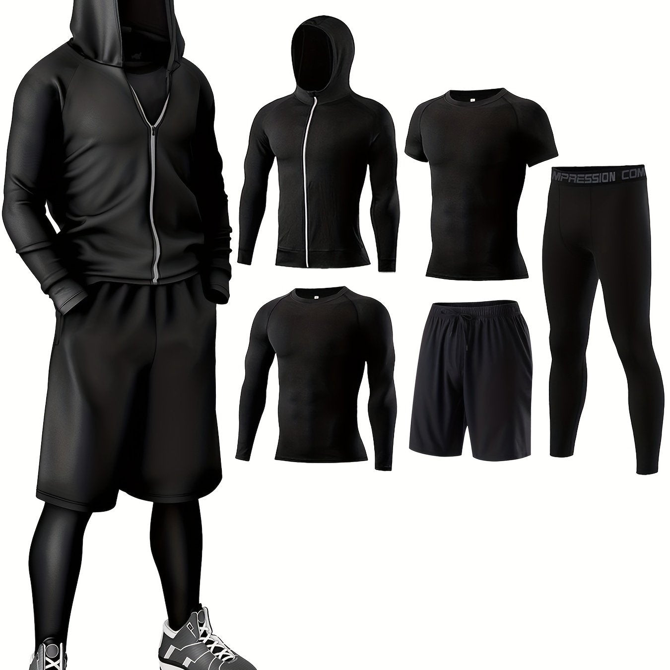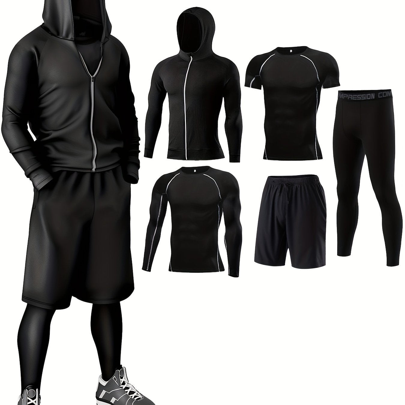 5-частный комплект спортивной одежды, изготовленный из быстросохнущего трикотажа из полиэстера и эластана для круглогодичного ношения. Включает худи, футболки, шорты и брюки для различных видов активности, таких как бег.