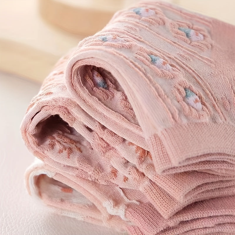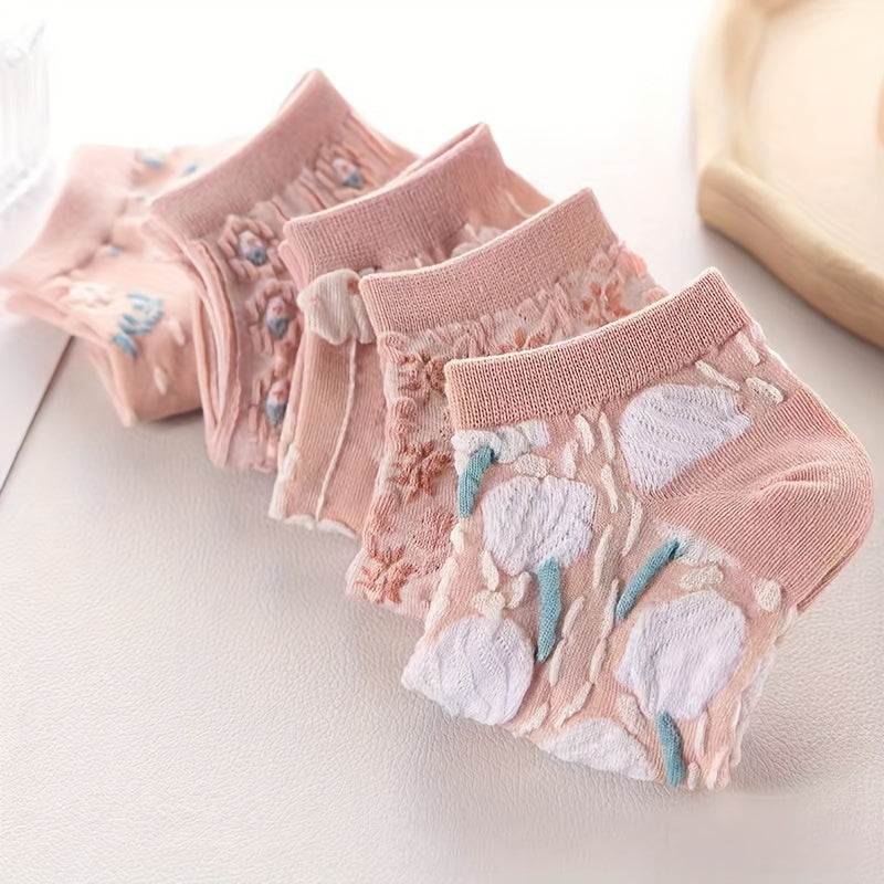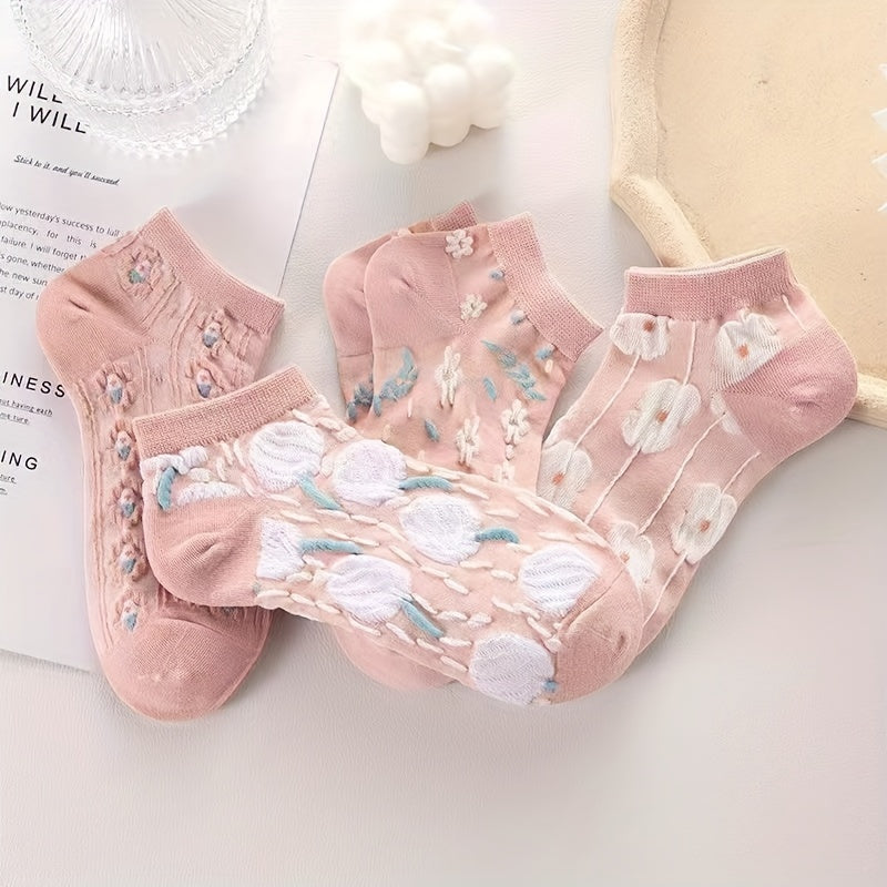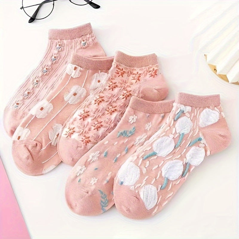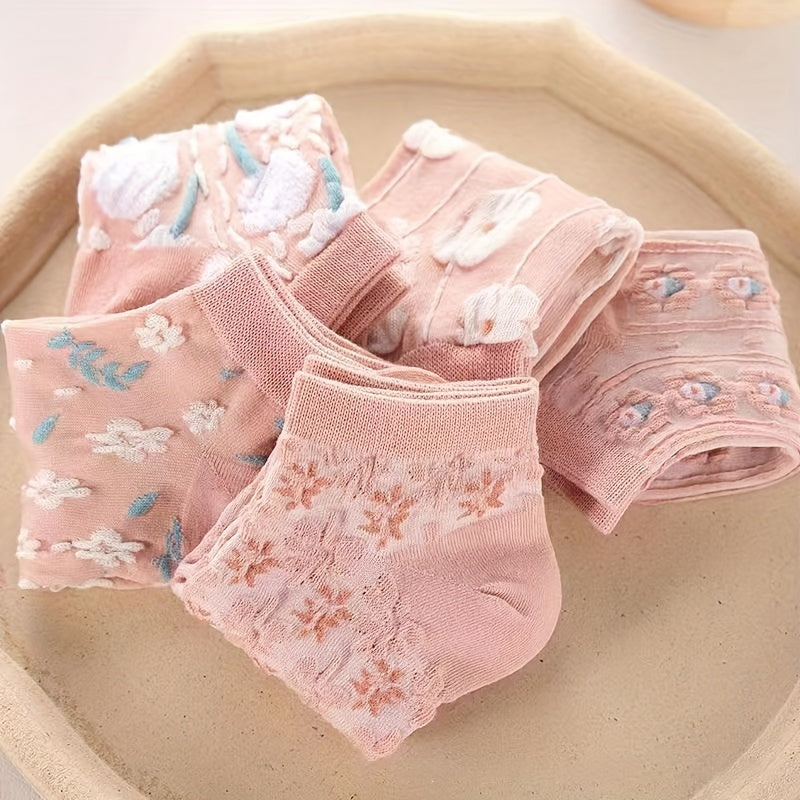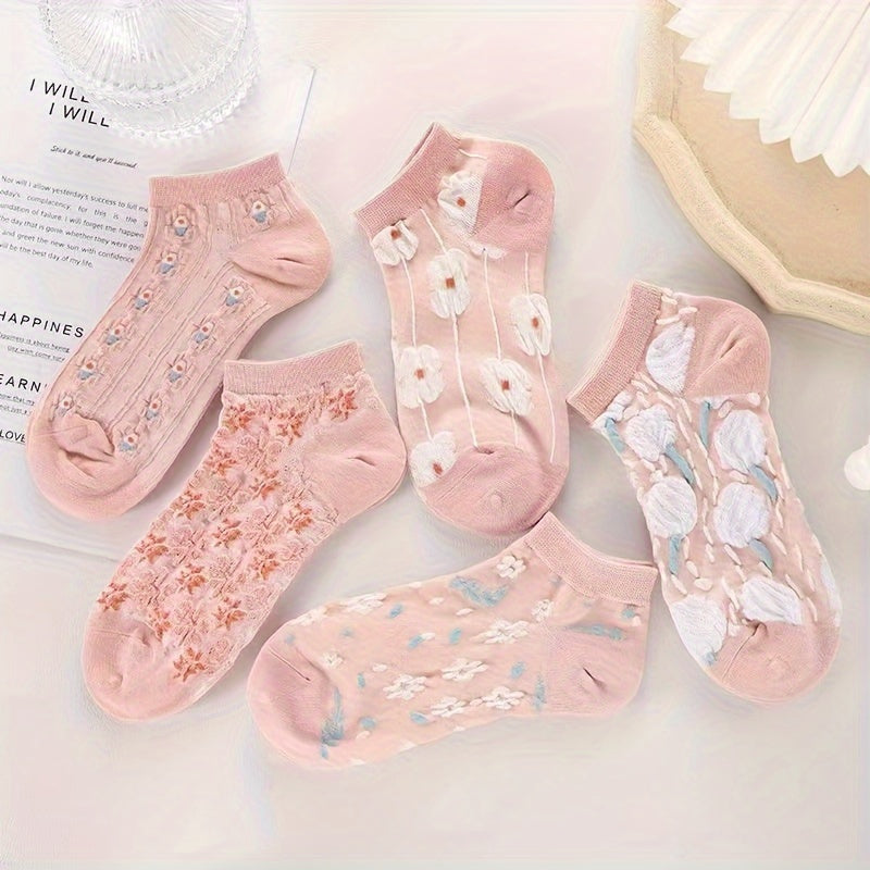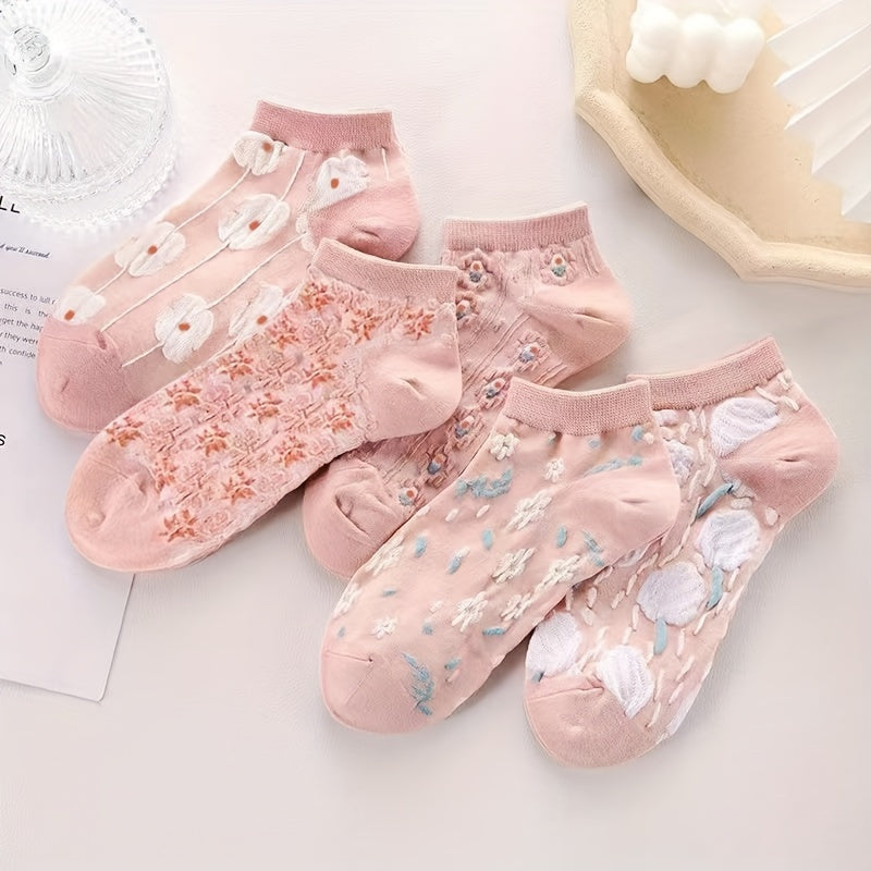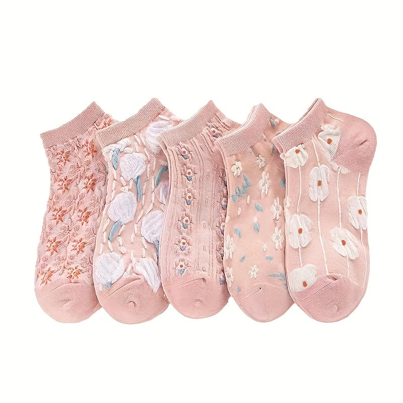 5 полупрозрачных розовых цветочных носок для женщин, изготовленных из мягкого полиэстера с нежными цветочными узорами, идеально подходящих для весны и осени.