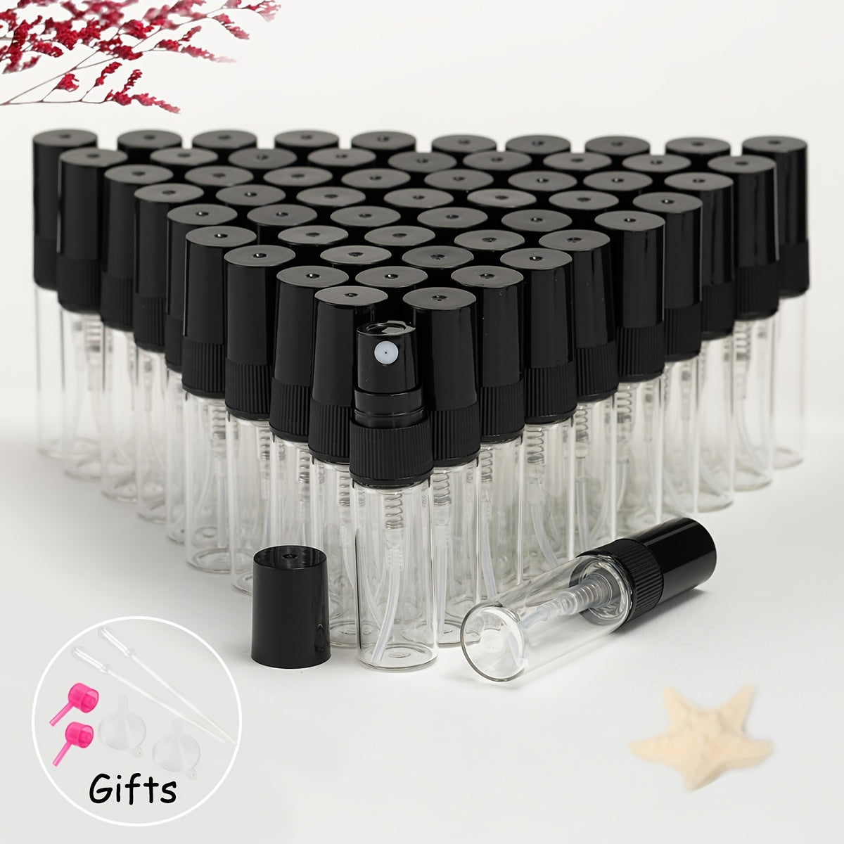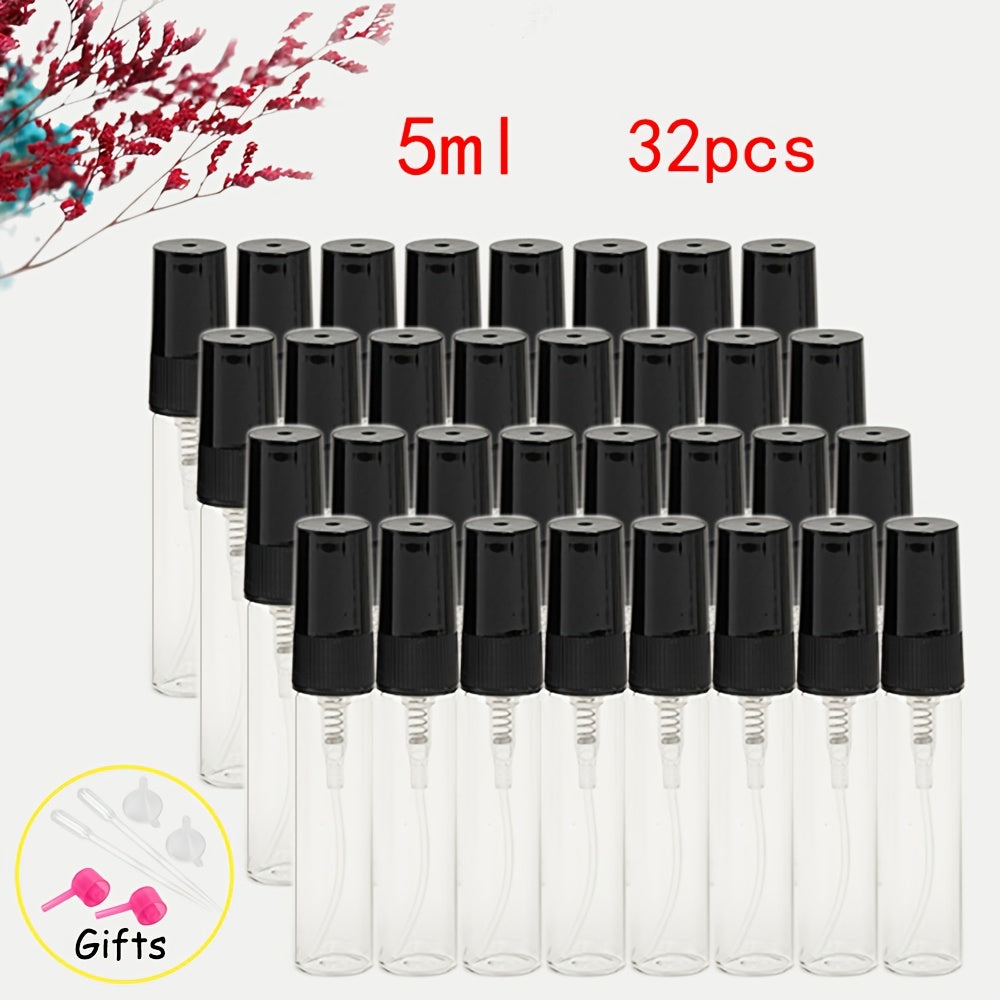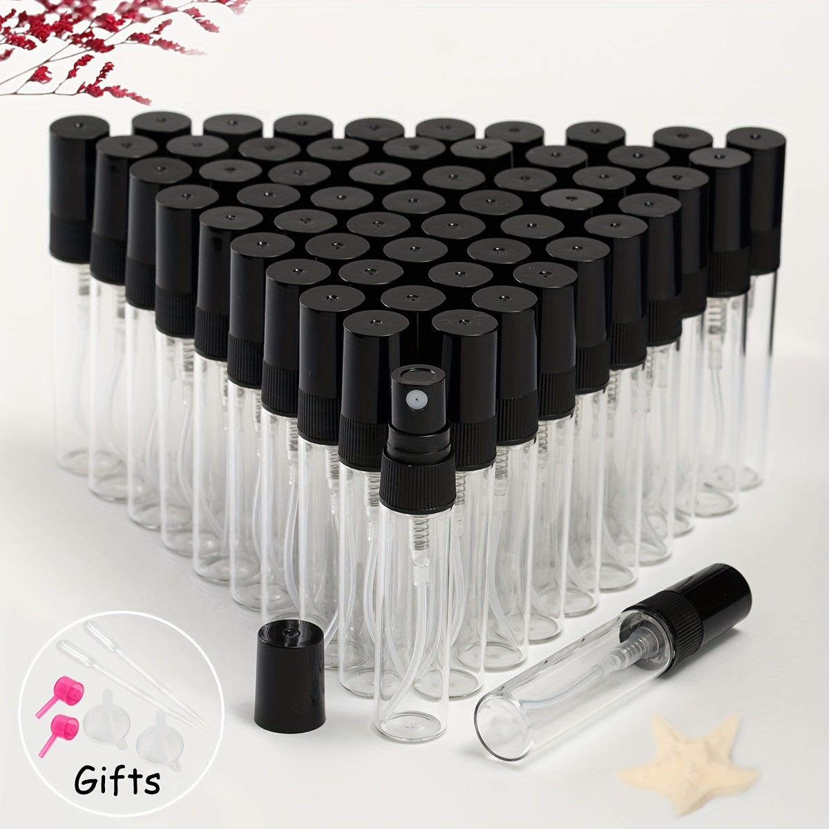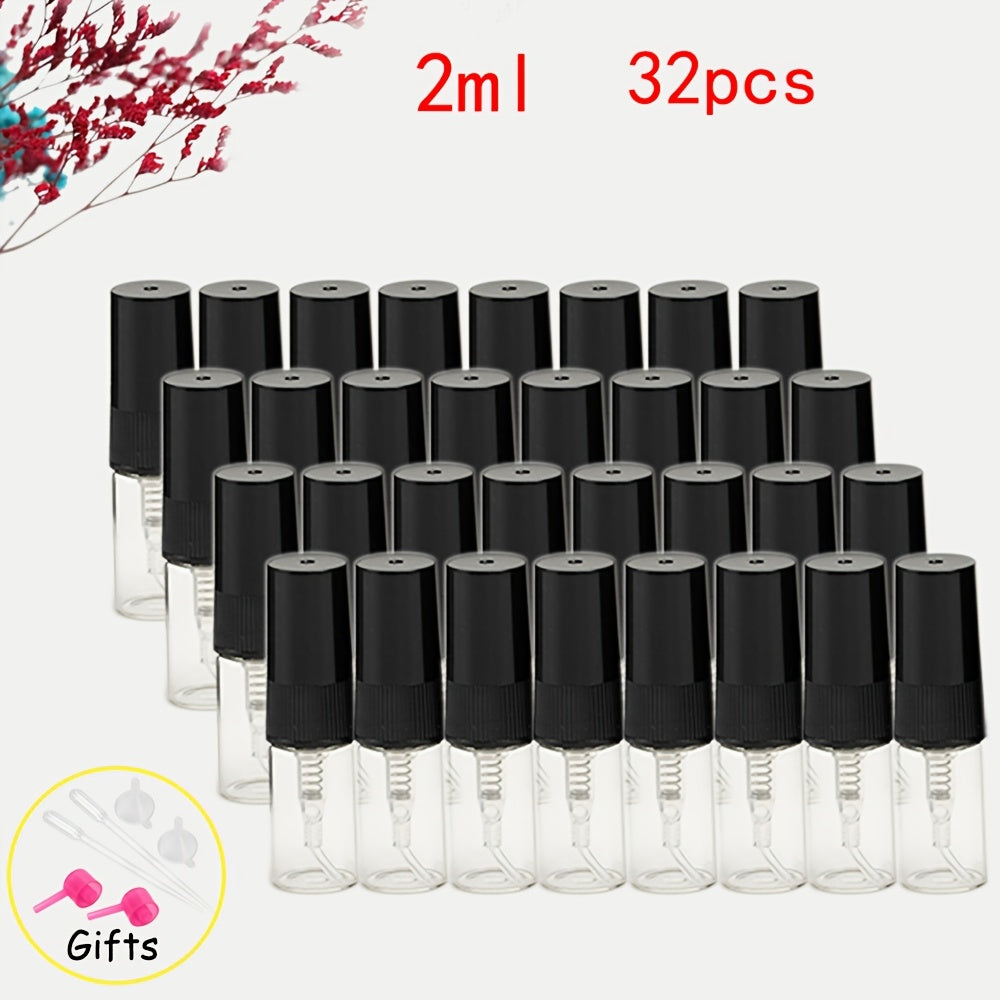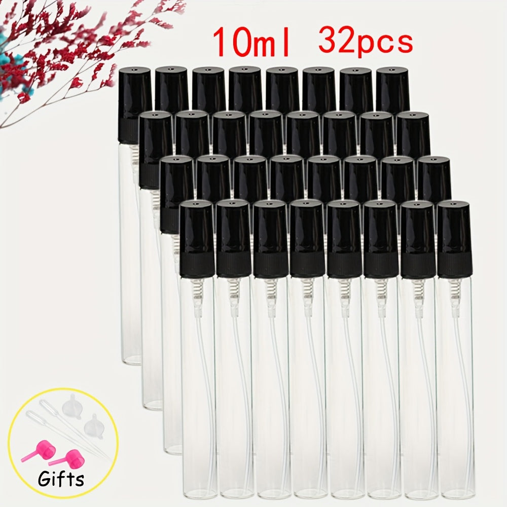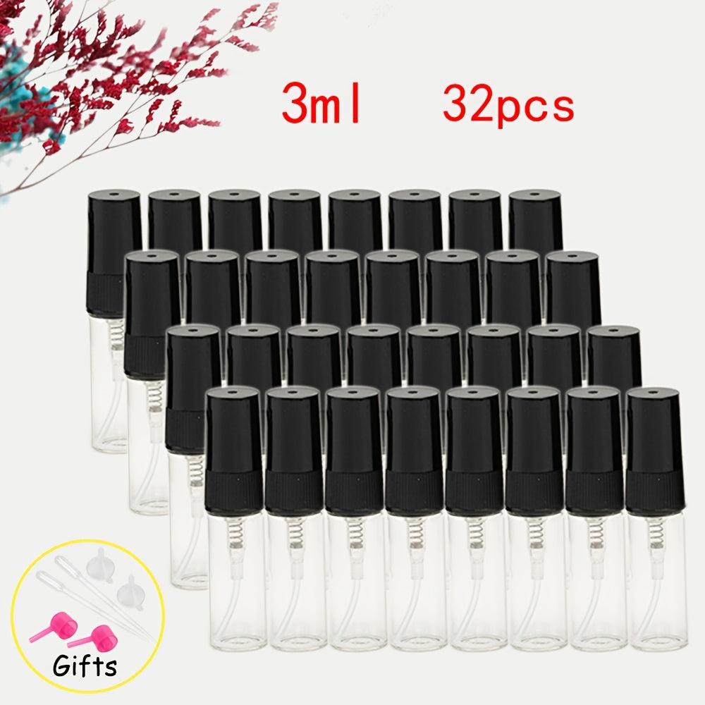 56 прозрачных стеклянных флаконов для духов с многоразовыми распылителями различных размеров, идеально подходящих для путешествий и увлажнения.