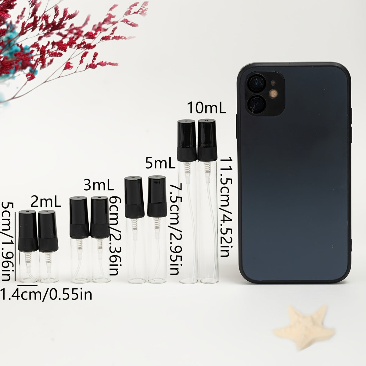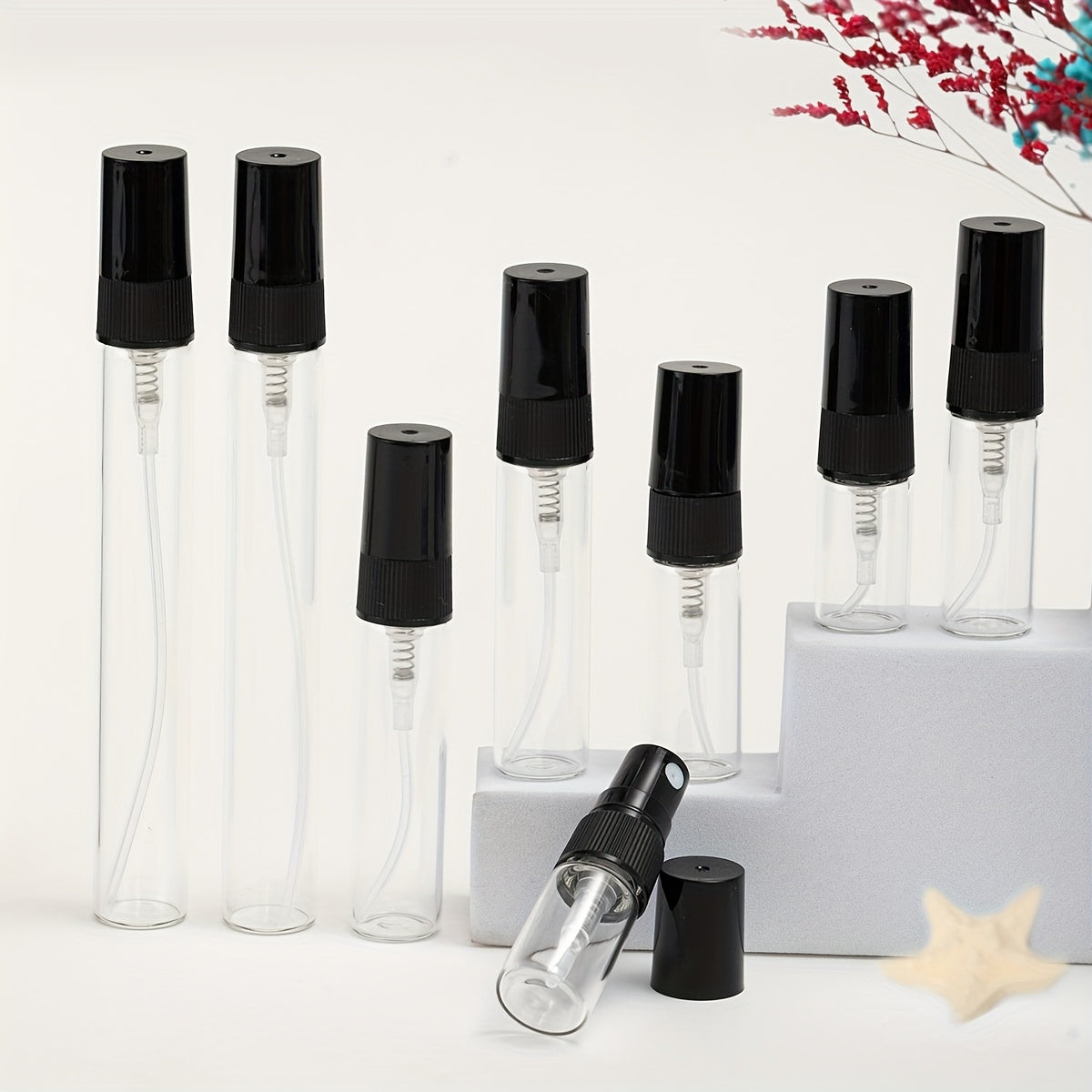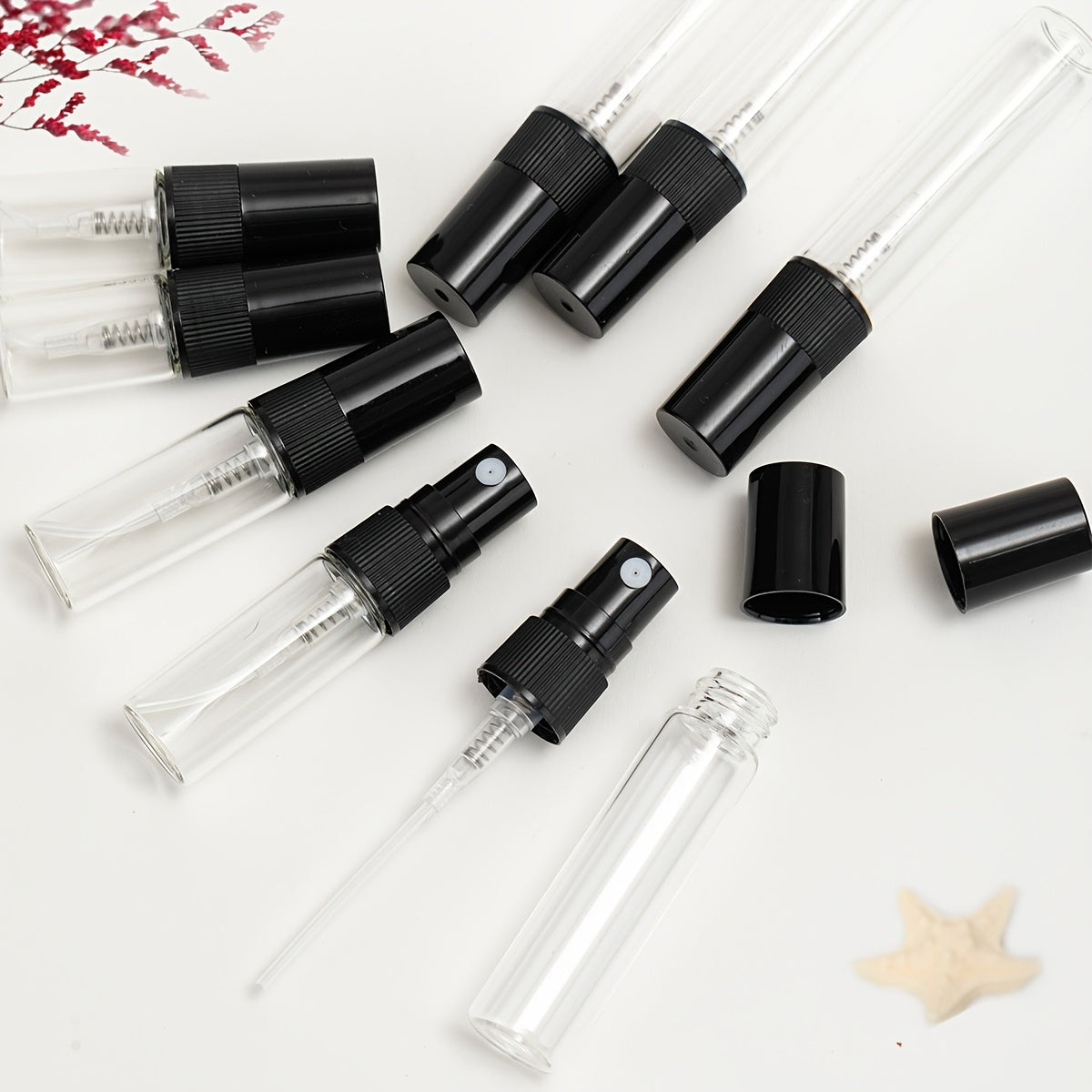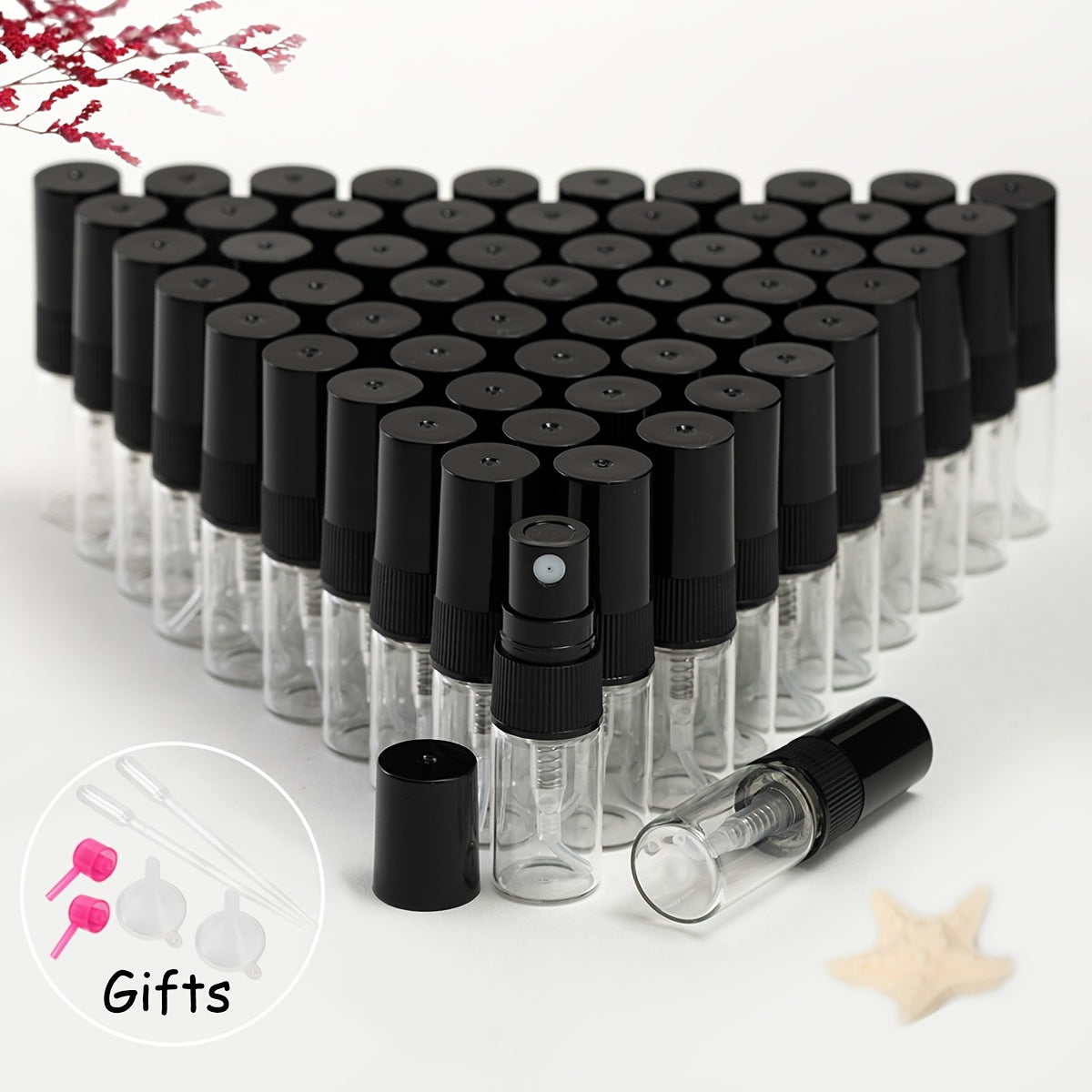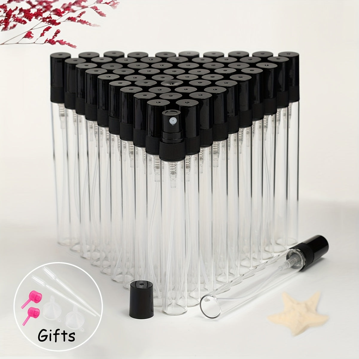 56 прозрачных стеклянных флаконов для духов с многоразовыми распылителями различных размеров, идеально подходящих для путешествий и увлажнения.