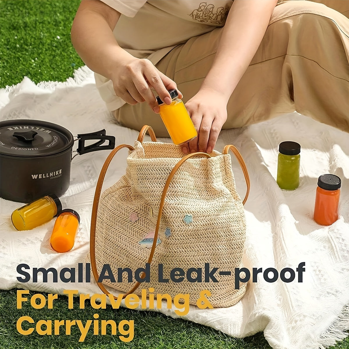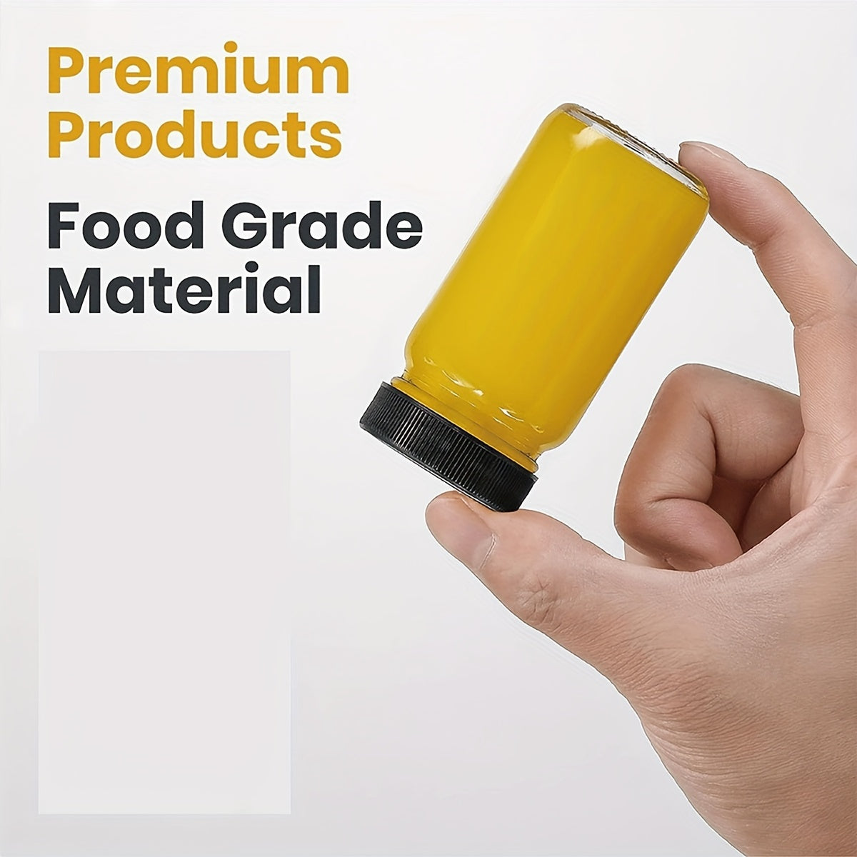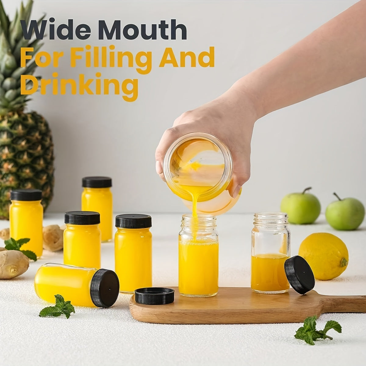 6 упаковка 2oz стеклянных шот-бутылок с черными крышками. Многоразовые, изолированные и пригодные для стирки в машине. Отлично подходят для имбирных шотов, образцов сока, виски и необходимых вещей в поездках.
