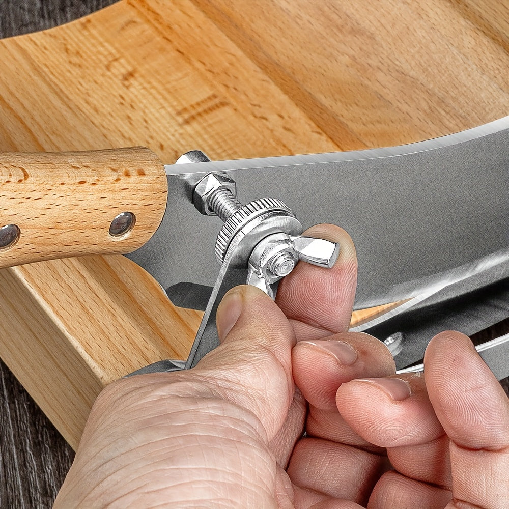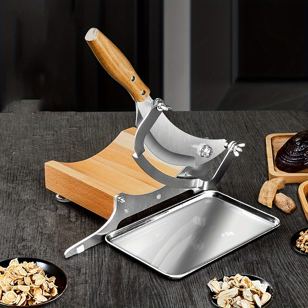 Регулируемый слайсер для китайской медицины из нержавеющей стали с резиновым деревянным основанием и точилкой - идеален для точного нарезания трав и специй.