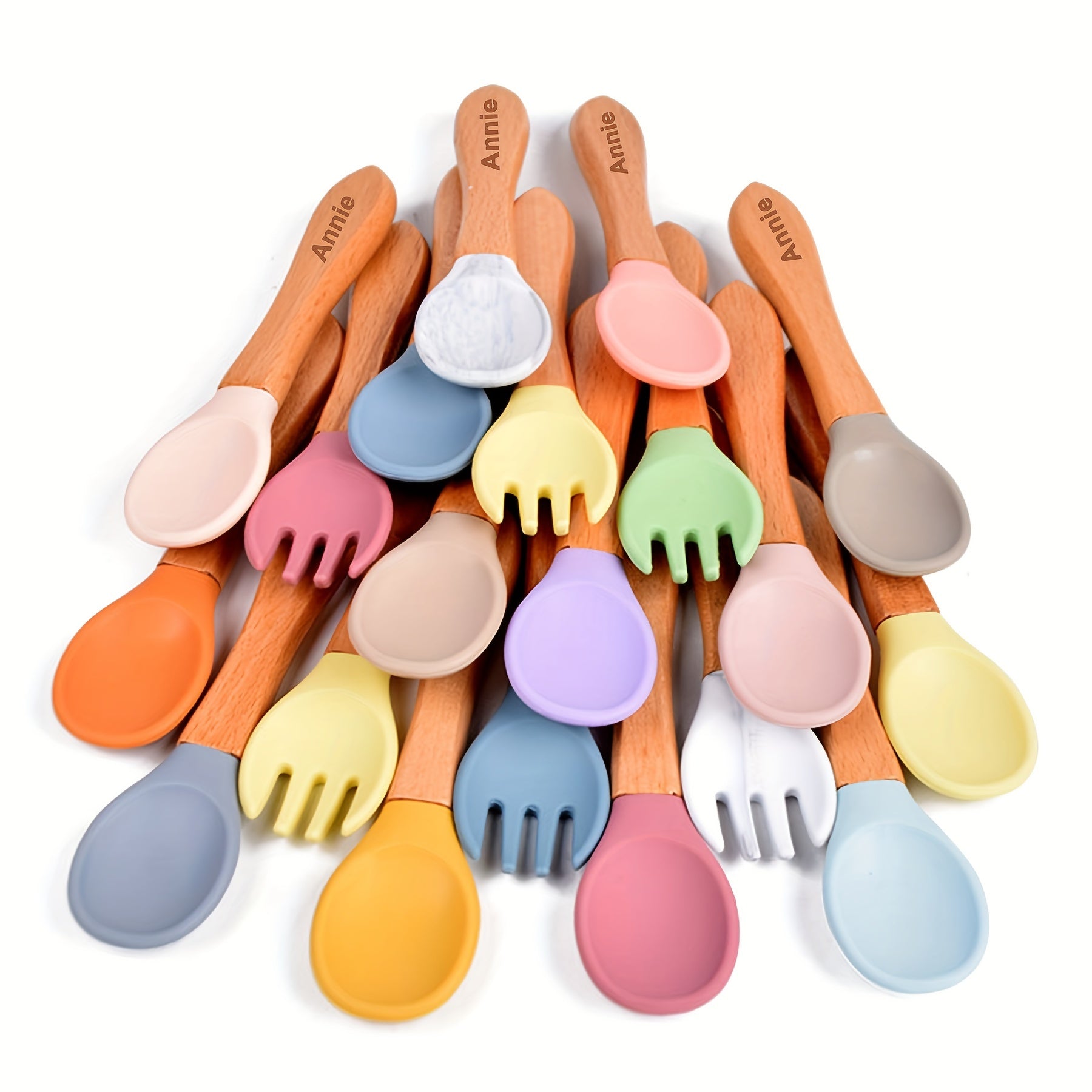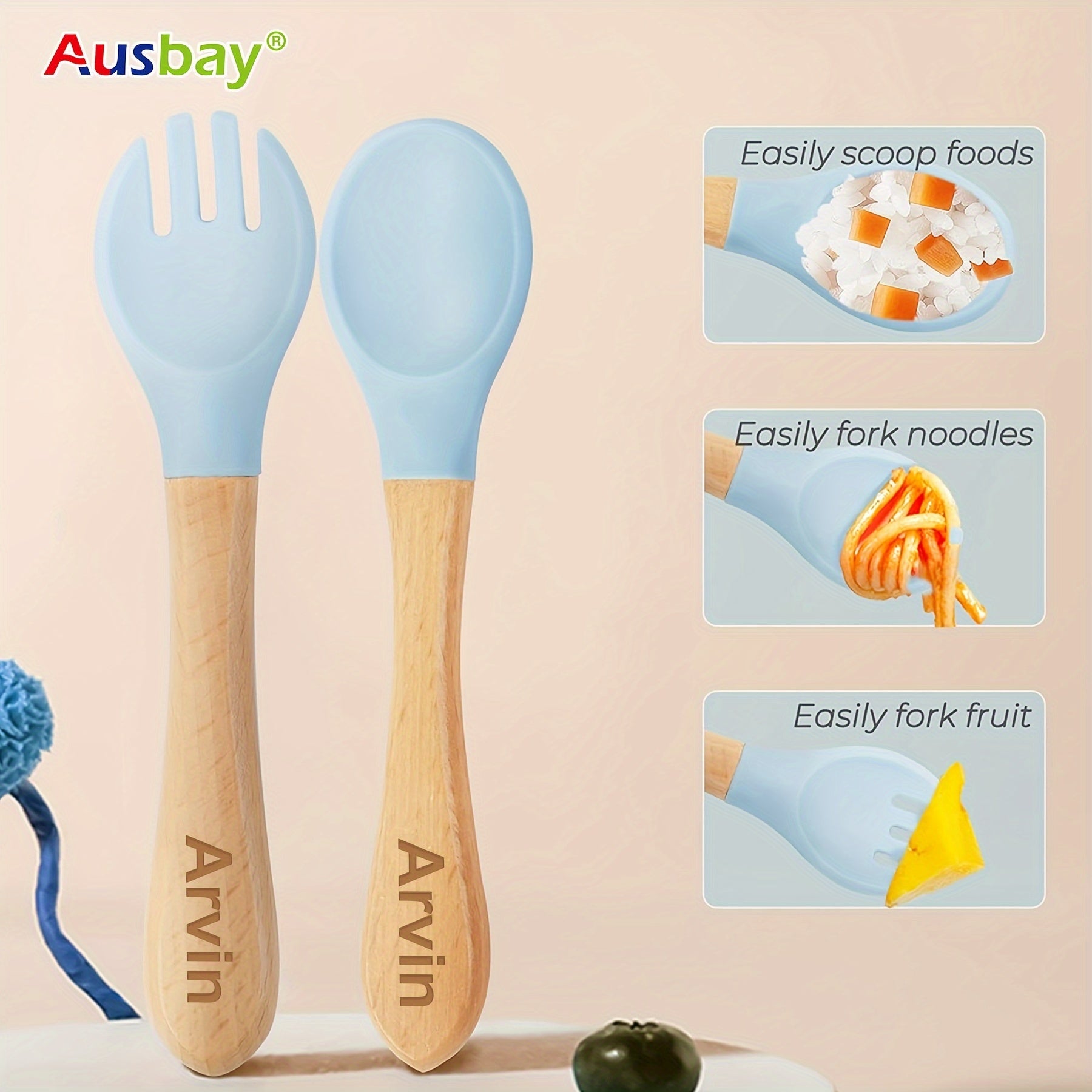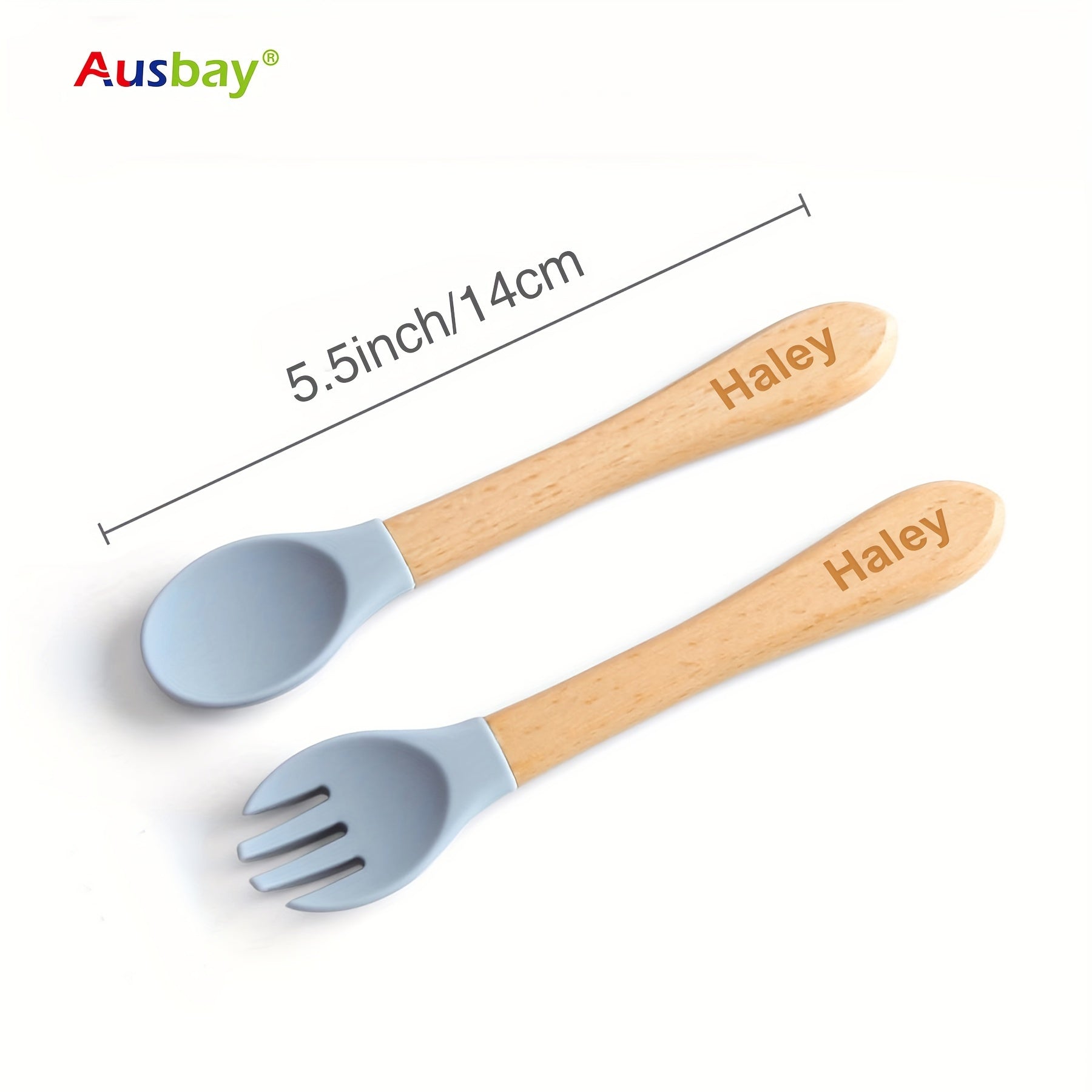 Набор из 2-х предметов персонализированных силиконовых ложки и вилки Ausbay для детей - прочный и надежный с ручкой с индивидуальным именем - идеален для детей и коллекционеров