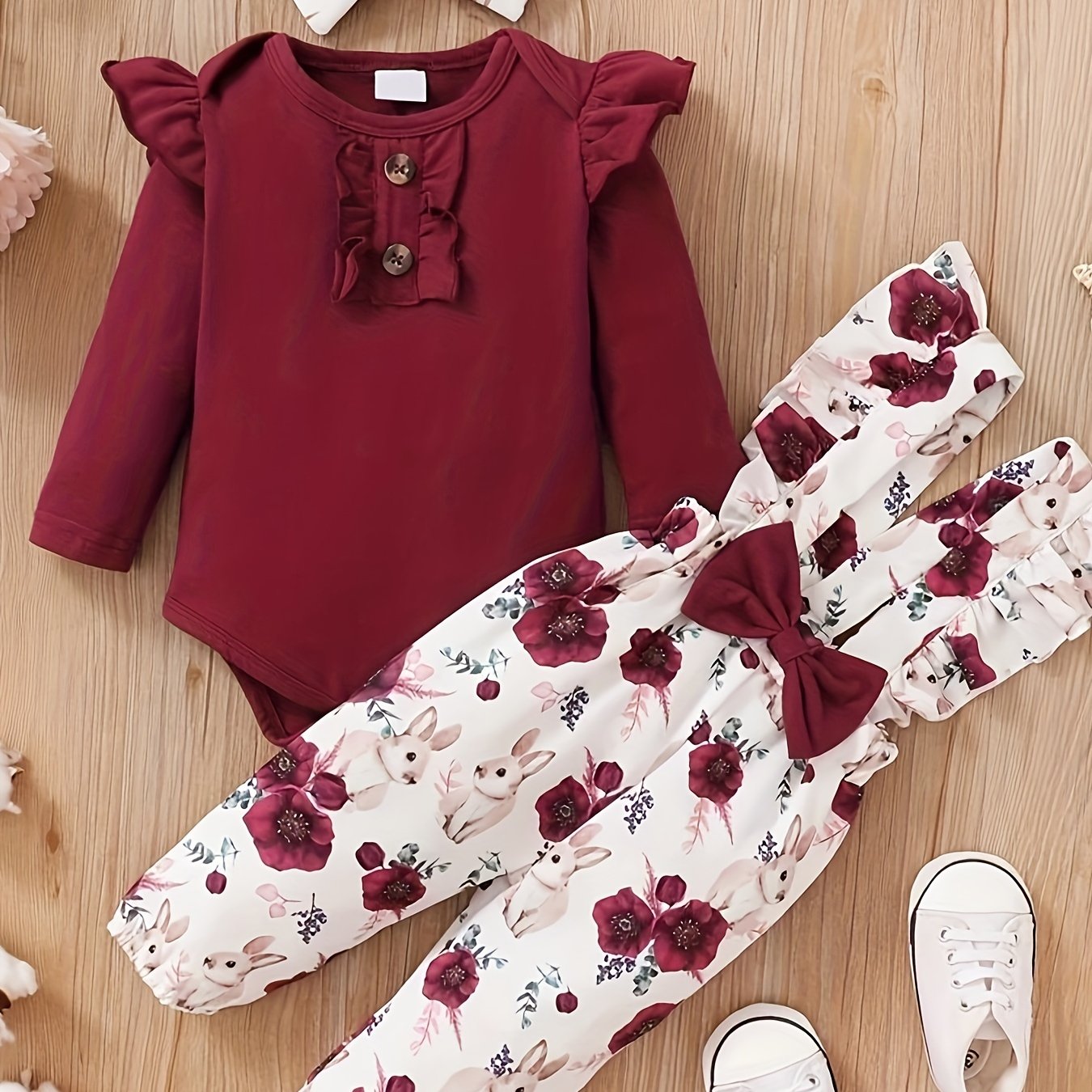 Набор повседневной одежды для девочек-новорожденных 2 предмета: боди с длинным рукавом, цветочный и животный принт, брюки с подтяжками