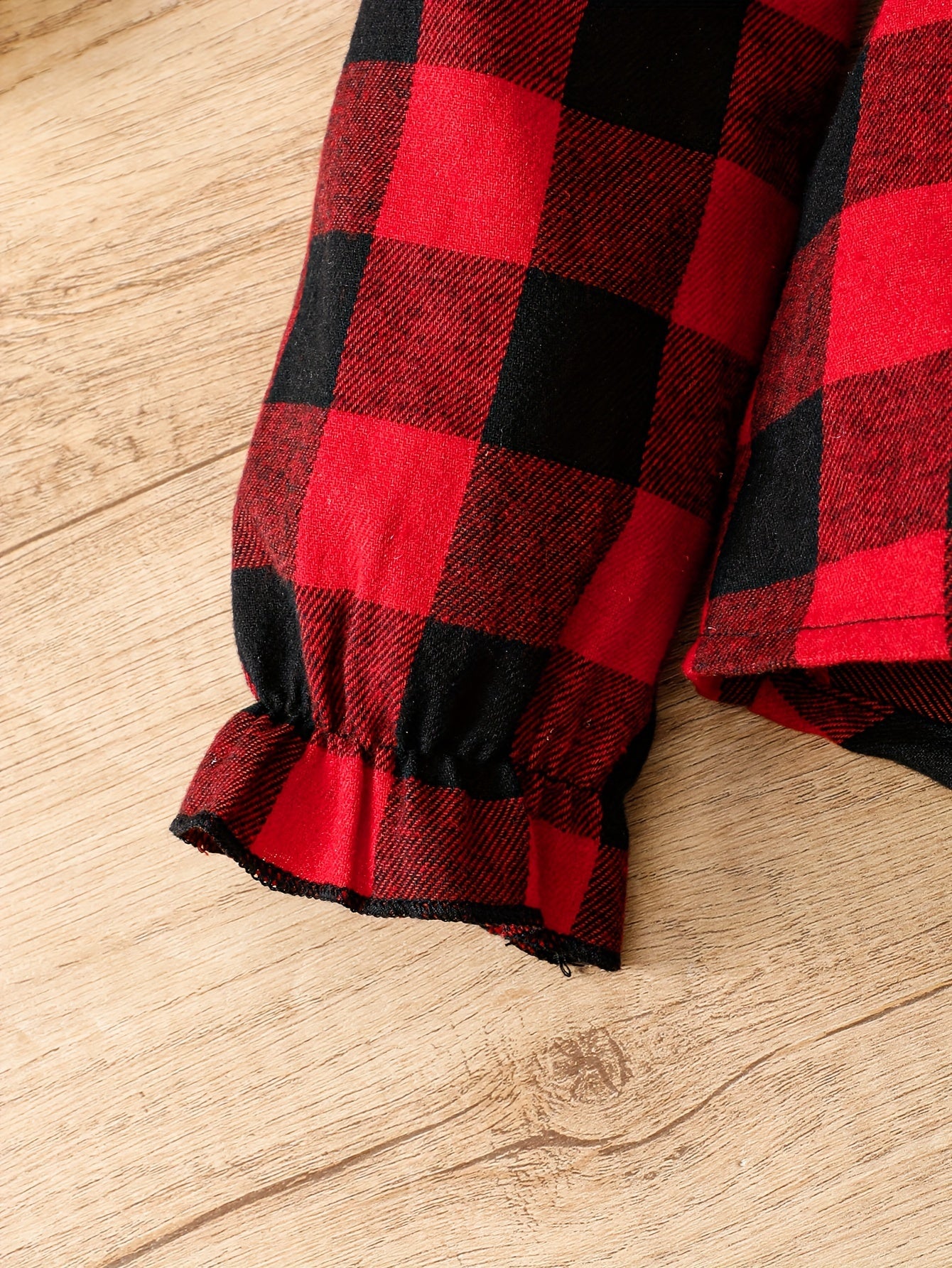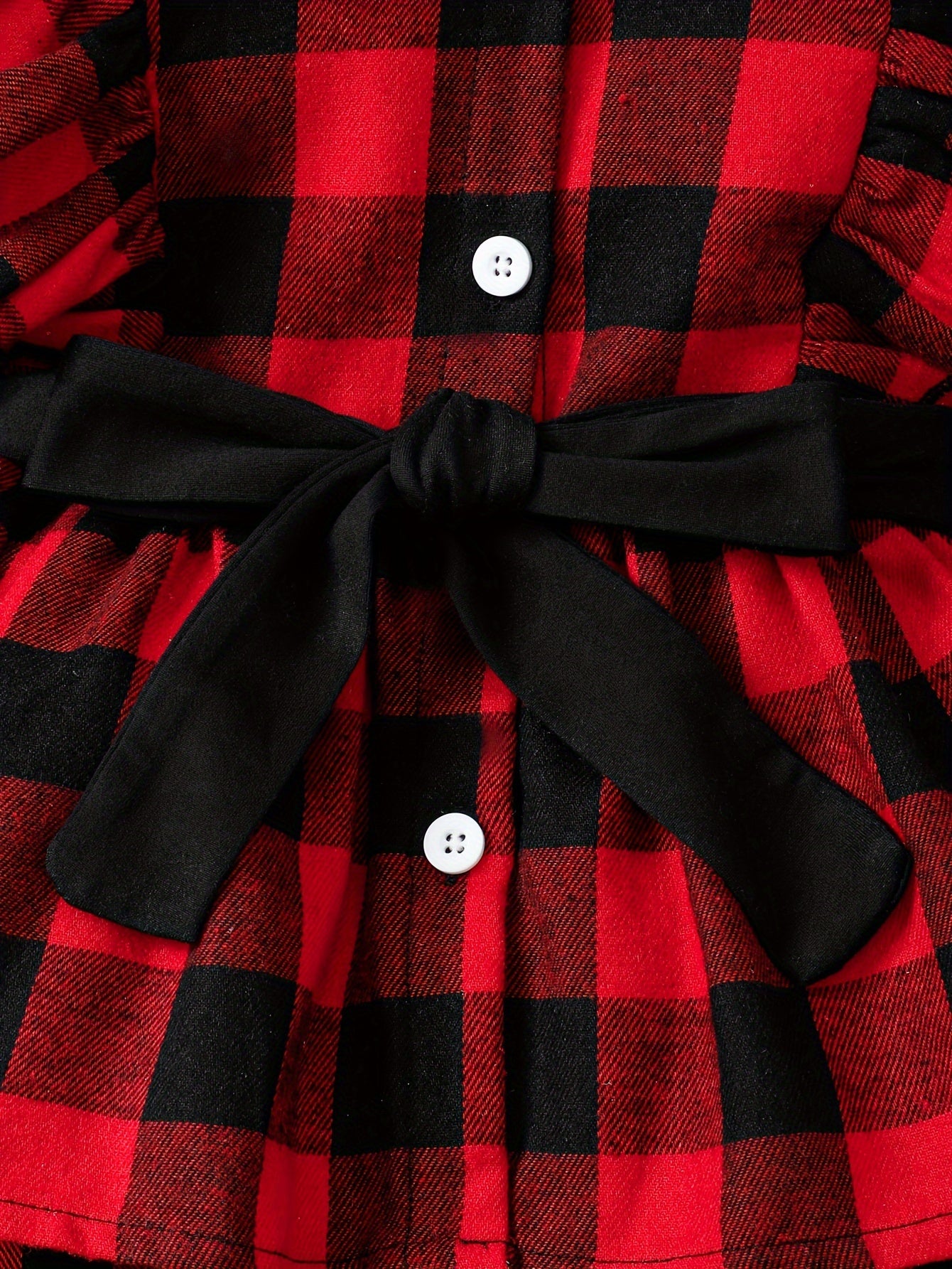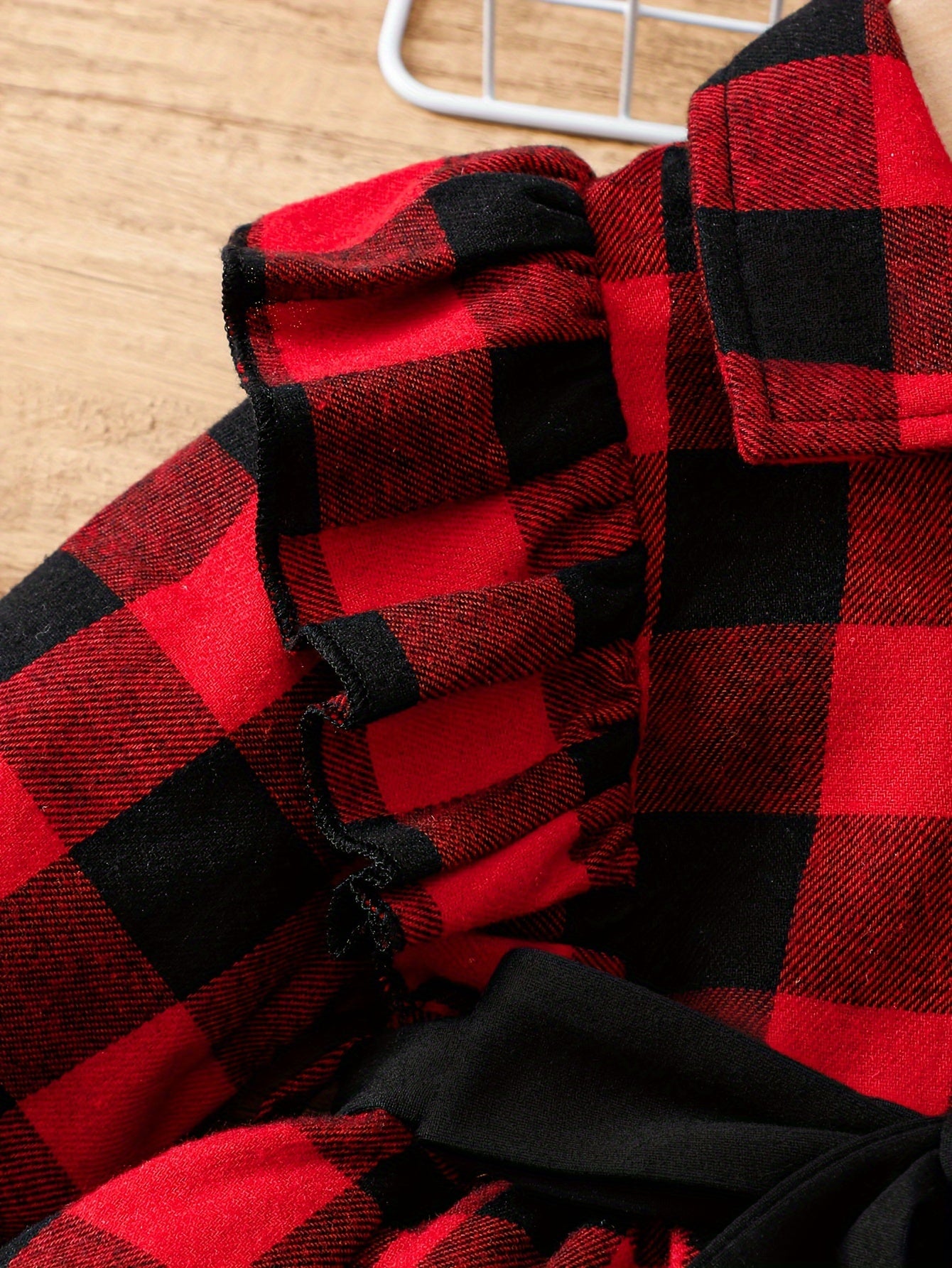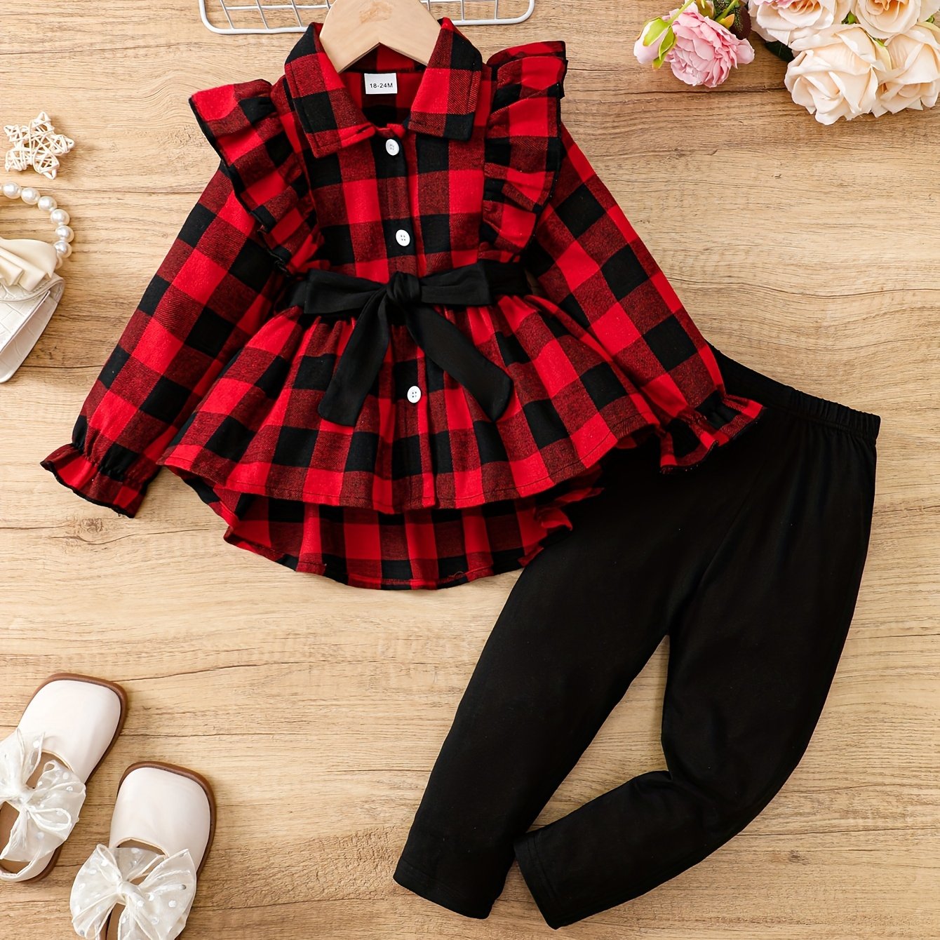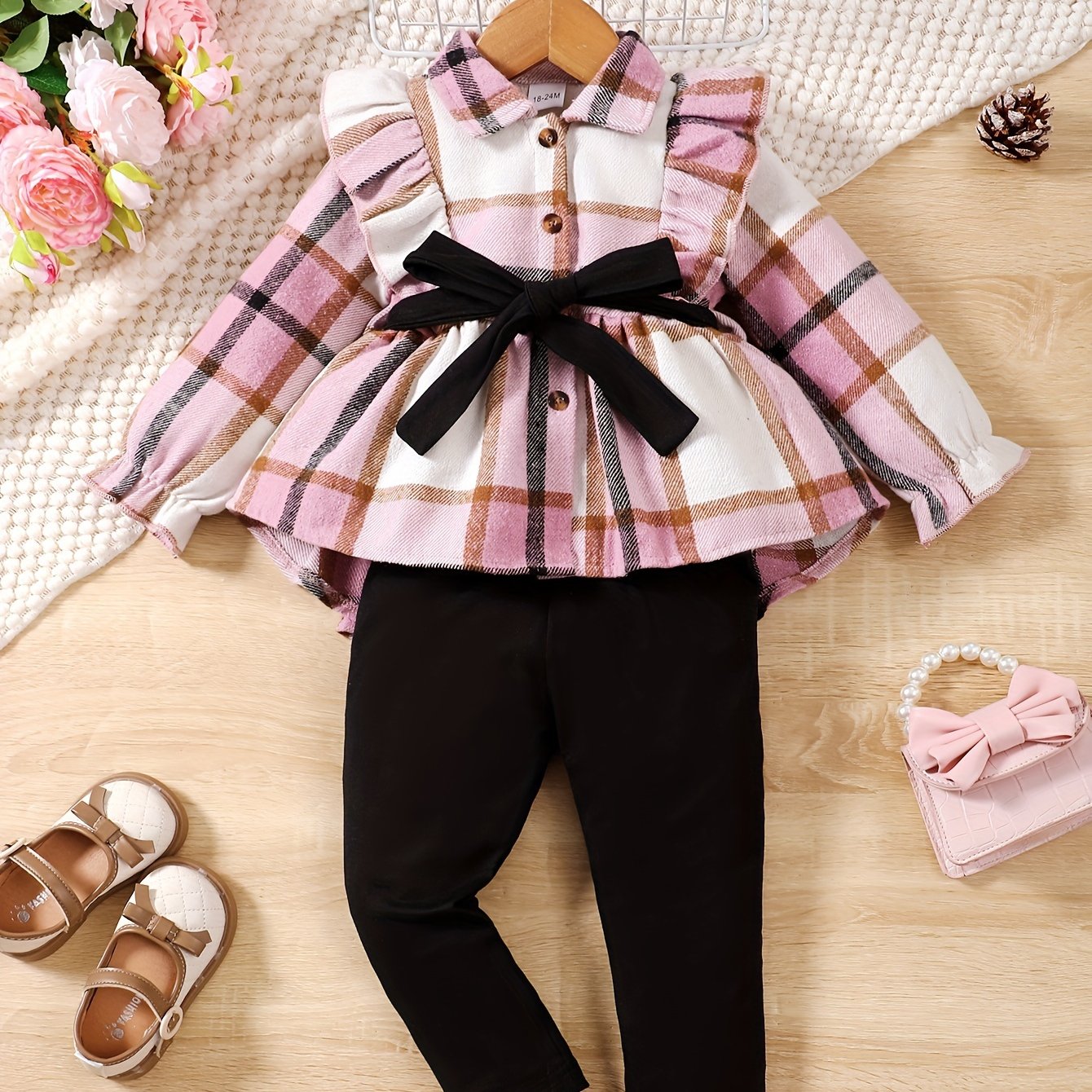 Детский комплект: рюшевая блузка в клетку и брюки с ремнем для весенне-осенней прогулочной одежды