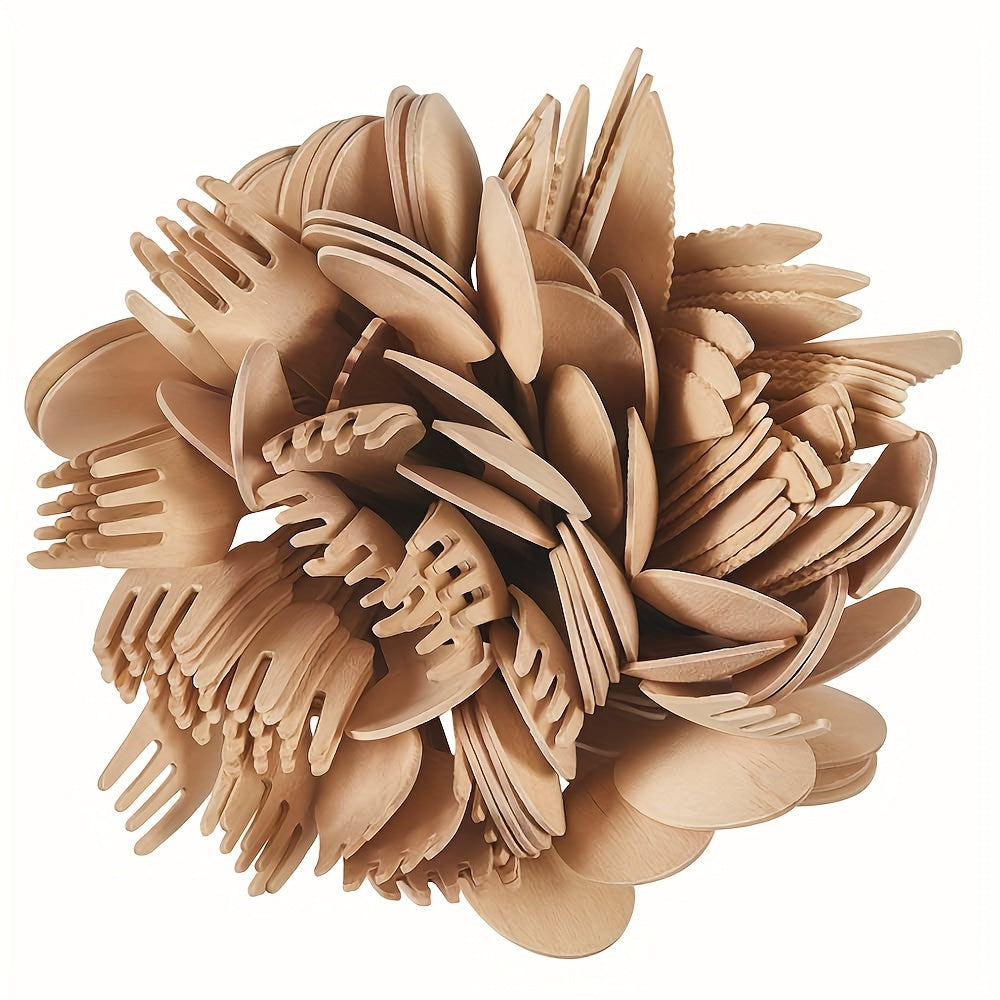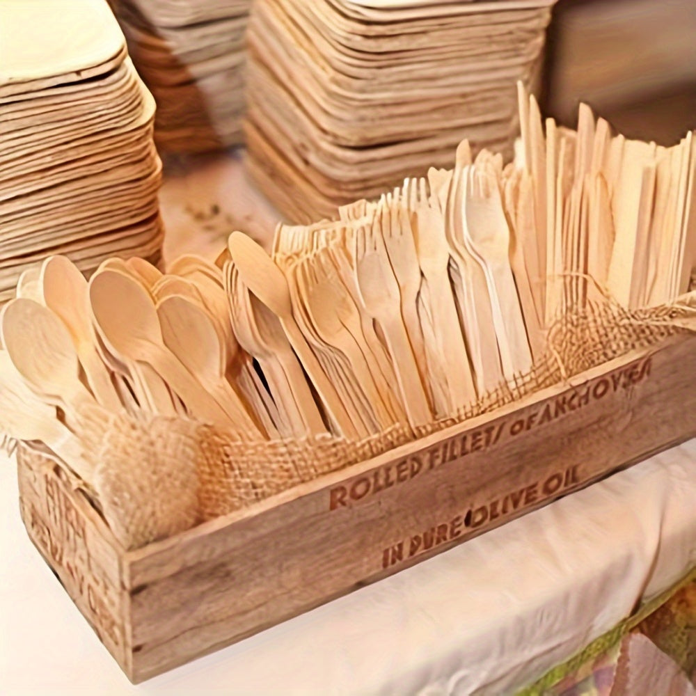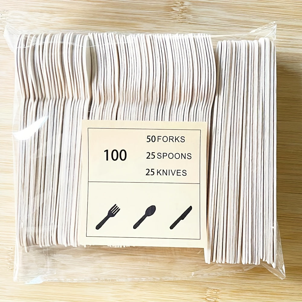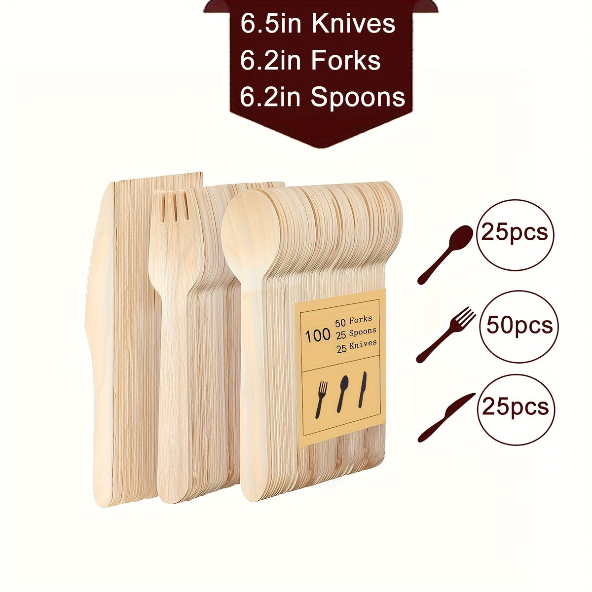 Набор одноразовых столовых приборов из бамбука и дерева (100 предметов - 50 вилок, 25 ложек, 25 ножей). Идеально подходит для свадебных вечеринок, кемпинга на открытом воздухе и мероприятий общественного питания.