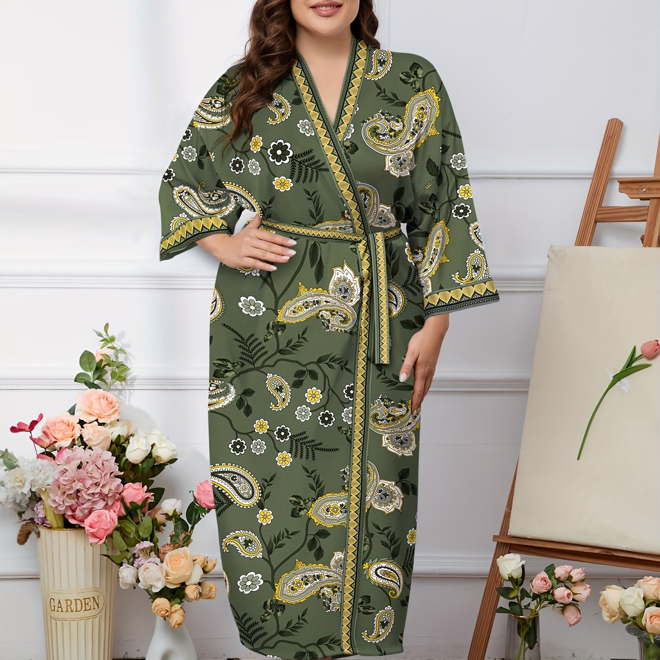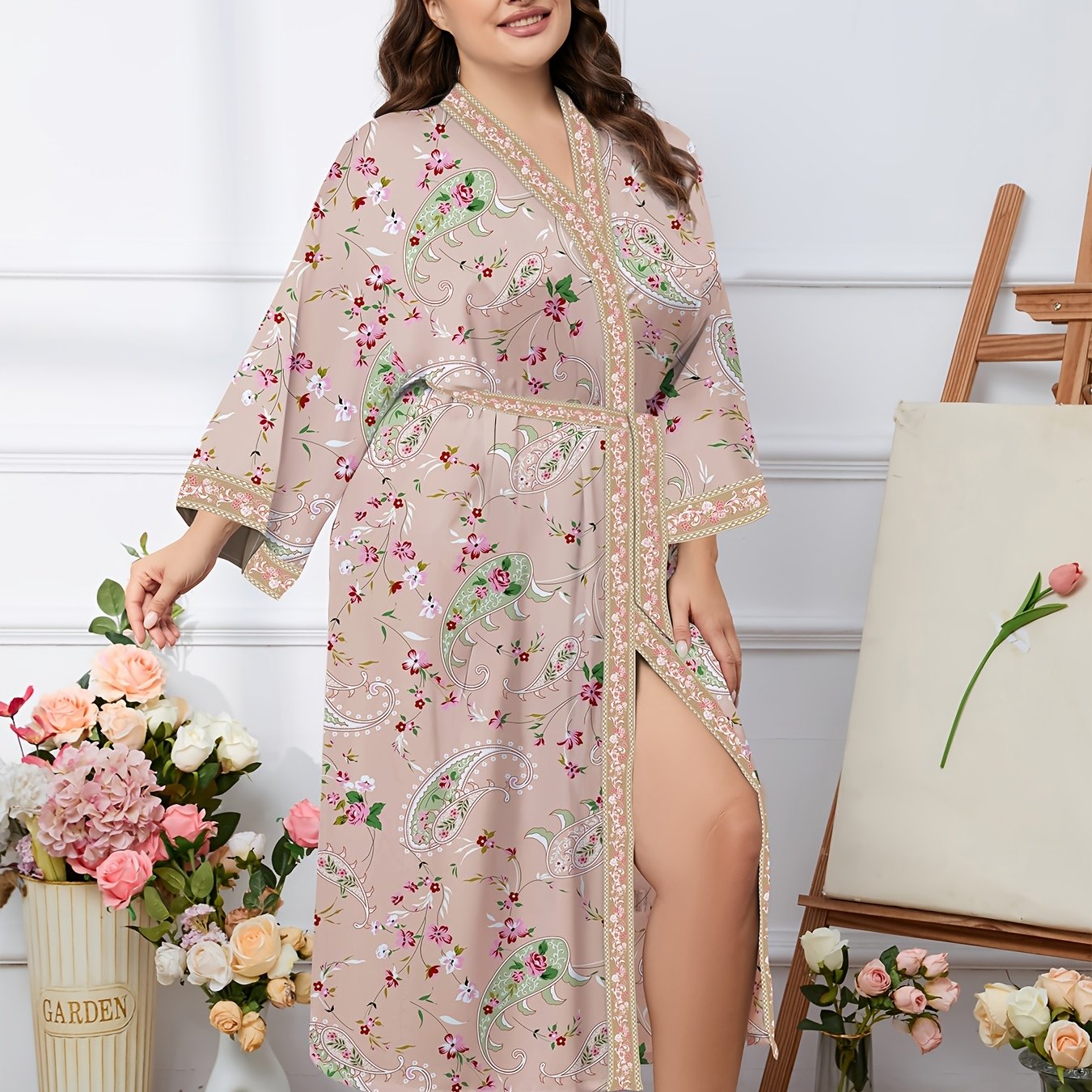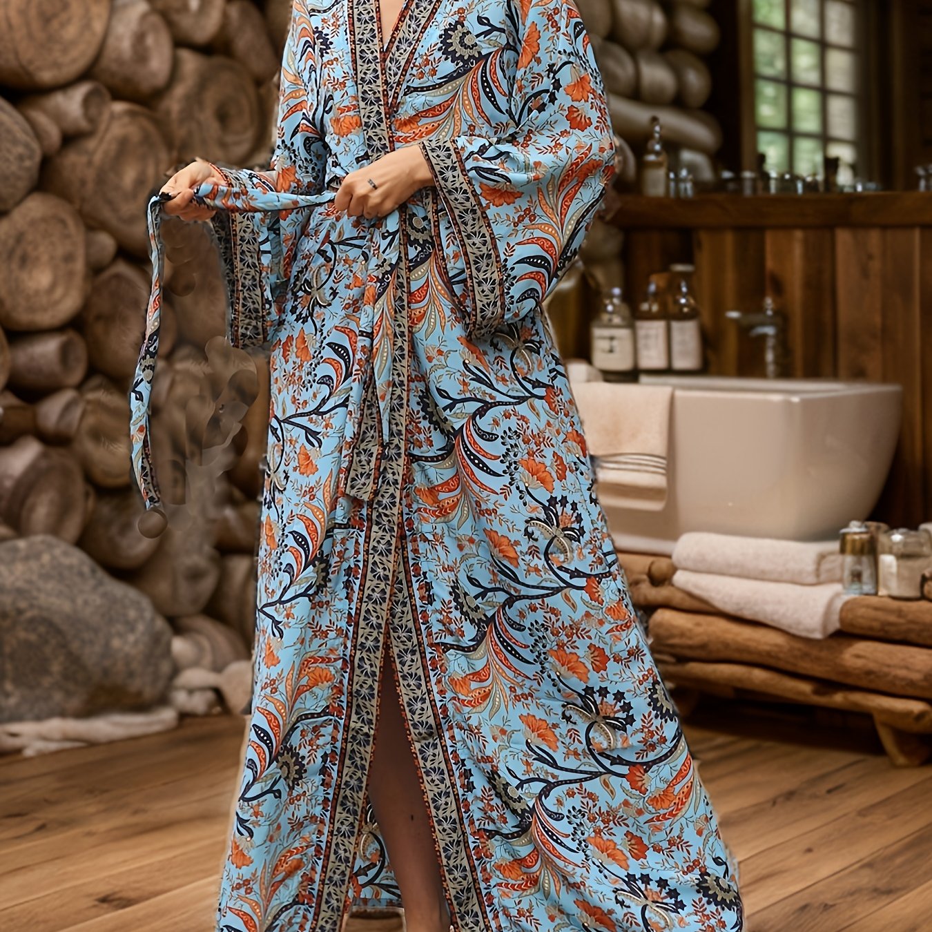 Плюс сайз бохо длинное платье с полным принтом, V-образным вырезом, завязками на талии для весны, лета, осени