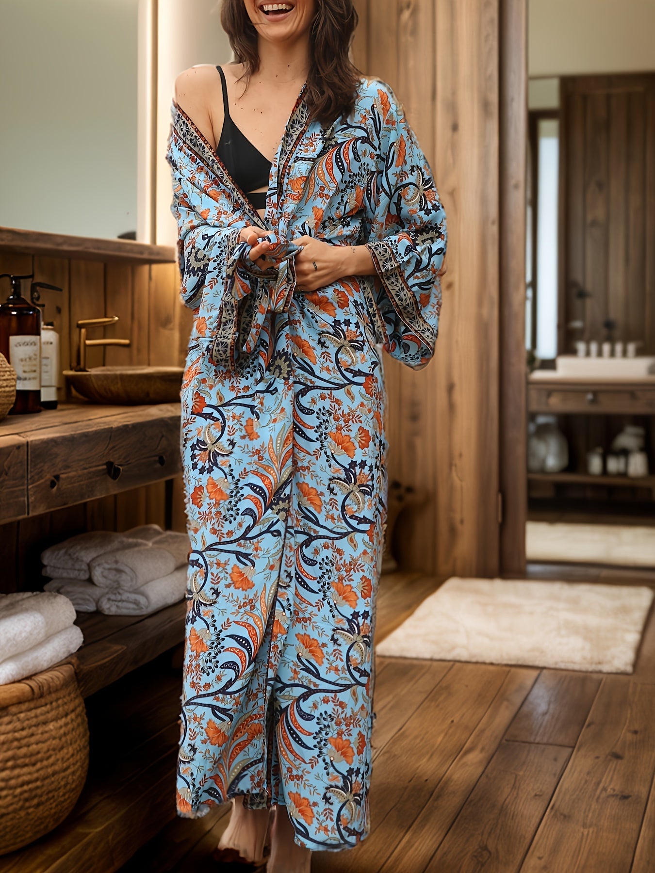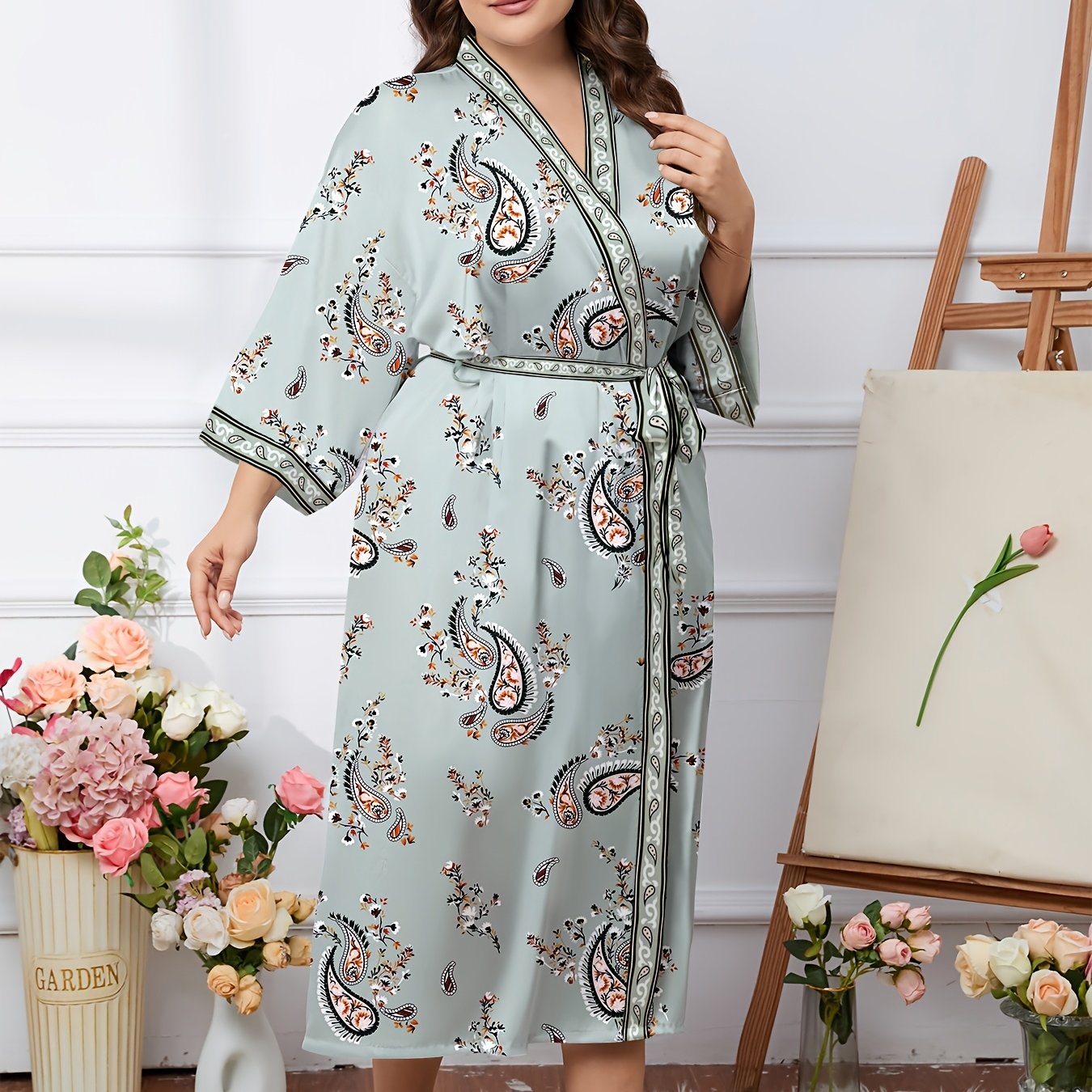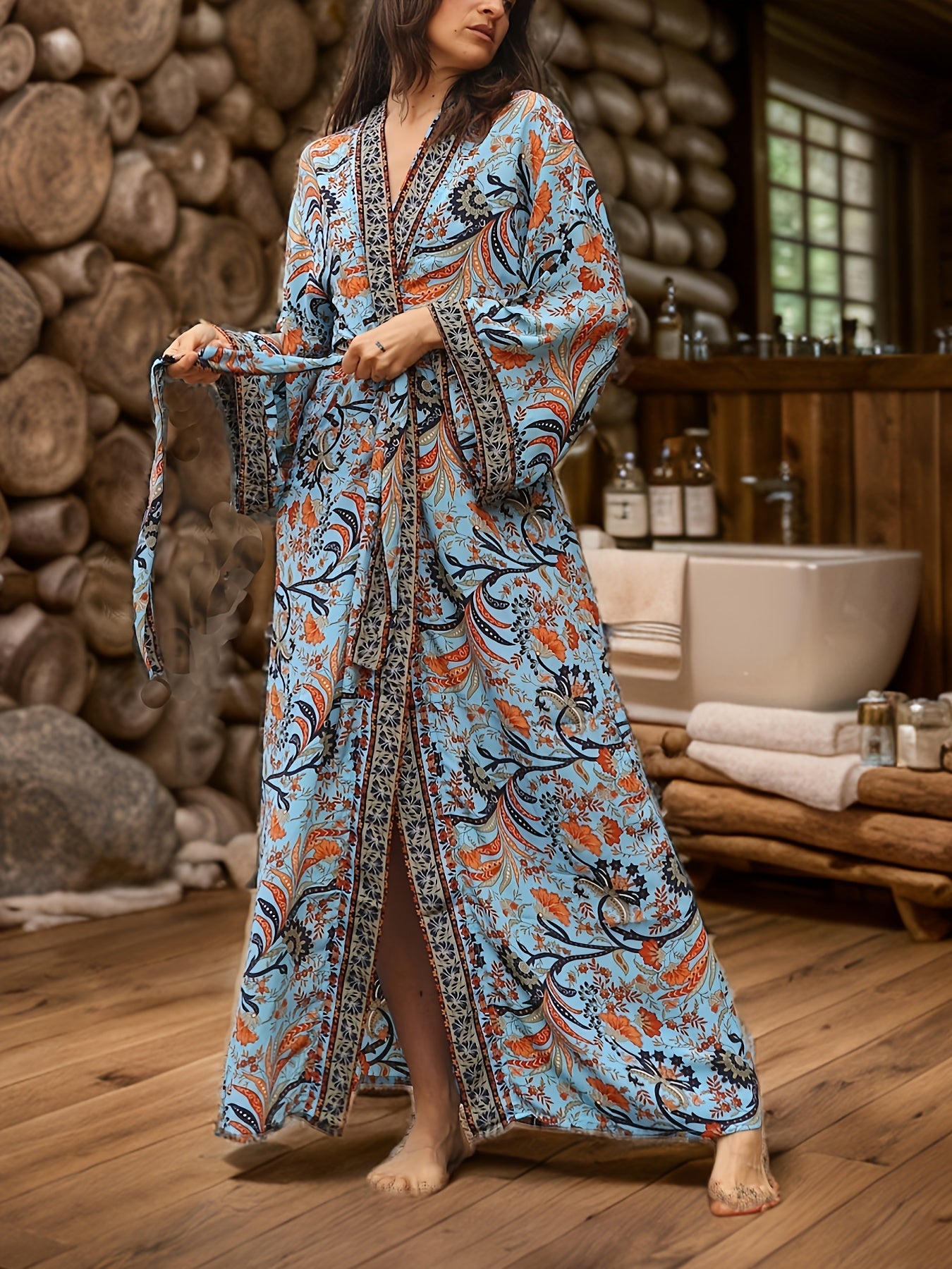 Плюс сайз бохо длинное платье с полным принтом, V-образным вырезом, завязками на талии для весны, лета, осени