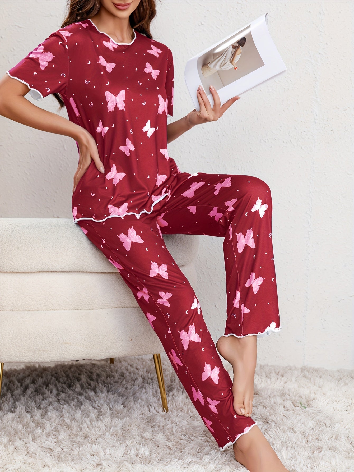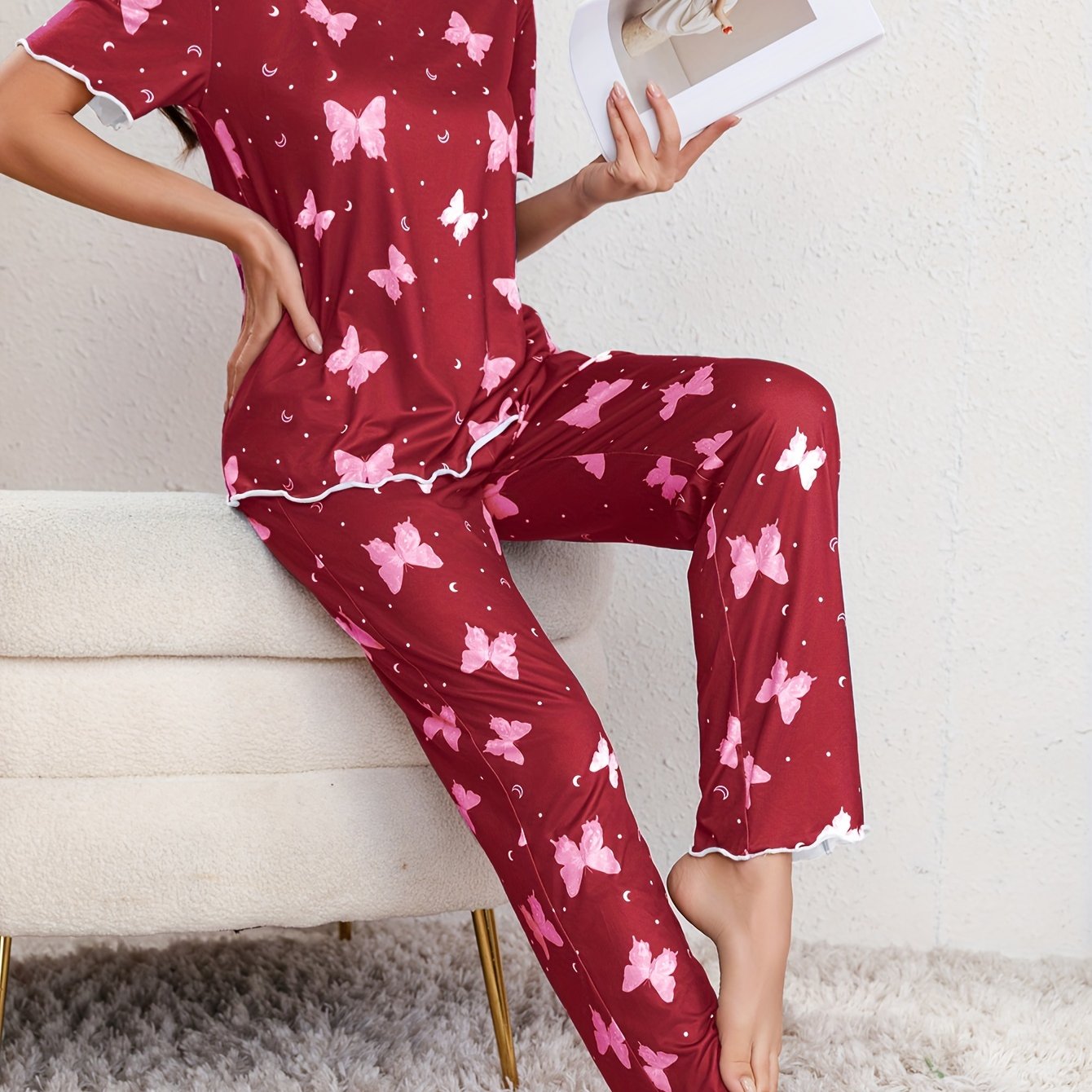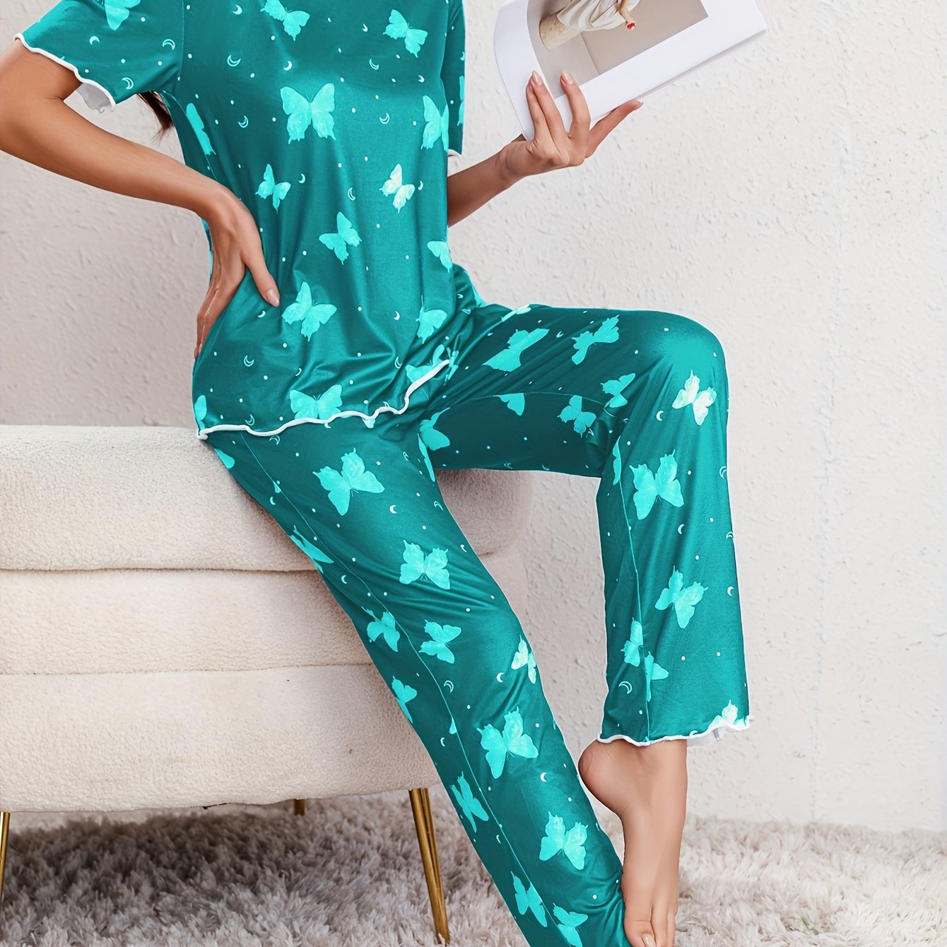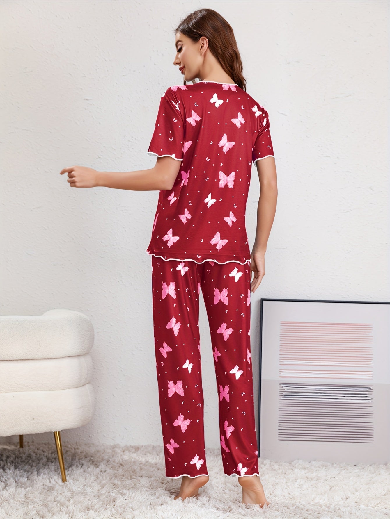 Комплект для отдыха с принтом бабочек для женщин с отделкой из рифленого края, коротким рукавом и брюками.