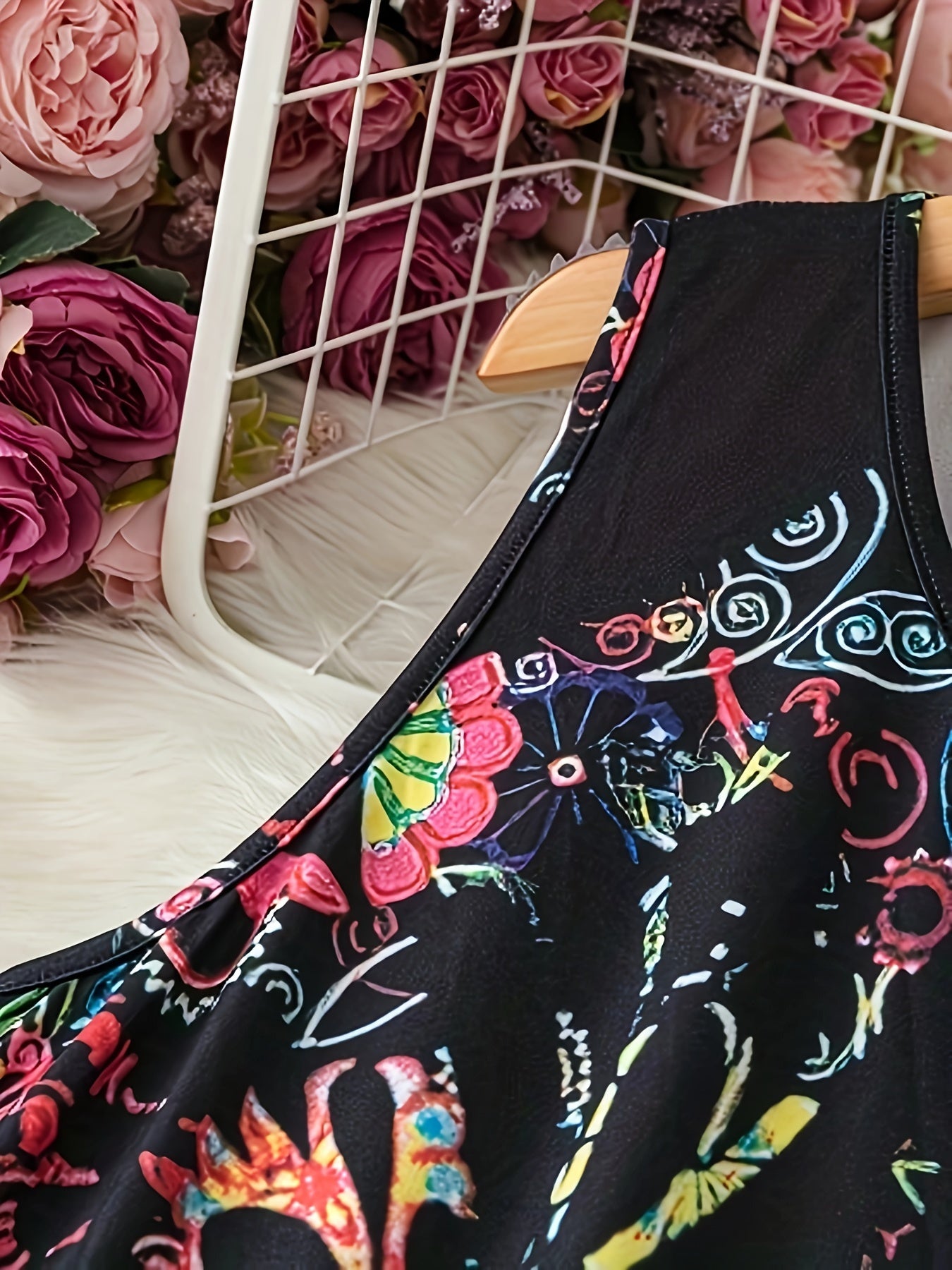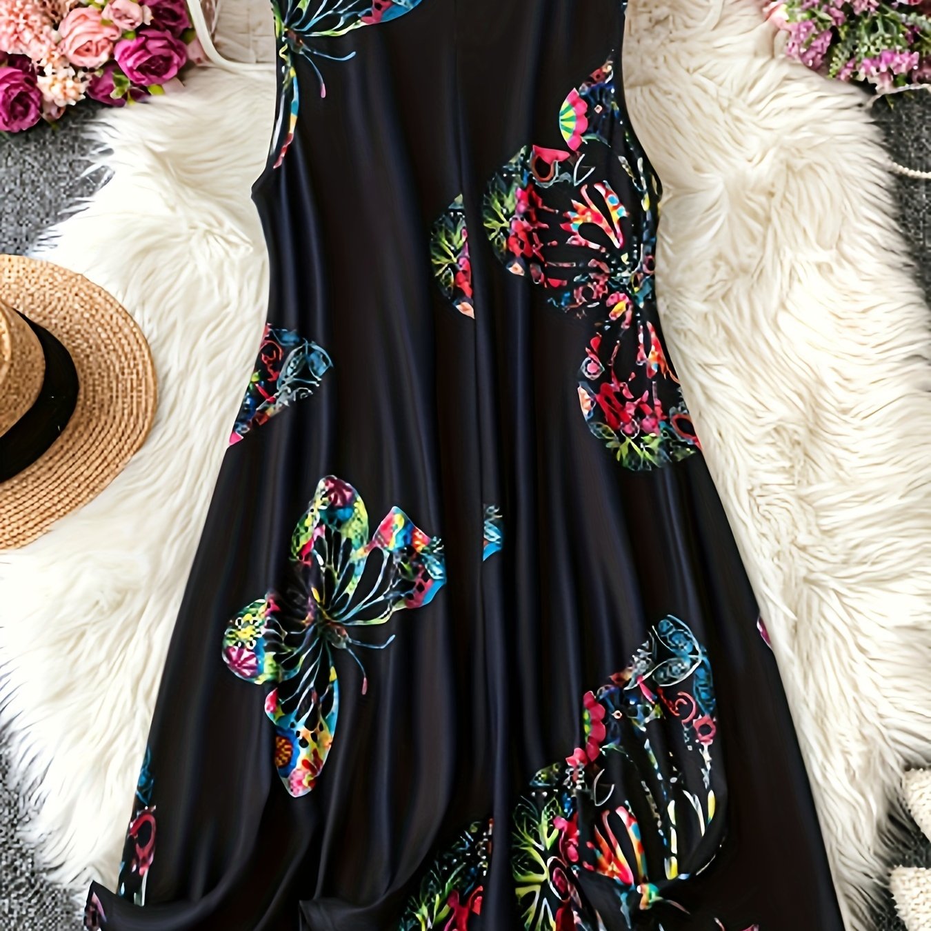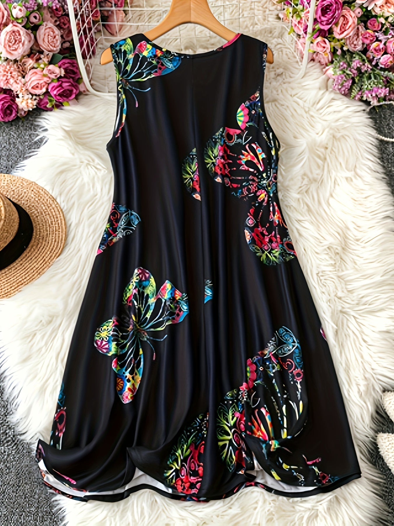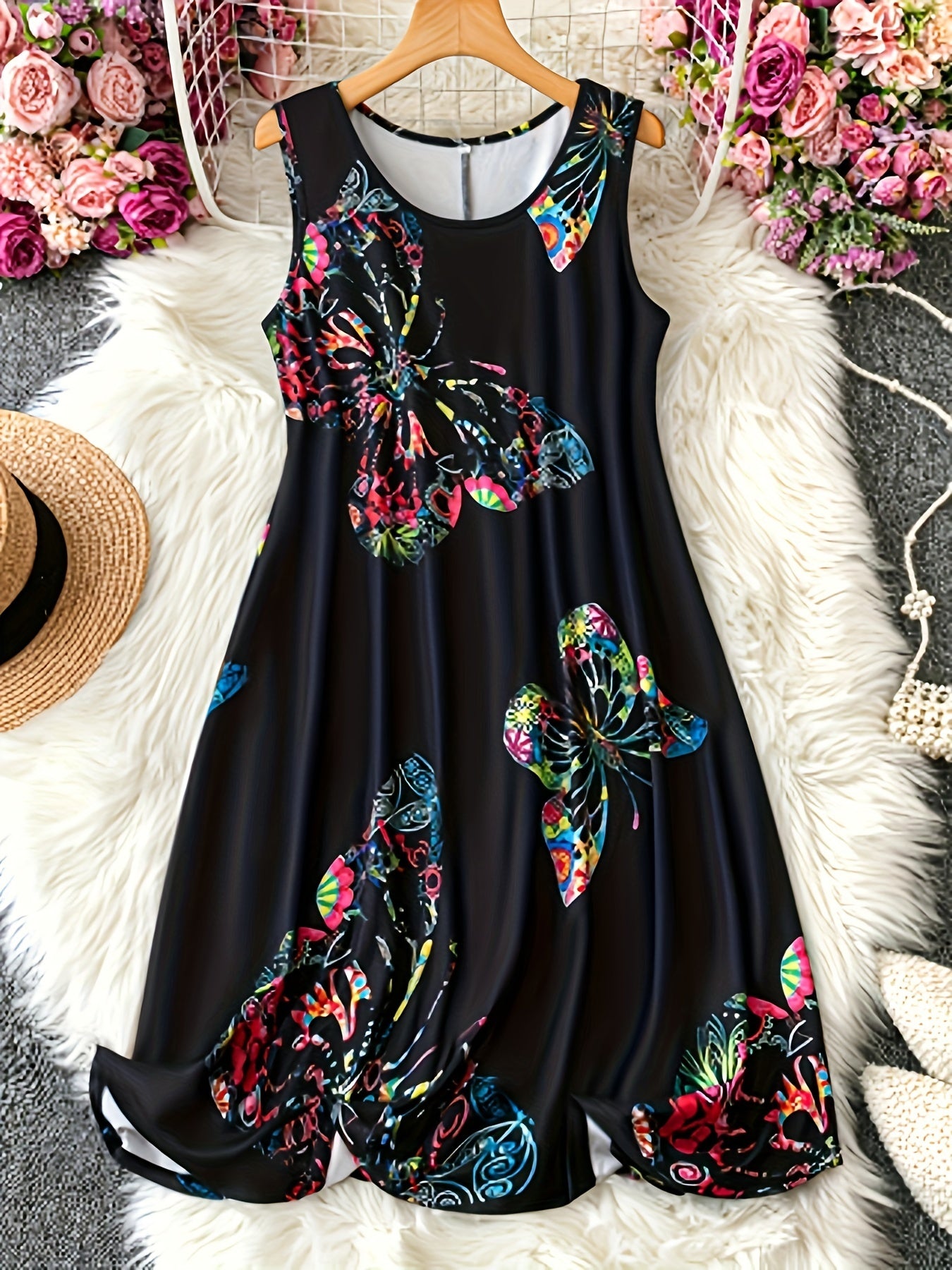 Летний платье-майка с бабочками и круглым вырезом, средняя эластичность, полиэстеровая вязка