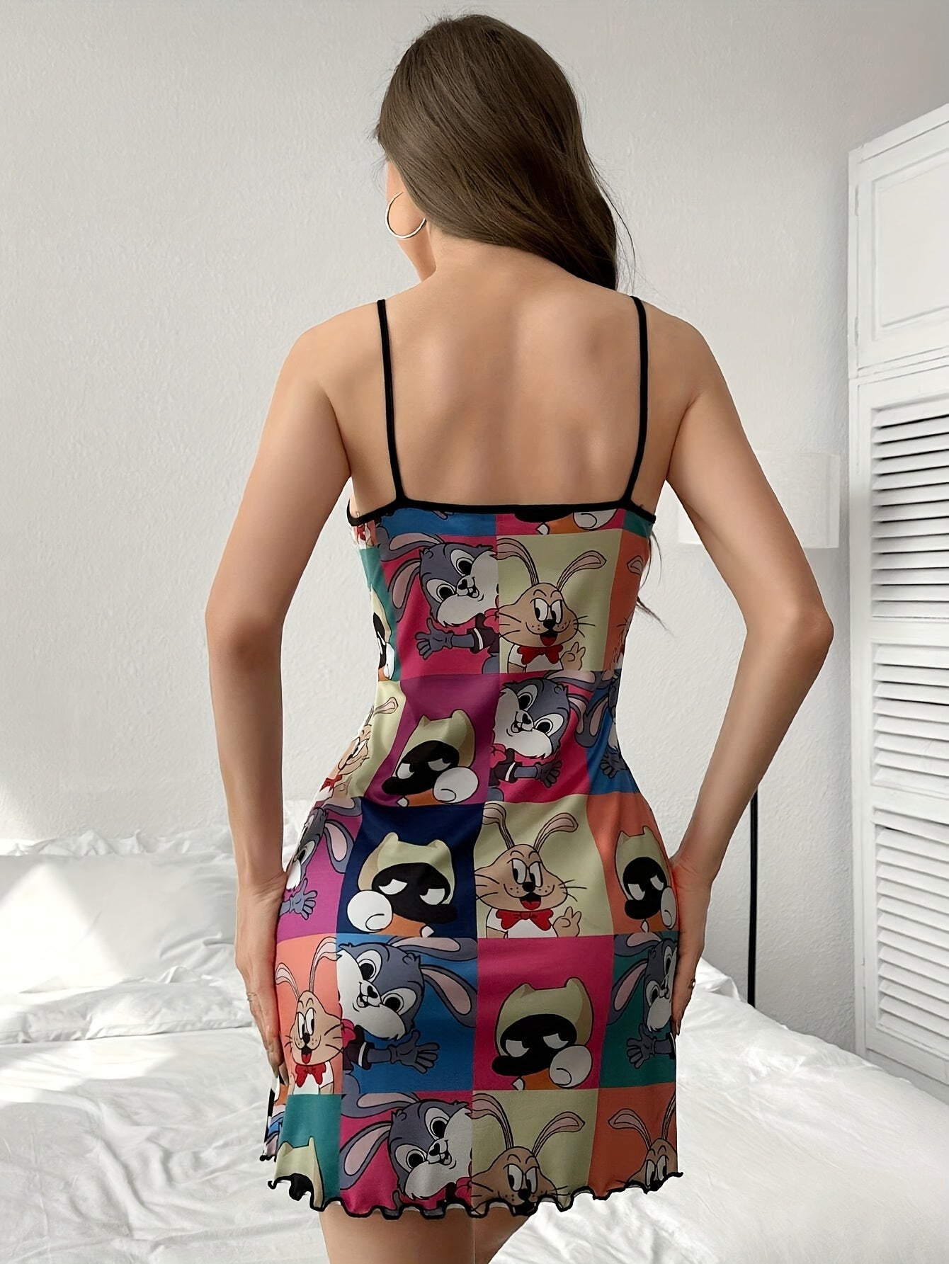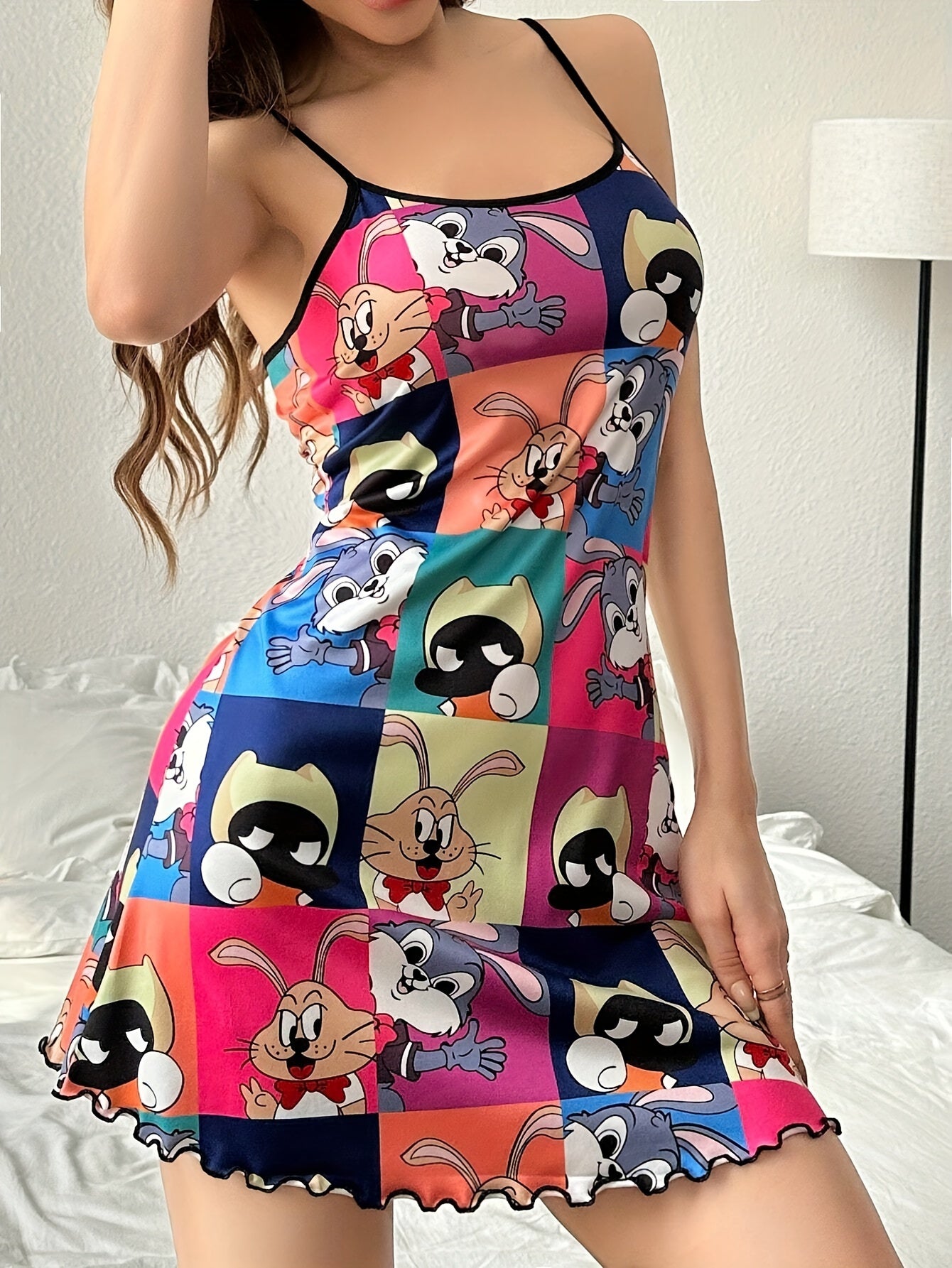Ночная сорочка с мультяшным принтом, без спинки и с рюшами, идеально подходит для женского ночного белья.