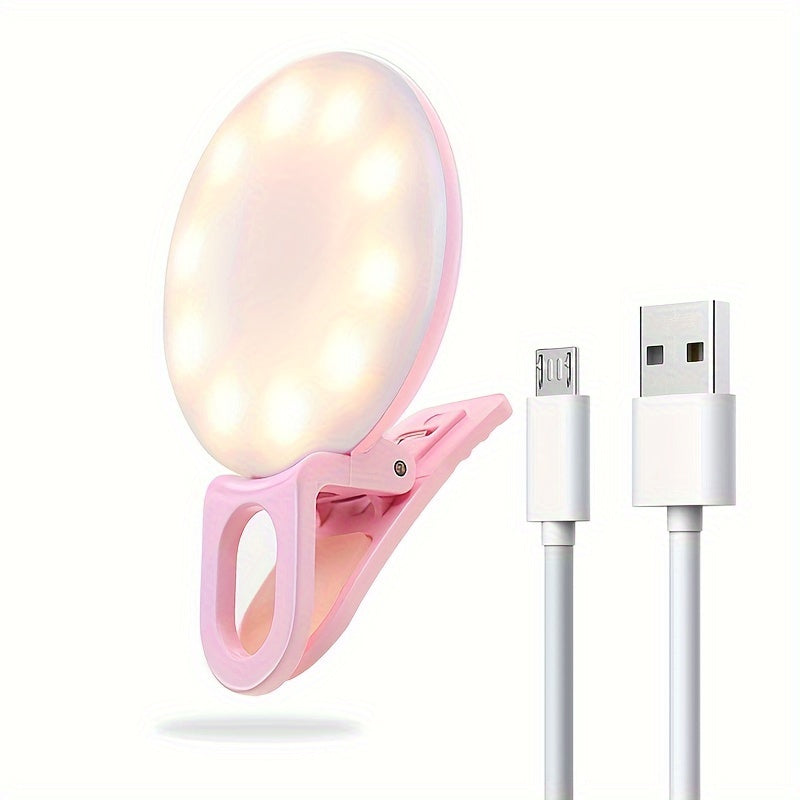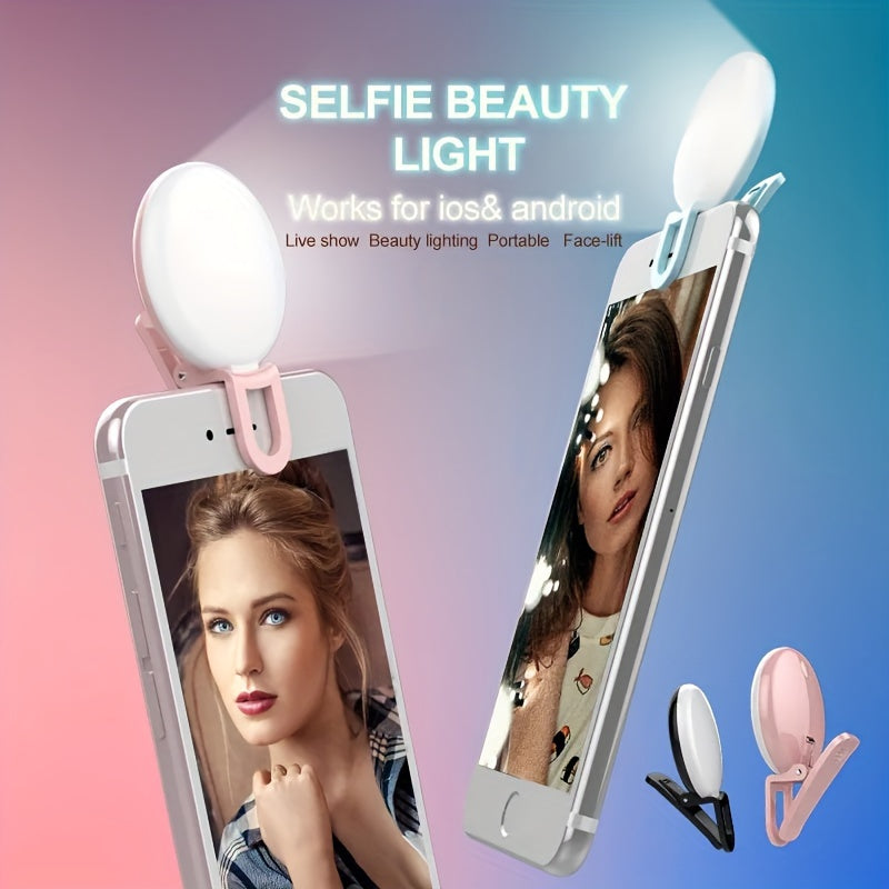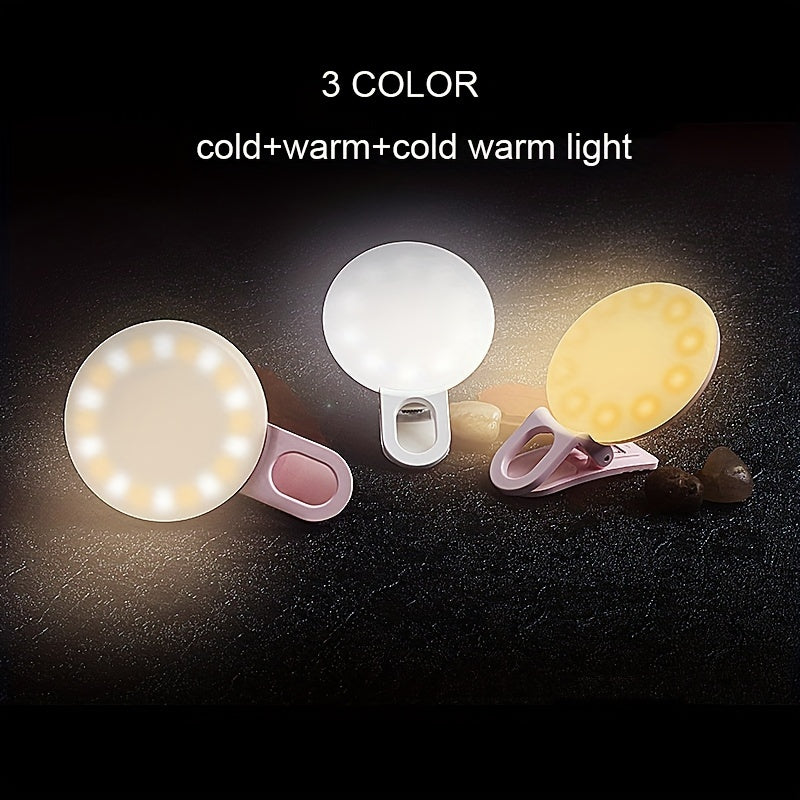 Клипсовый профессиональный светодиодный кольцевой свет с 3 цветовыми режимами для селфи на смартфоне, с теплыми и белыми световыми опциями.
