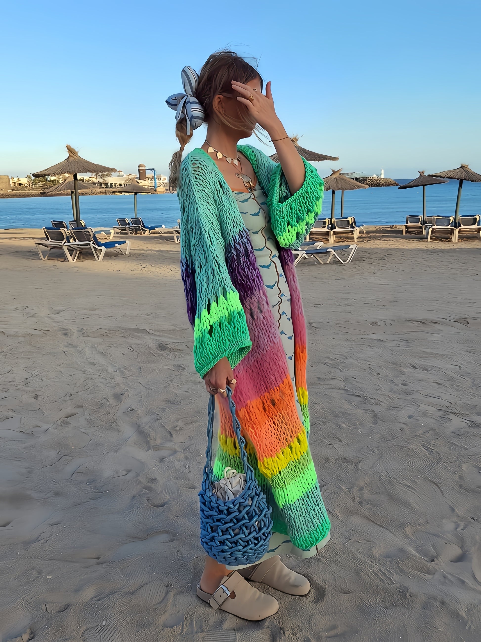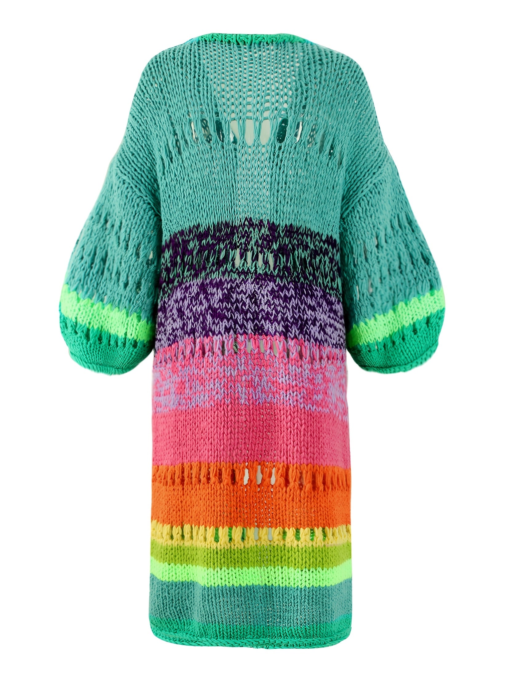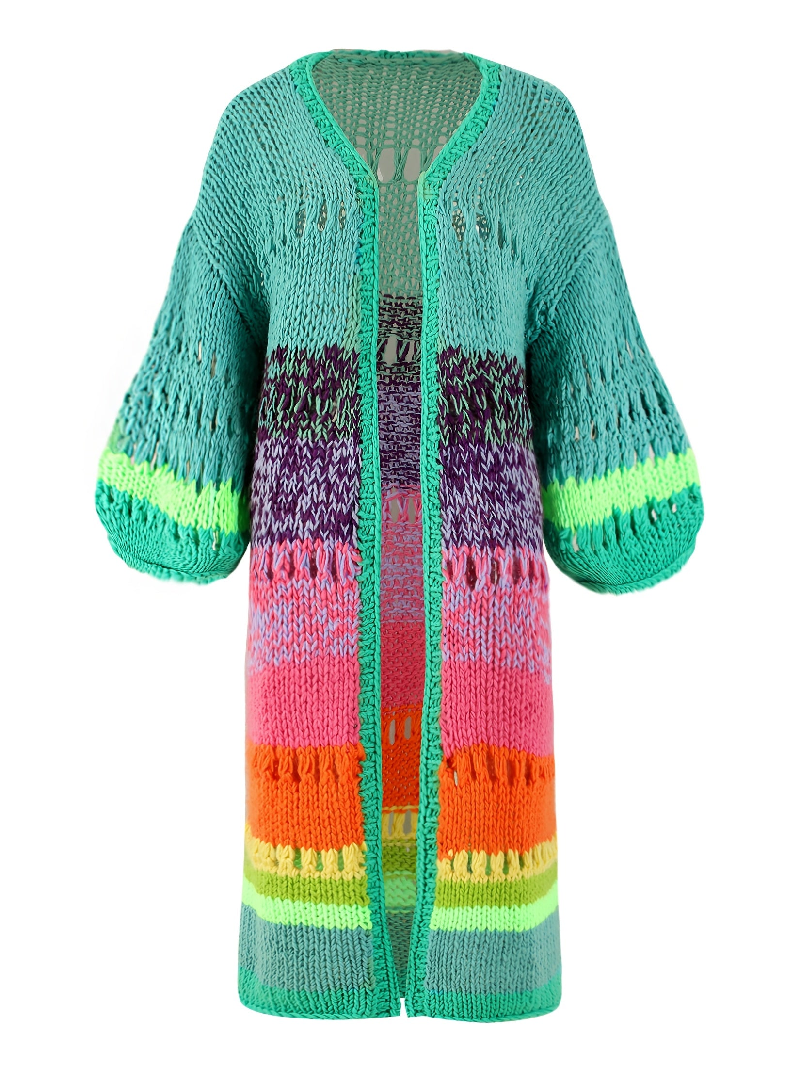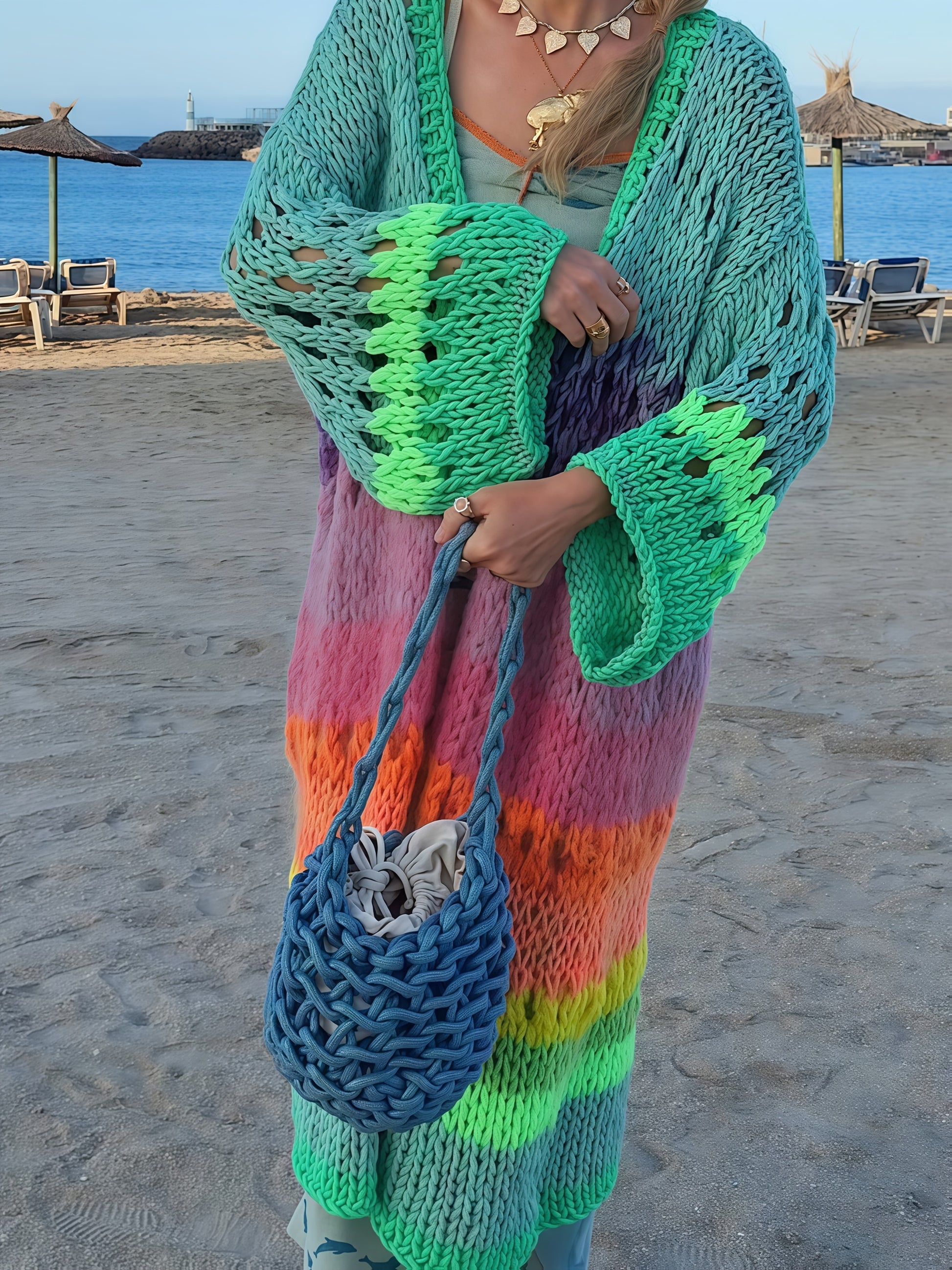 Яркое вязаное вручную женское пальто с градиентными яркими цветами, ретро фонариками и лентами. Шикарный и модный бохо стиль.