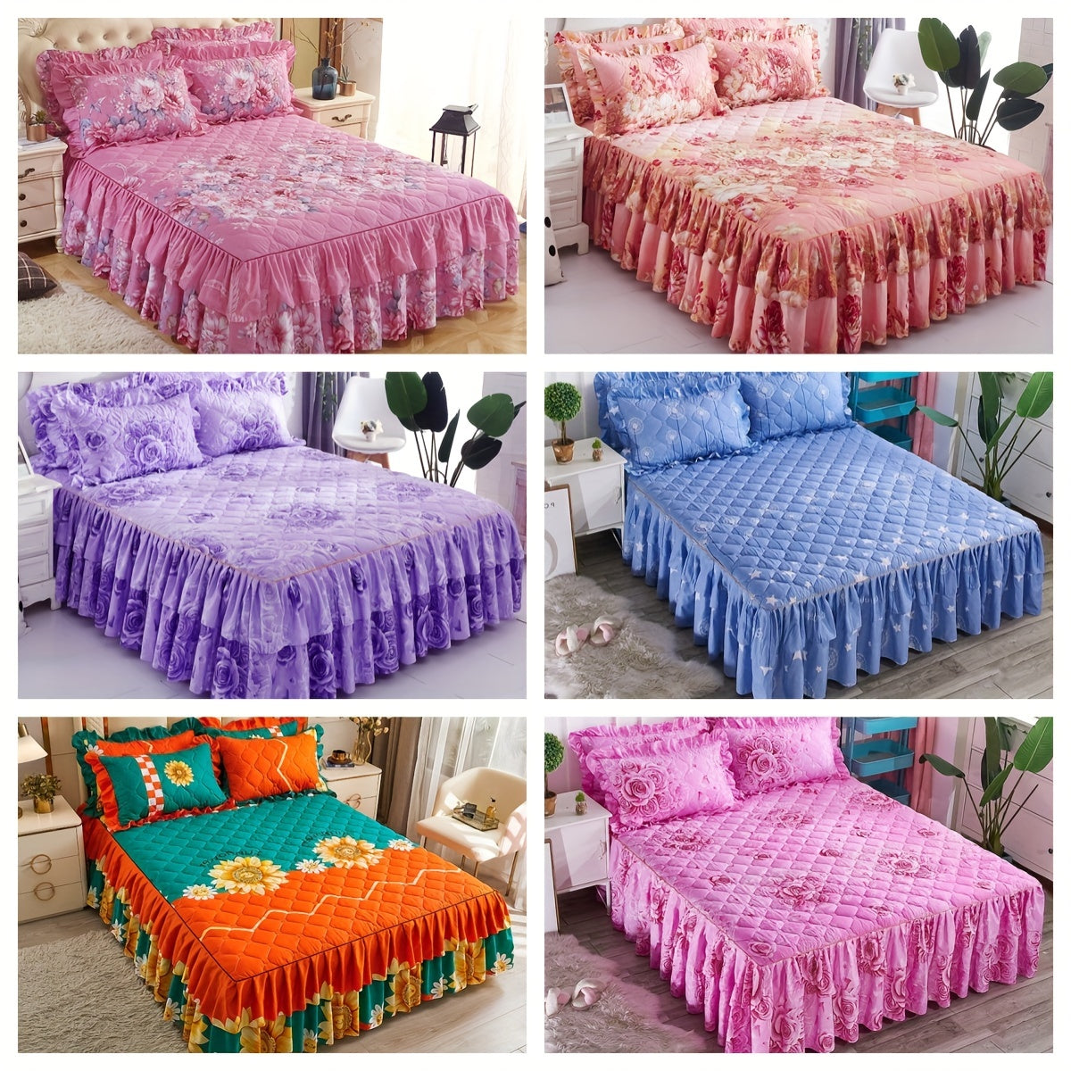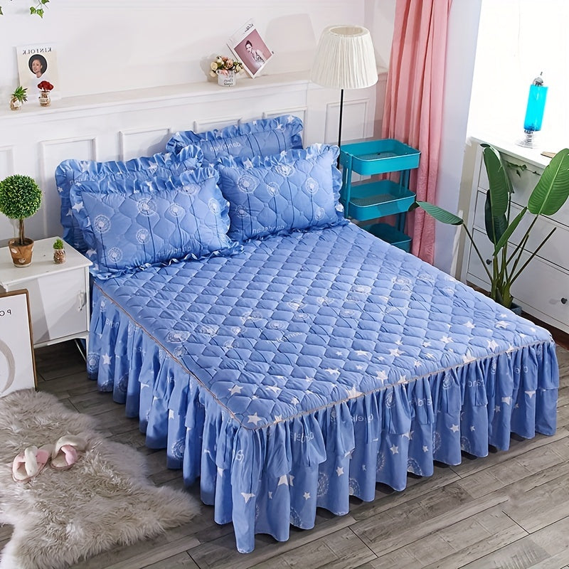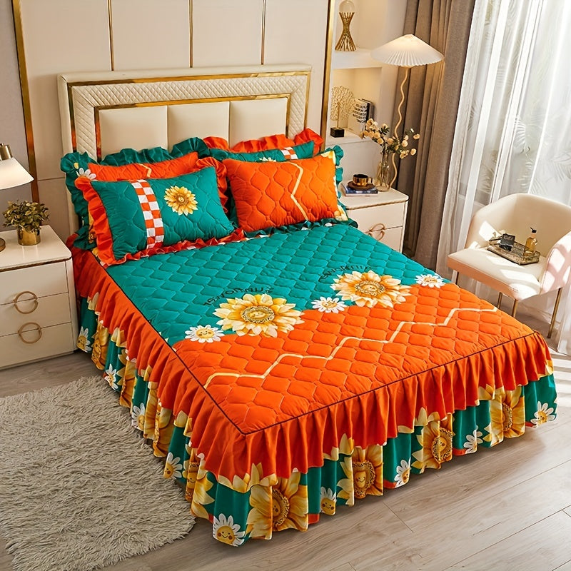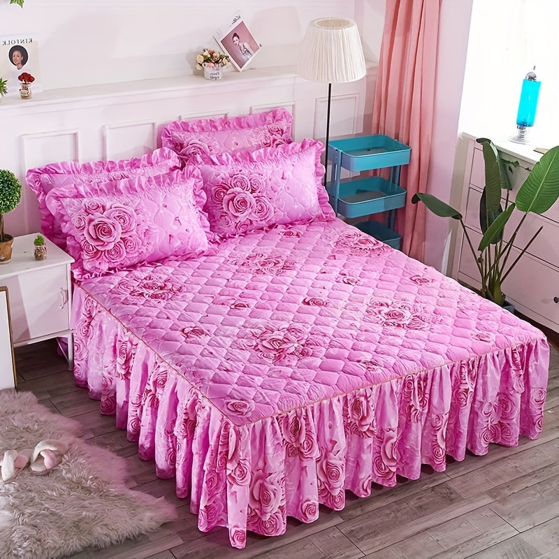 Современный цветочный комплект юбки для кровати, включает 3 предмета, можно стирать в машине, дружелюбный к коже двуслойный защитный чехол для матраса с противоскользящей функцией. Изготовлен из тканого полиэстера с весом ткани 90 г.
