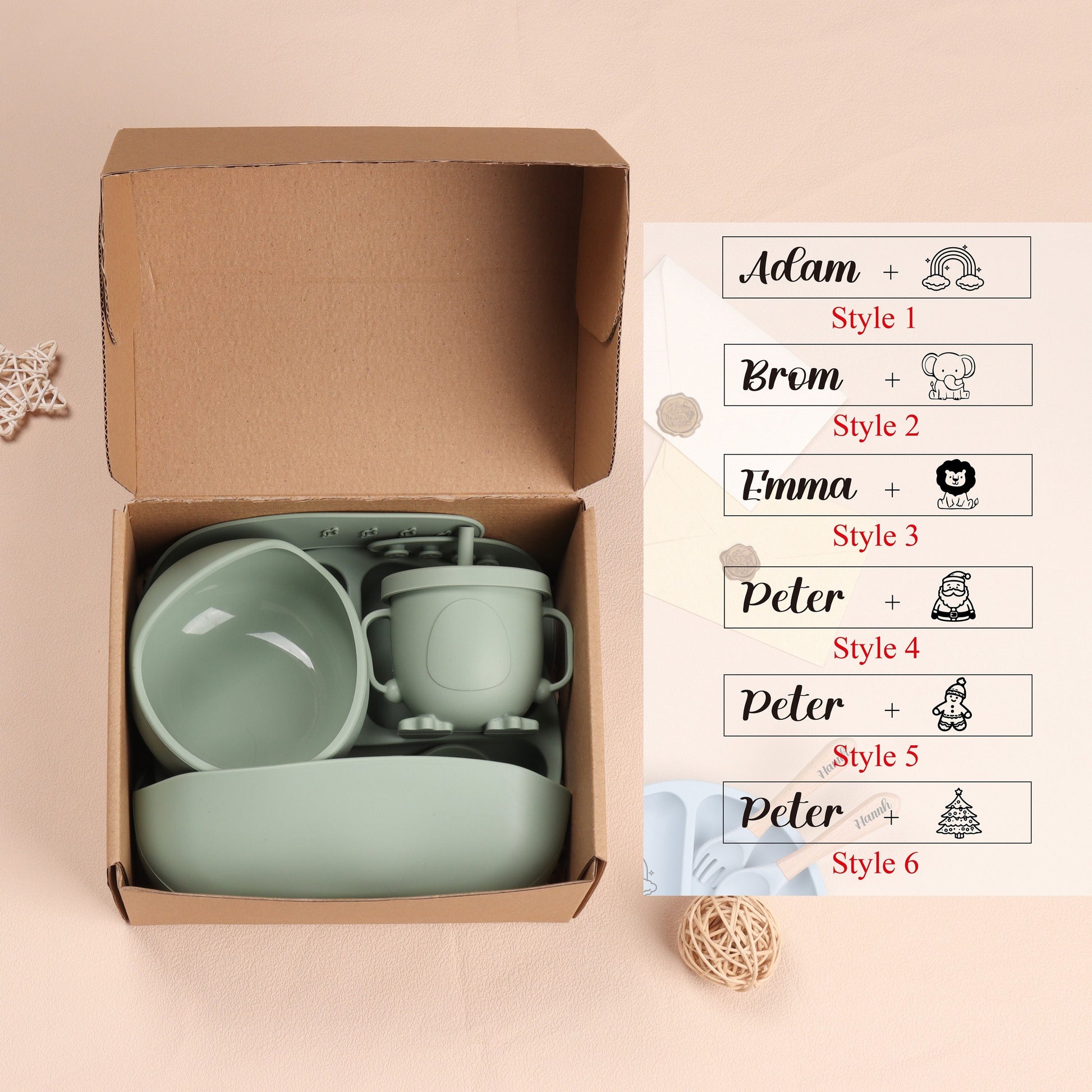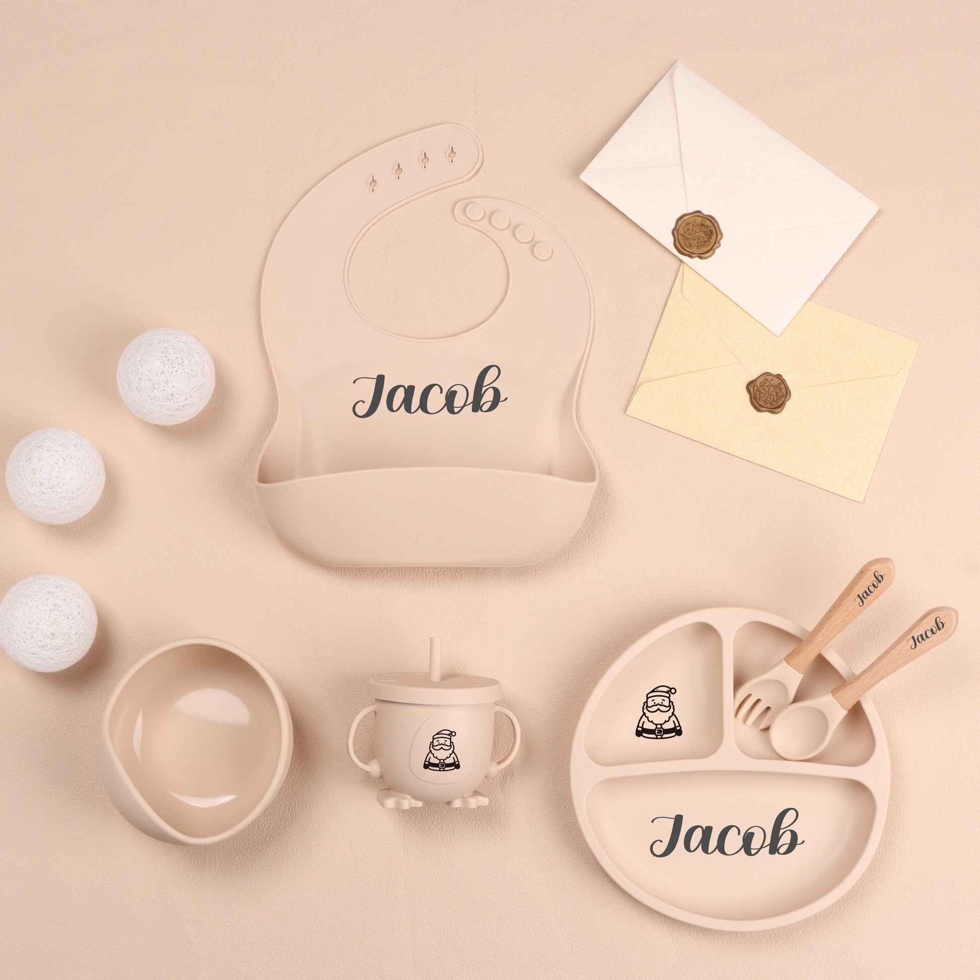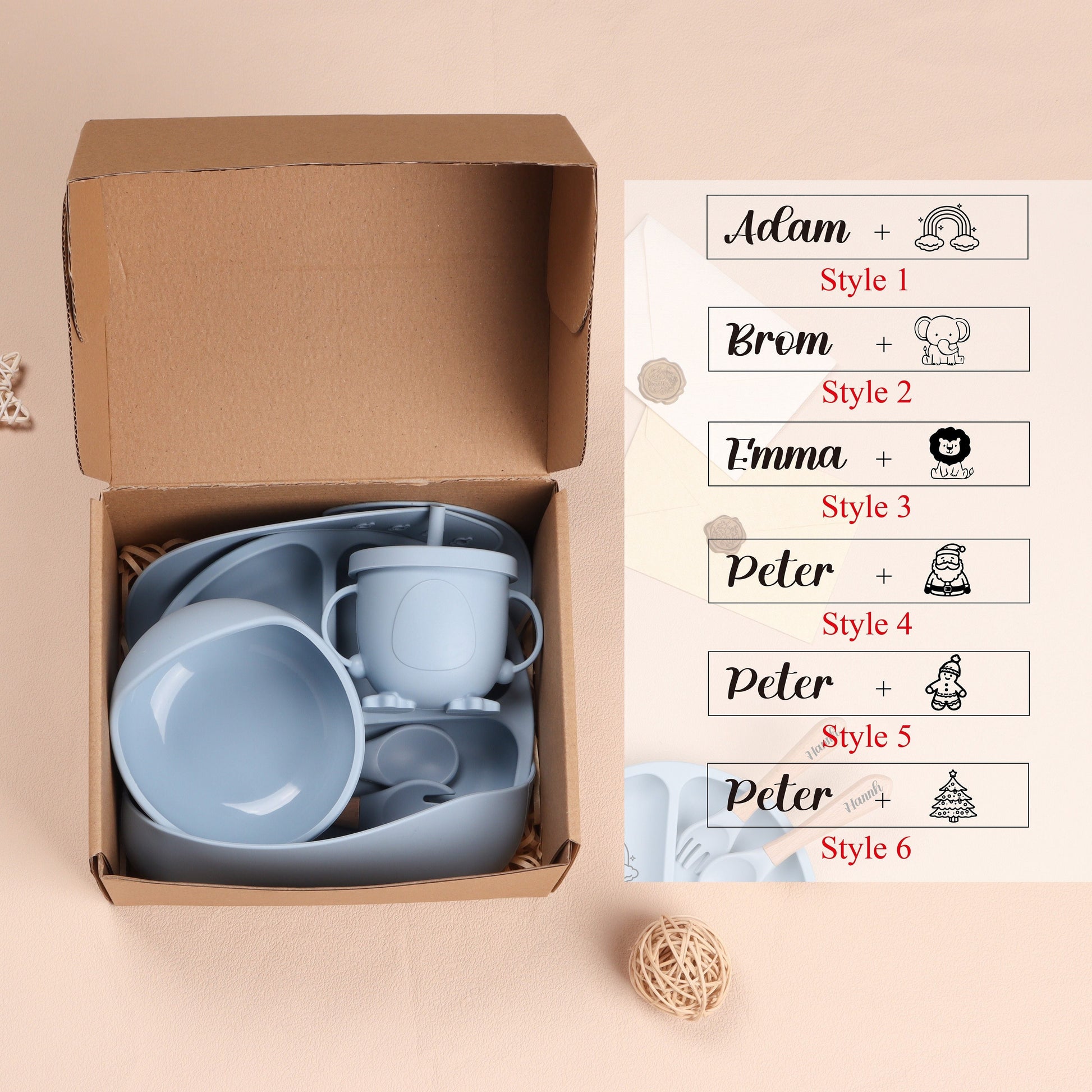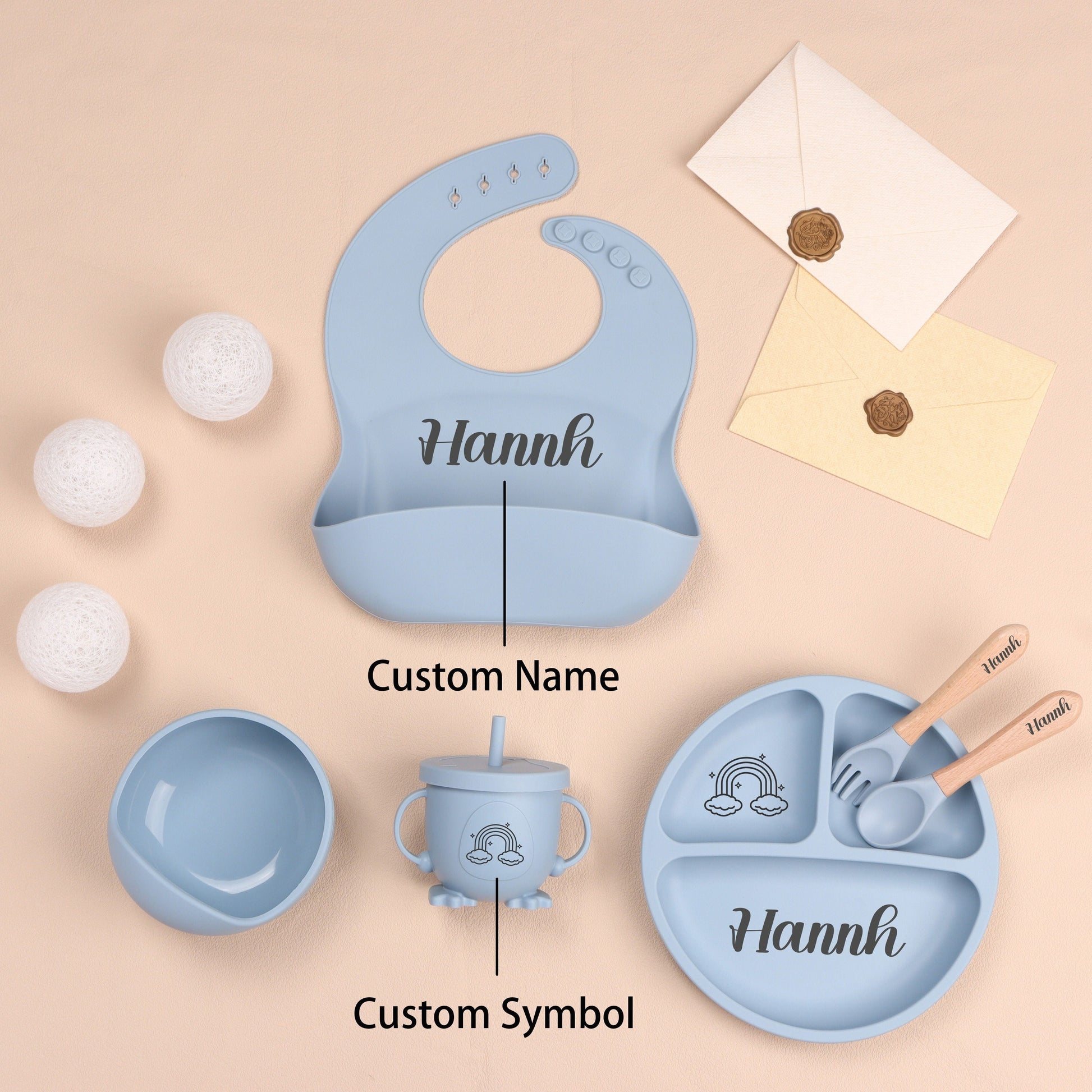 Индивидуальный силиконовый набор для кормления - персонализированный набор для отлучения от груди с именем ребенка, включая миску, чашку, слюнявчик, ложку и вилку - идеальный подарок на детский душ для детей в возрасте 3-6 лет