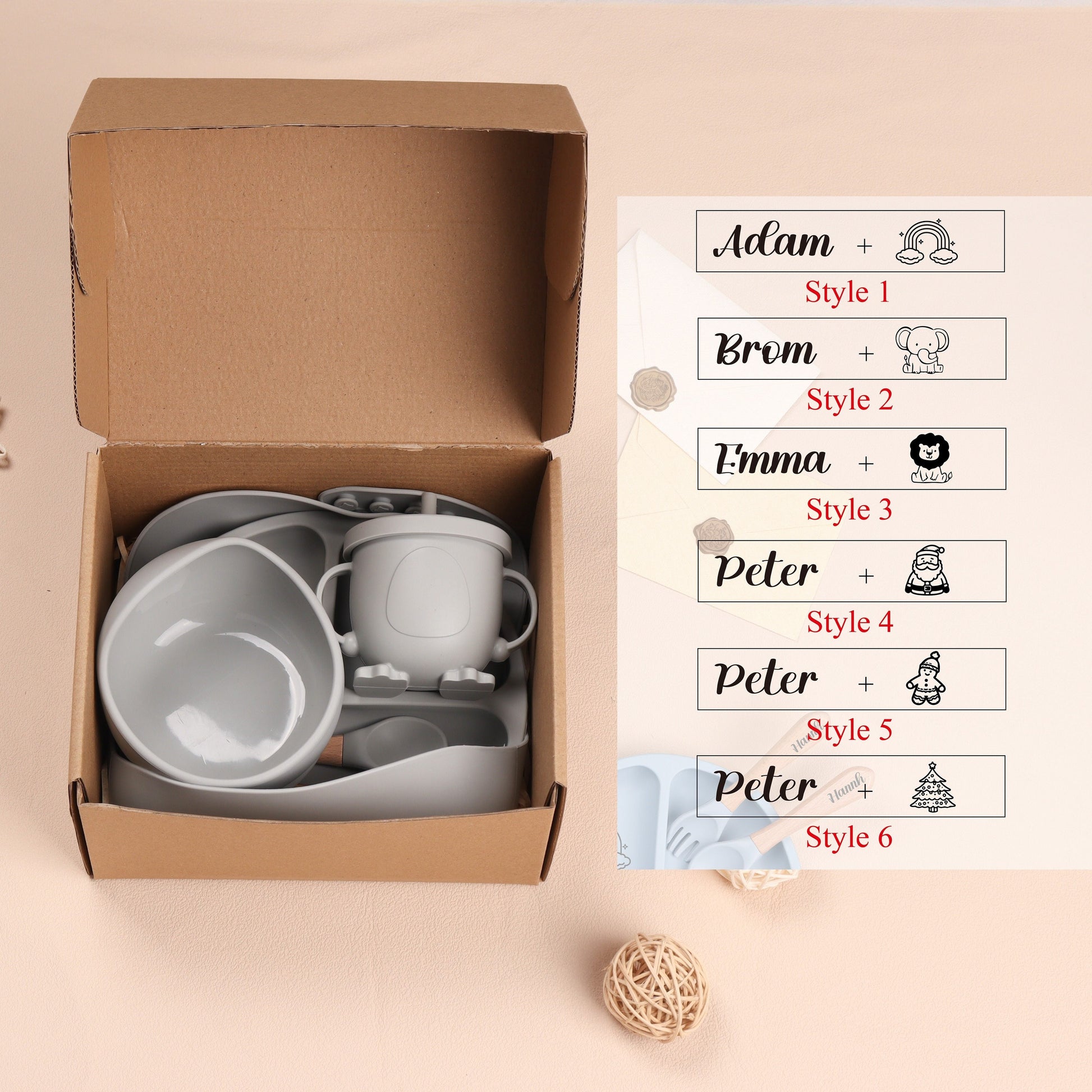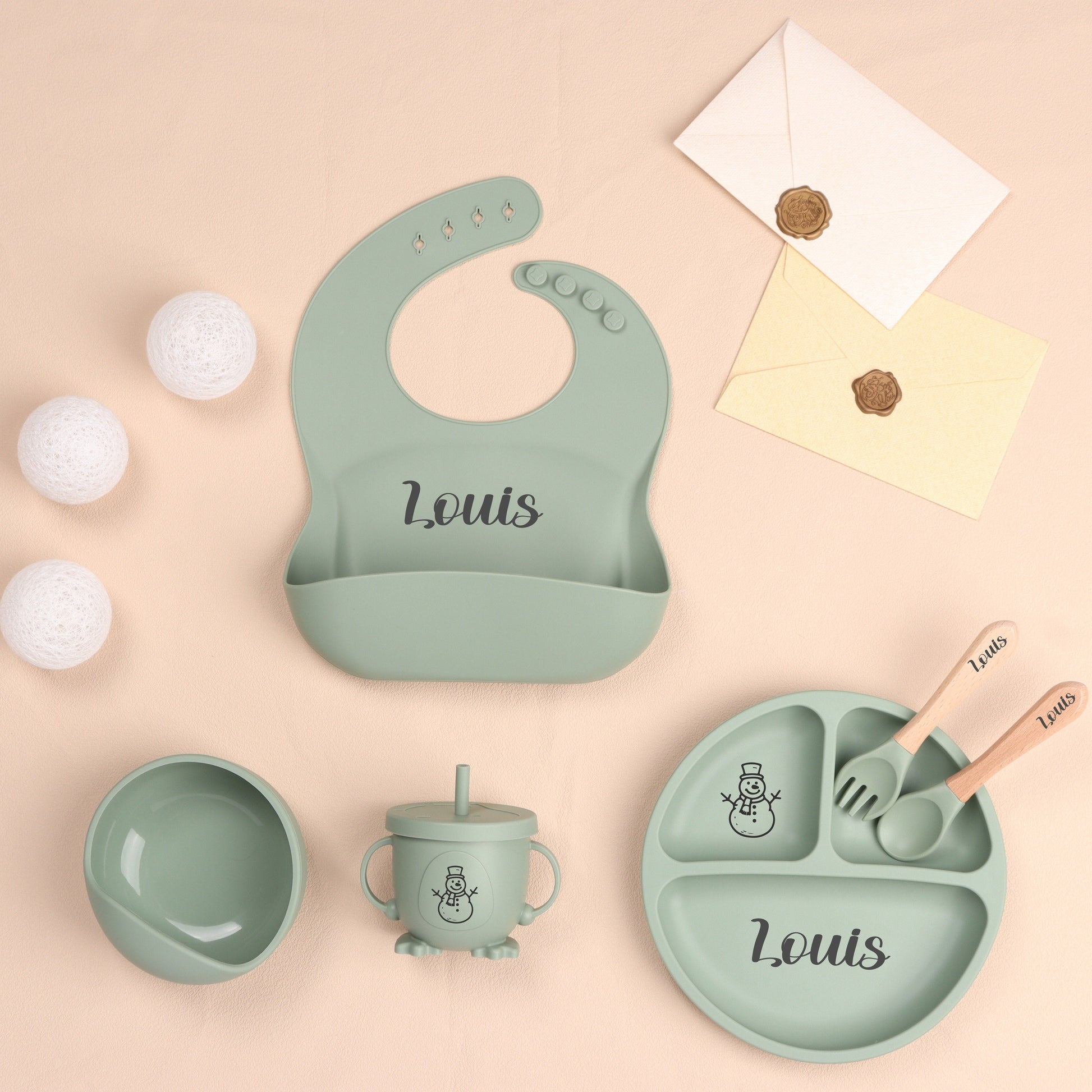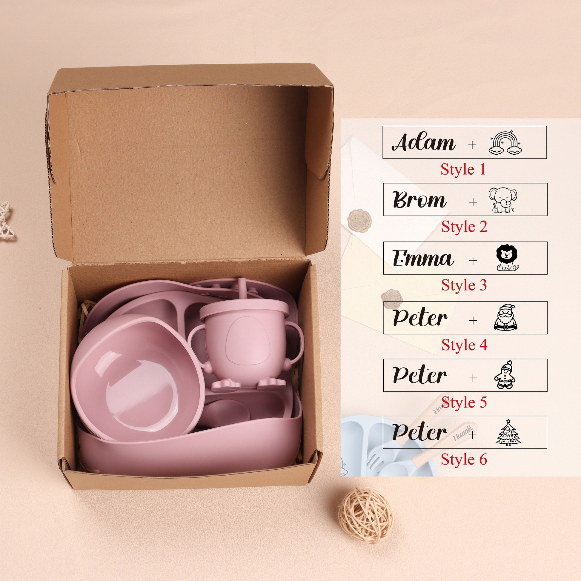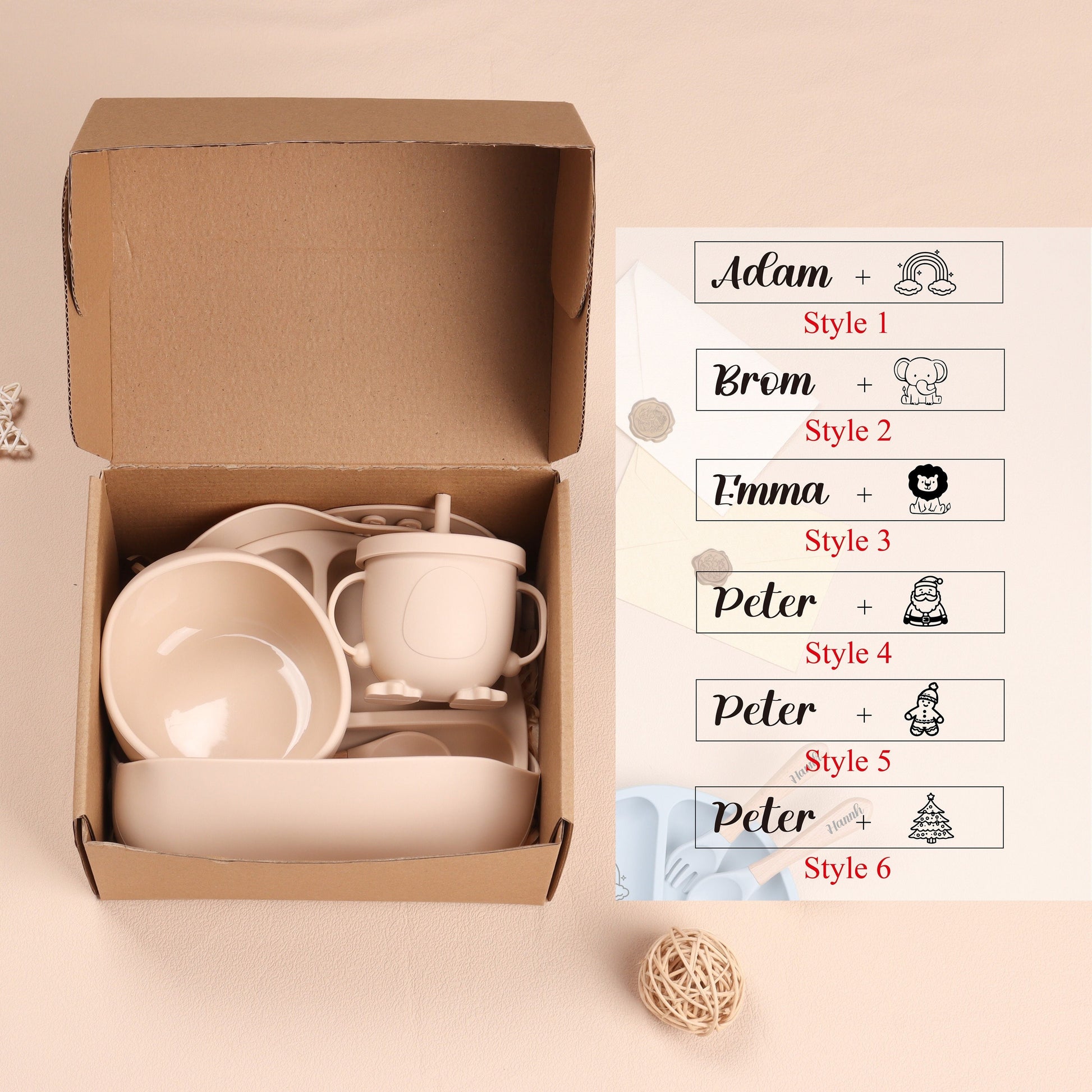 Индивидуальный силиконовый набор для кормления - персонализированный набор для отлучения от груди с именем ребенка, включая миску, чашку, слюнявчик, ложку и вилку - идеальный подарок на детский душ для детей в возрасте 3-6 лет