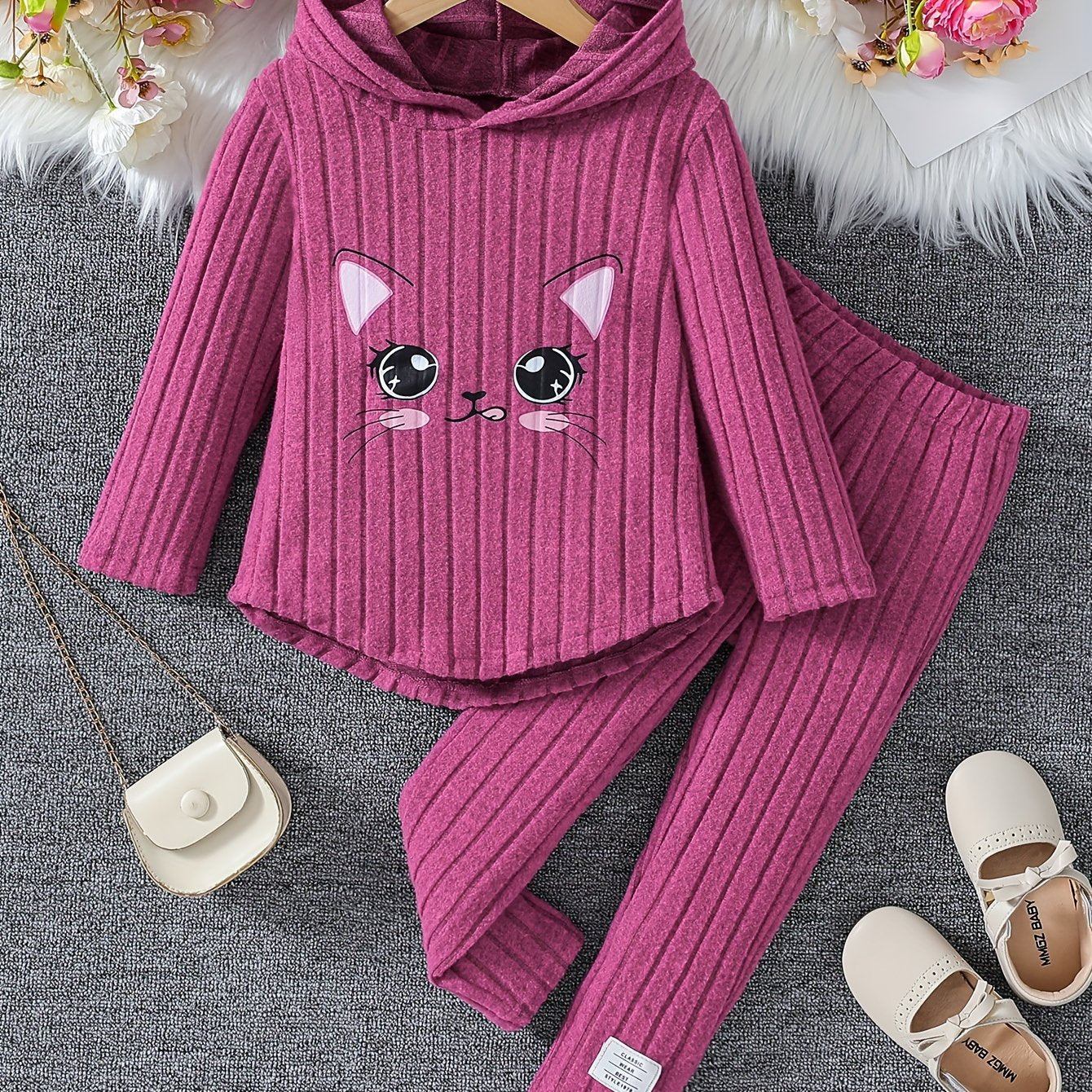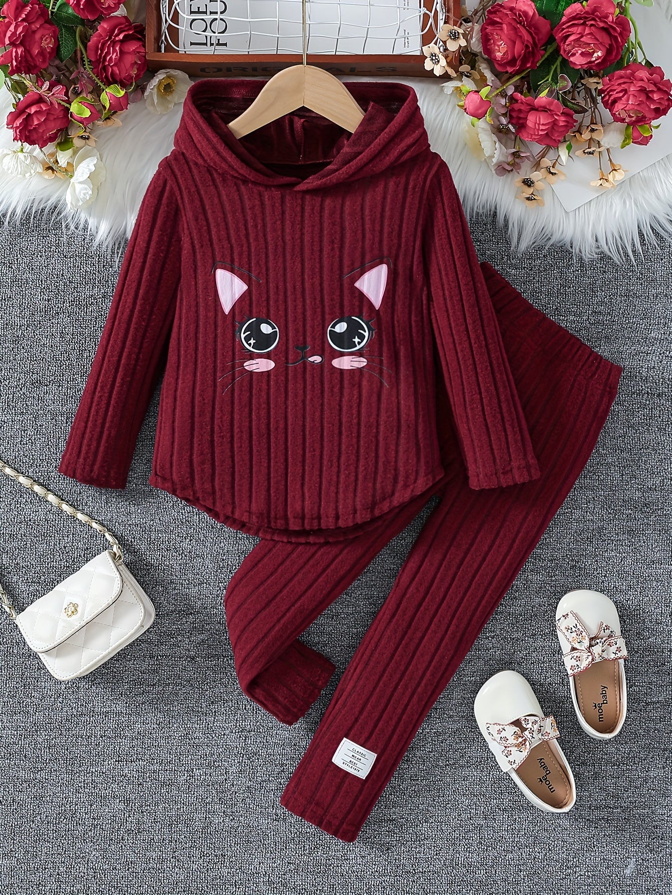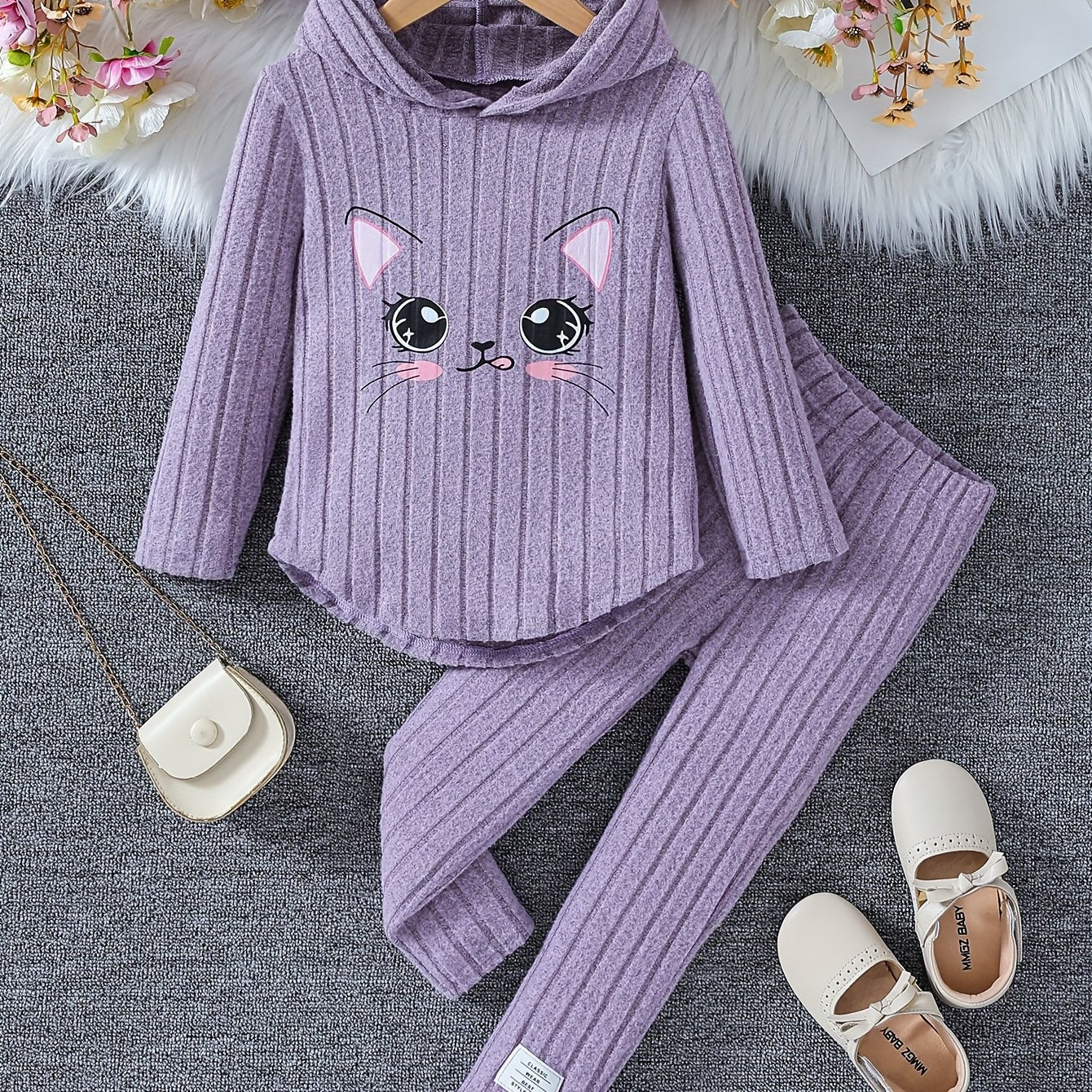 Девочкиный комплект из полиэстера для всех сезонов: худи и штаны с дизайном лица кота