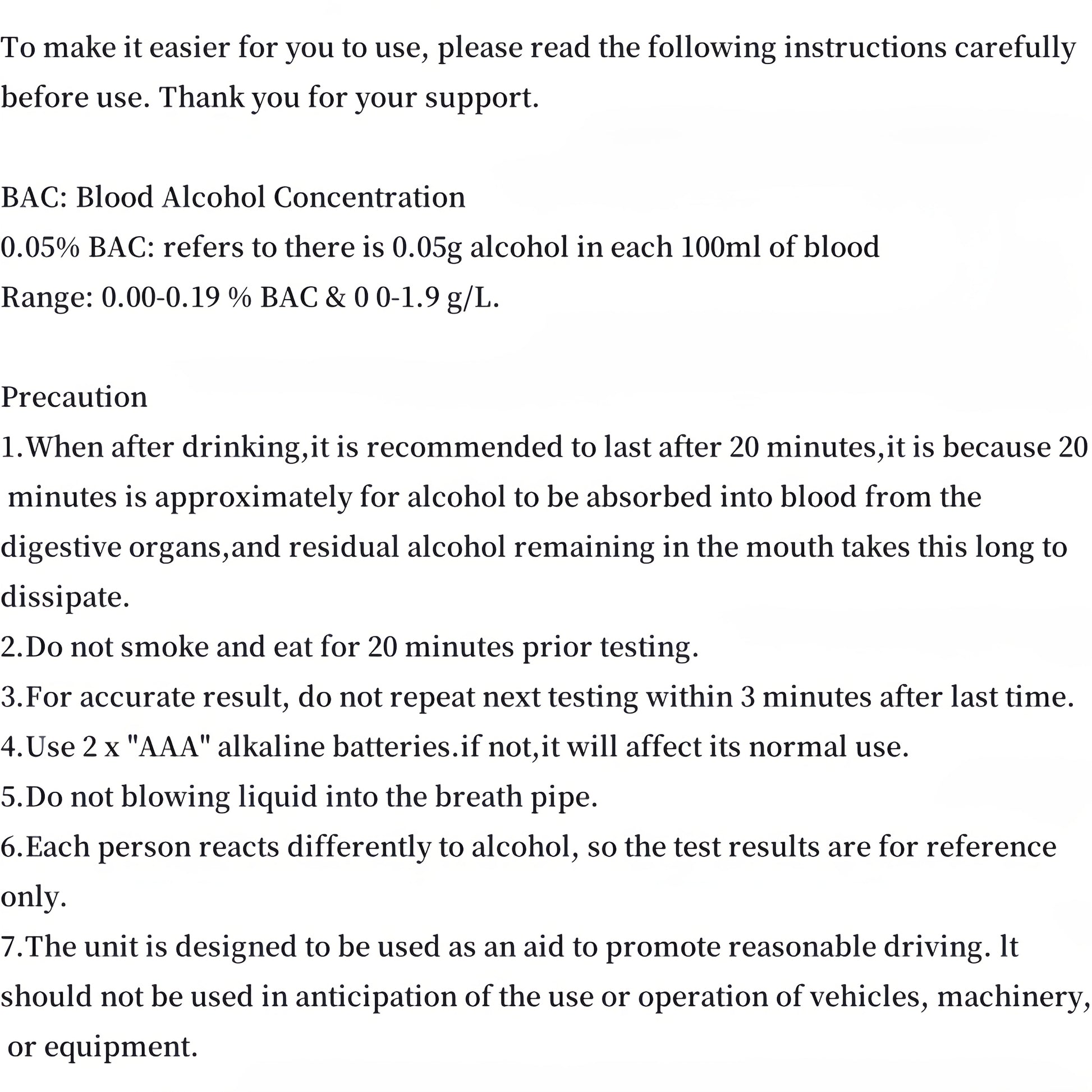 --Избегайте вдыхания жидкостей в дыхательную трубку. Не используйте стимулирующие вещества рядом с тестером, включая краску, инсектициды и алкоголь. Не размещайте тестер в закрытом помещении с загрязнённым воздухом. Изменение или вмешательство во внутренние части устройства может привести к его неисправности. Это устройство предназначено для содействия в безопасной практике вождения. Оно не предназначено для использования в качестве основы для управления транспортными средствами, машинами или оборудованием. Устройство не предоставляет информации о содержании алкоголя в крови или аналогичных показателях опьянения, установленных государственными, медицинскими или другими организациями. Для установки батареи сначала откройте крышку отсека для батарей сзади устройства. Затем вставьте две щелочные батареи типа "AAA" (UM-4) в правильной ориентации, как показано. В конце закройте крышку отсека для батарей. Инструкции по использованию алкотестера: сначала нажмите и удерживайте кнопку питания в течение одной секунды, пока устройство не издаст звуковой сигнал и дисплей не зажжется. Затем появится иконка ''разогрева'', и начнется обратный отсчет с 10 до 0, что означает подготовку устройства к использованию. Обратите внимание, что при первом использовании или после длительного хранения на поверхности устройства может скопиться значительное количество газа и примесей. В таких случаях датчик требует дополнительного времени для очистки и прогрева. При необходимости снова нажмите кнопку питания и попробуйте использовать устройство несколько раз. 1. Индикатор ''Дуть'' появляется при успешном разогреве, и начинается обратный отсчет с 10 до 00, что сигнализирует о переходе тестера в режим тестирования. 2. Выдохните в анализатор дыхания на 3-5 секунд с равномерной силой после глубокого вдоха. 3. Проверьте результаты теста на ЖК-дисплее алкотестера. 4. Индикатор ''Внимание'' появляется, если концентрация алкоголя составляет от 0,02% BAC (или 0,2 г/л) до 0,05% BAC (или 0,5 г/л). 5. Индикатор ''Опасность'' активируется с звуковым сигналом, если уровень алкоголя достигает или превышает 0,05% BAC (или 0,5 г/л). 6. Если во время теста не дуть в устройство, ЖК-дисплей покажет значение ''0.00 %BAC & 0.0 г/л''. Примечание: для более точных результатов производитель рекомендует провести тест 2 или 3 раза. Поменяйте мундштук. 1. Поверните его в противоположную сторону один раз, чтобы ослабить. 2. Установите новый мундштук правильно и поверните по часовой стрелке, чтобы закрепить. Подсветка: подсветка ЖК-дисплея загорается при включении тестера и остается включенной до автоматического отключения. Замена батареи: если дисплей мерцает, это означает, что батареи разряжены; замените их на две щелочные батареи типа "AAA". 1. Производители и продавцы не несут ответственности за любые нарушения, независимо от использования продукта. Например: управление транспортным средством под воздействием или выполнение работ на большой высоте. 2. Реакция на алкоголь у разных людей различна, поэтому результаты тестов являются лишь ориентировочными и не должны использоваться как окончательные.