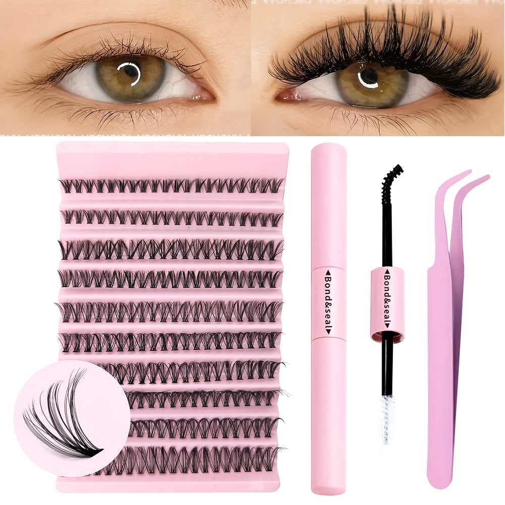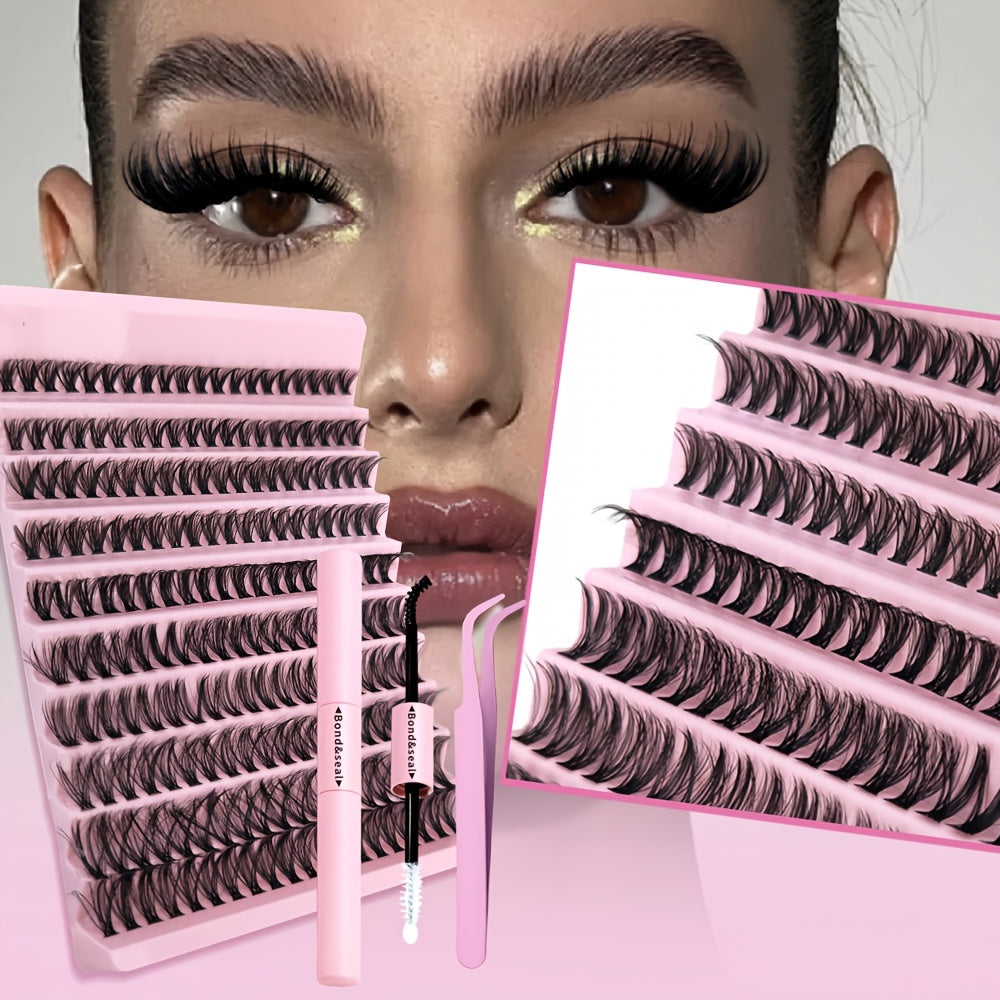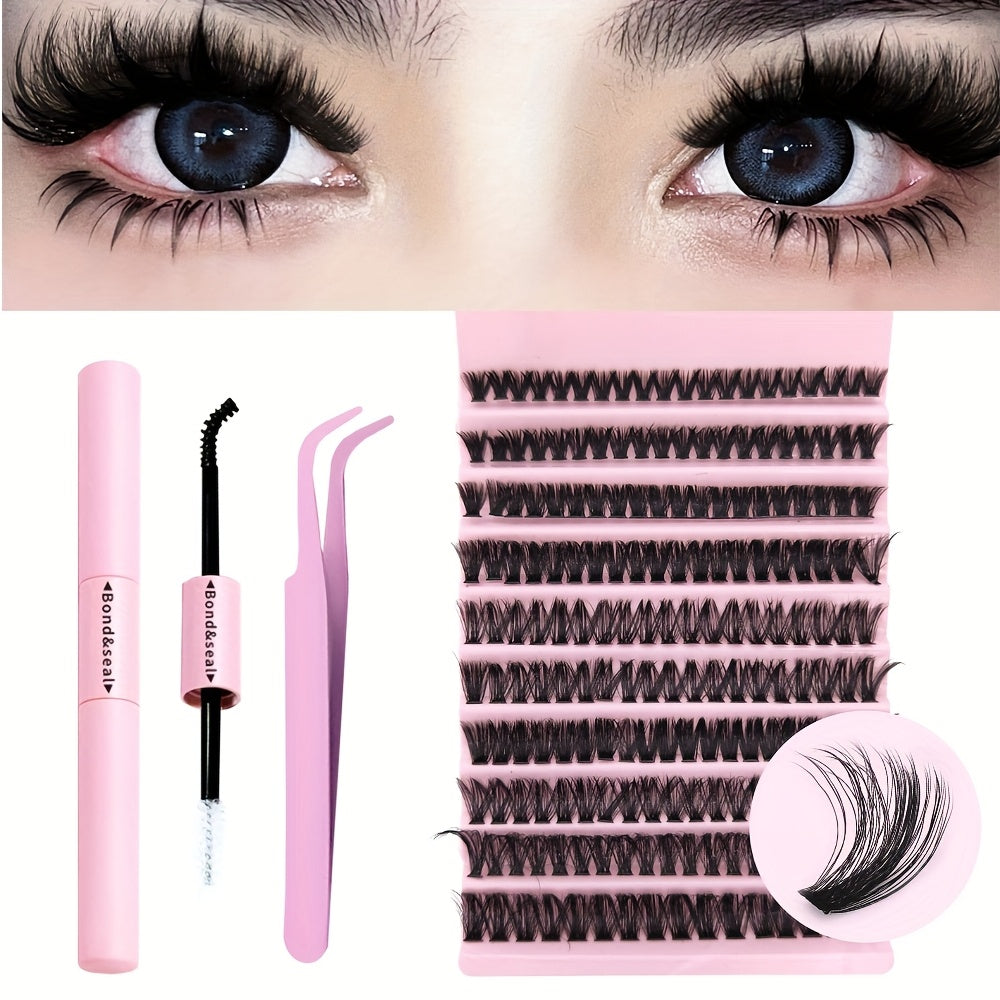 Набор для наращивания ресниц DIY включает в себя клей, пинцет и разнообразные тонкие пушистые ресницы разных длин и изгибов.