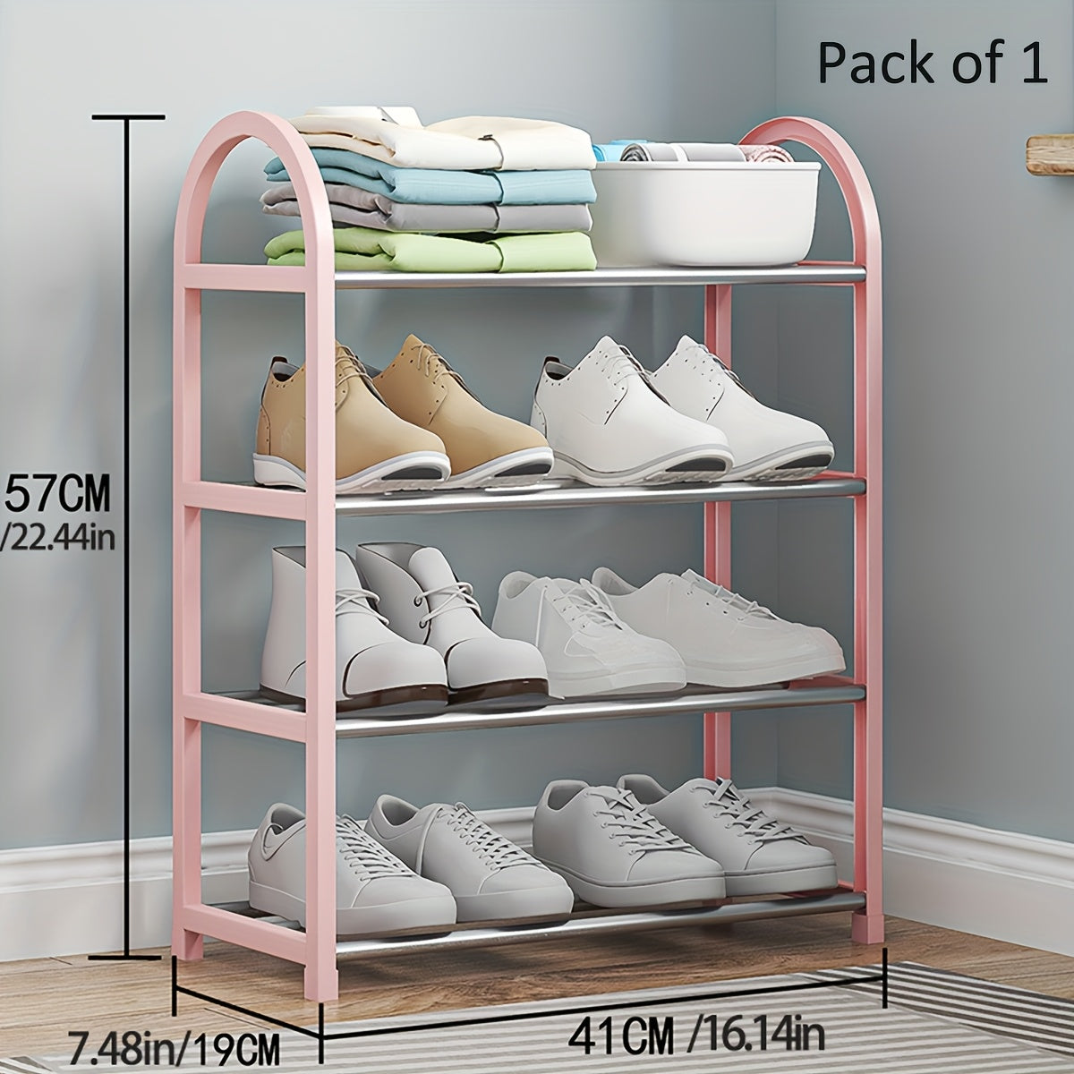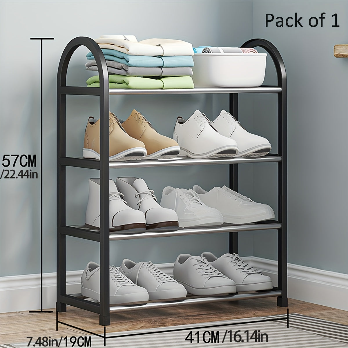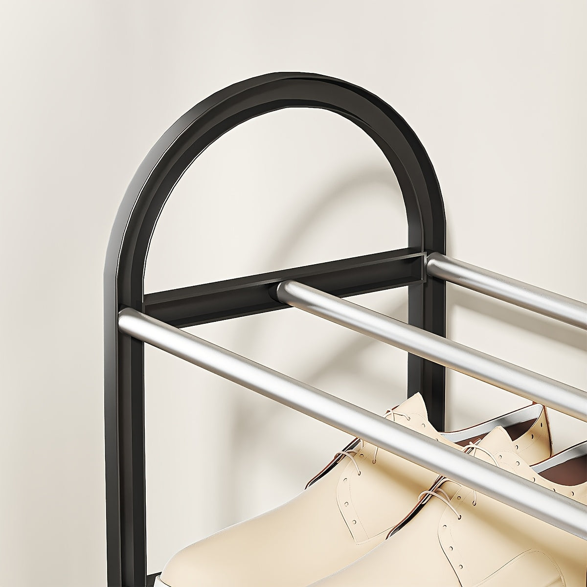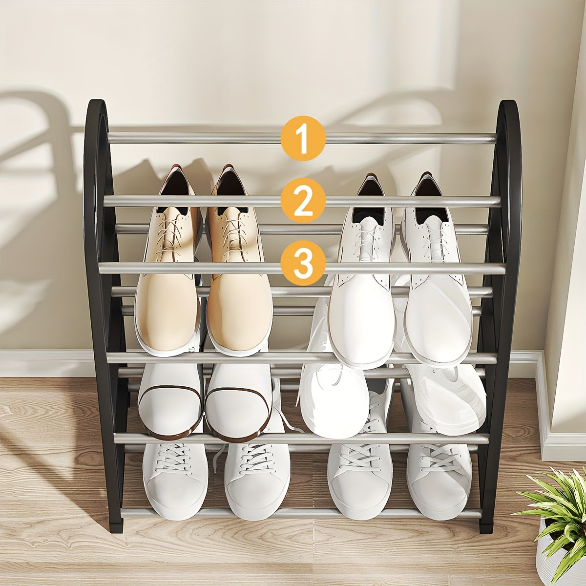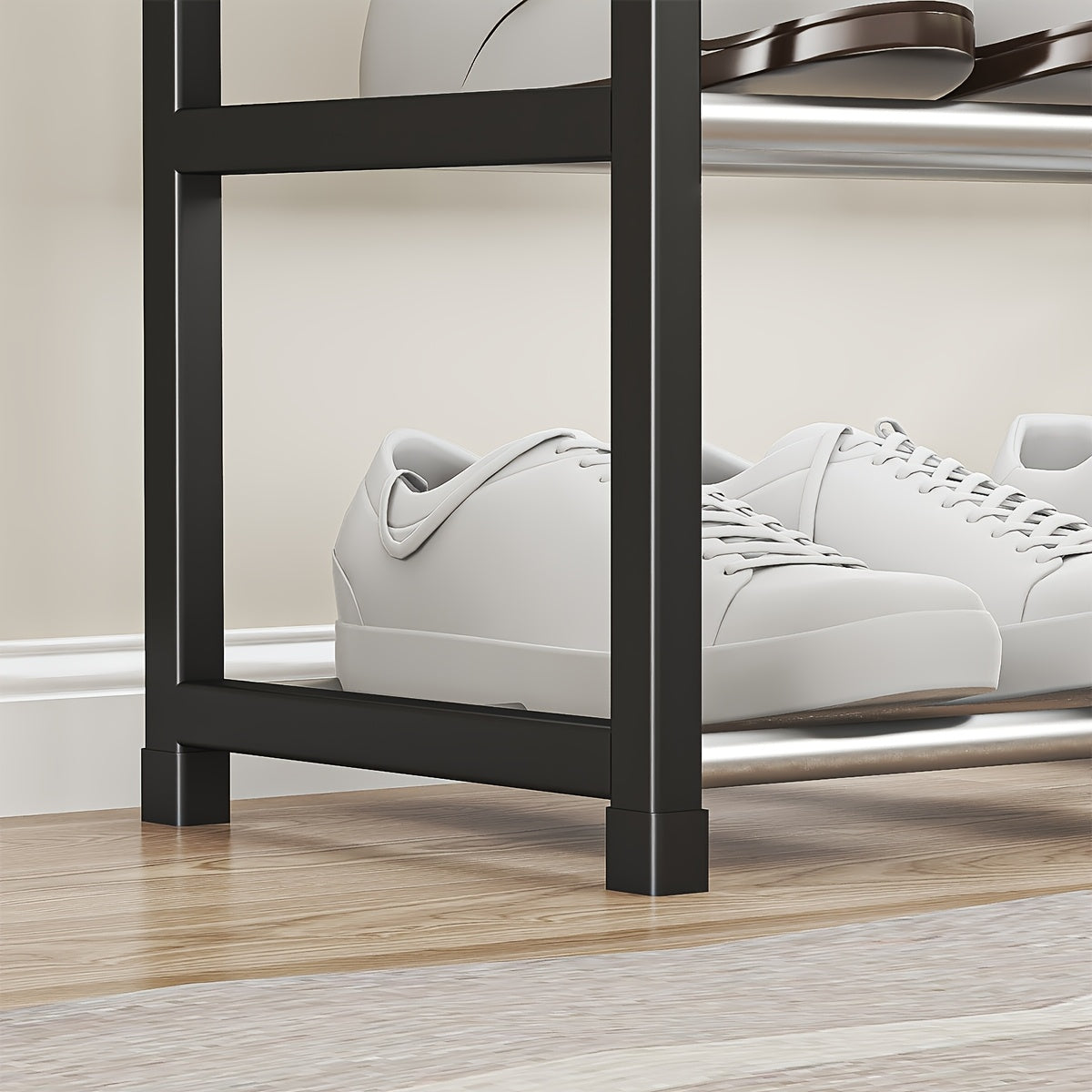 Прочная черная металлическая полка для обуви с пластиковыми вставками — отдельно стоящая многоуровневая конструкция для легкой сборки и пыленепроницаемого хранения в прихожей, общежитии или дома.