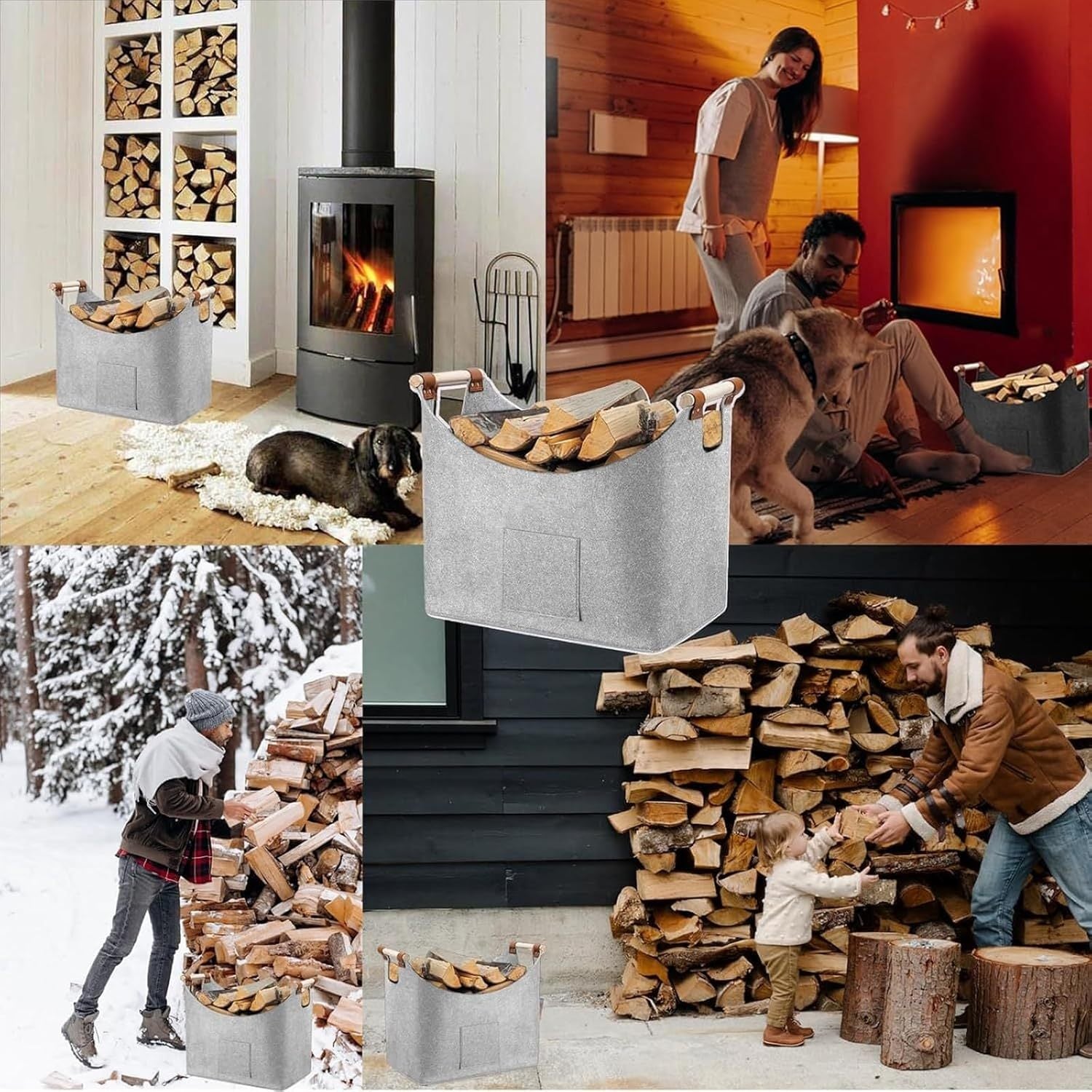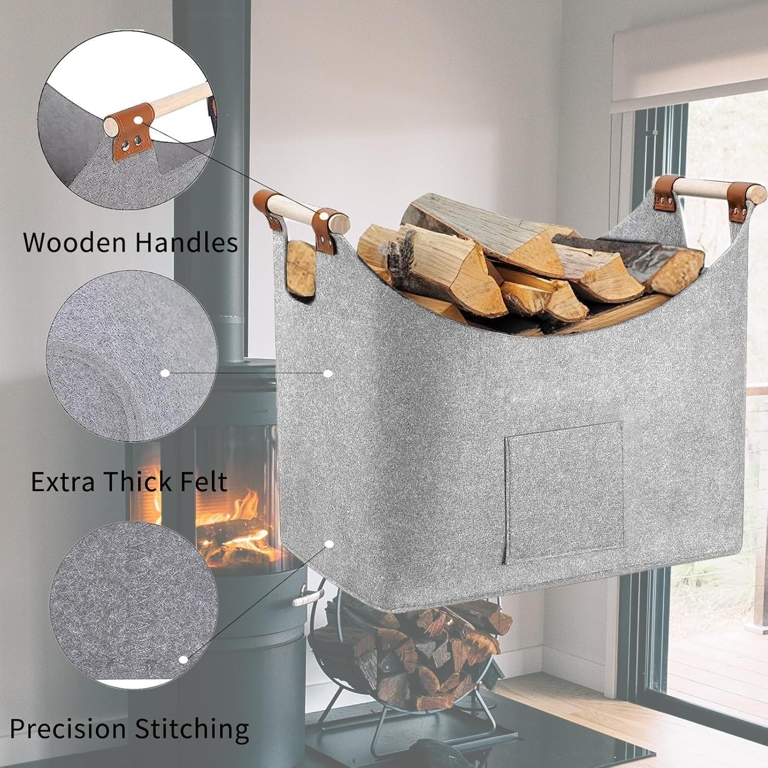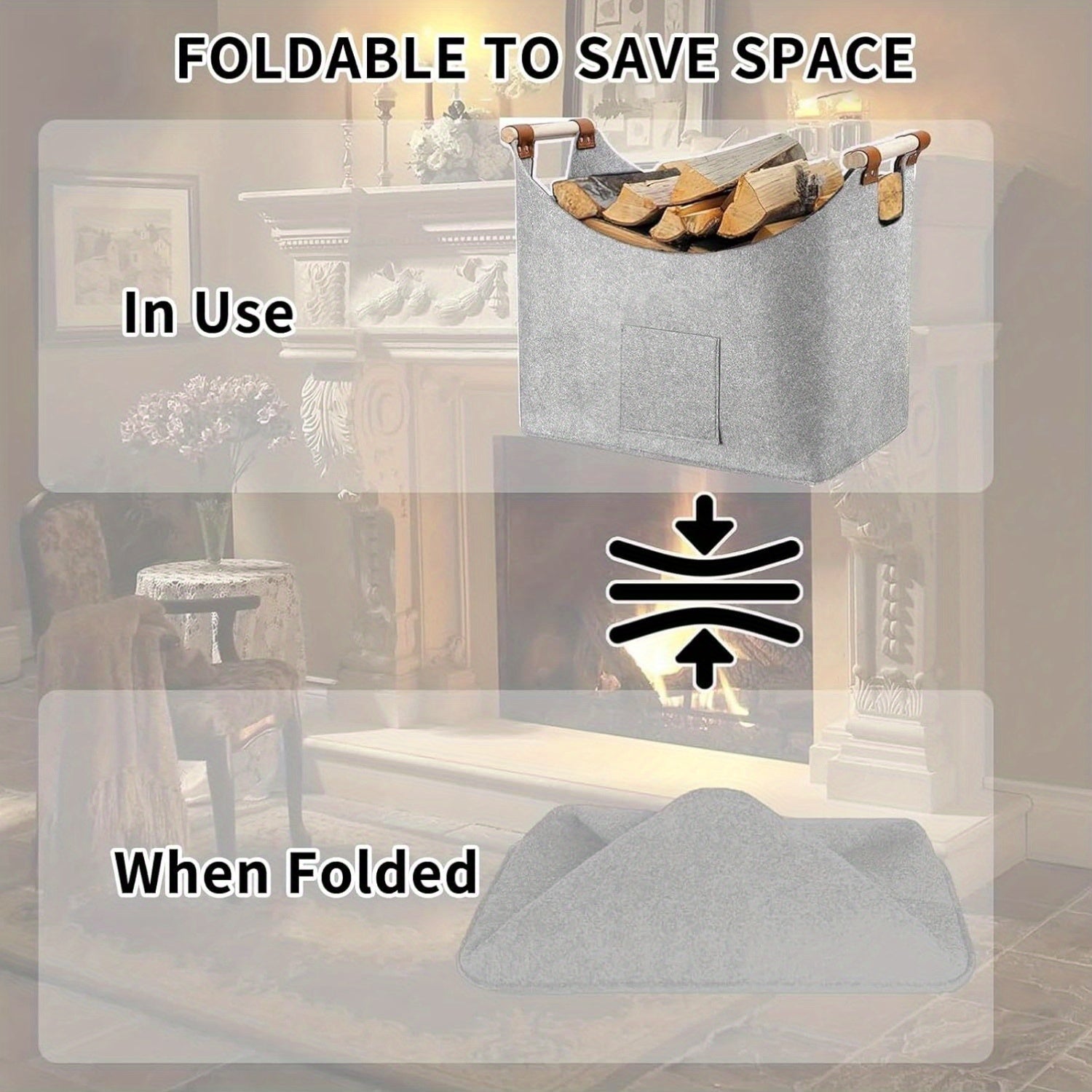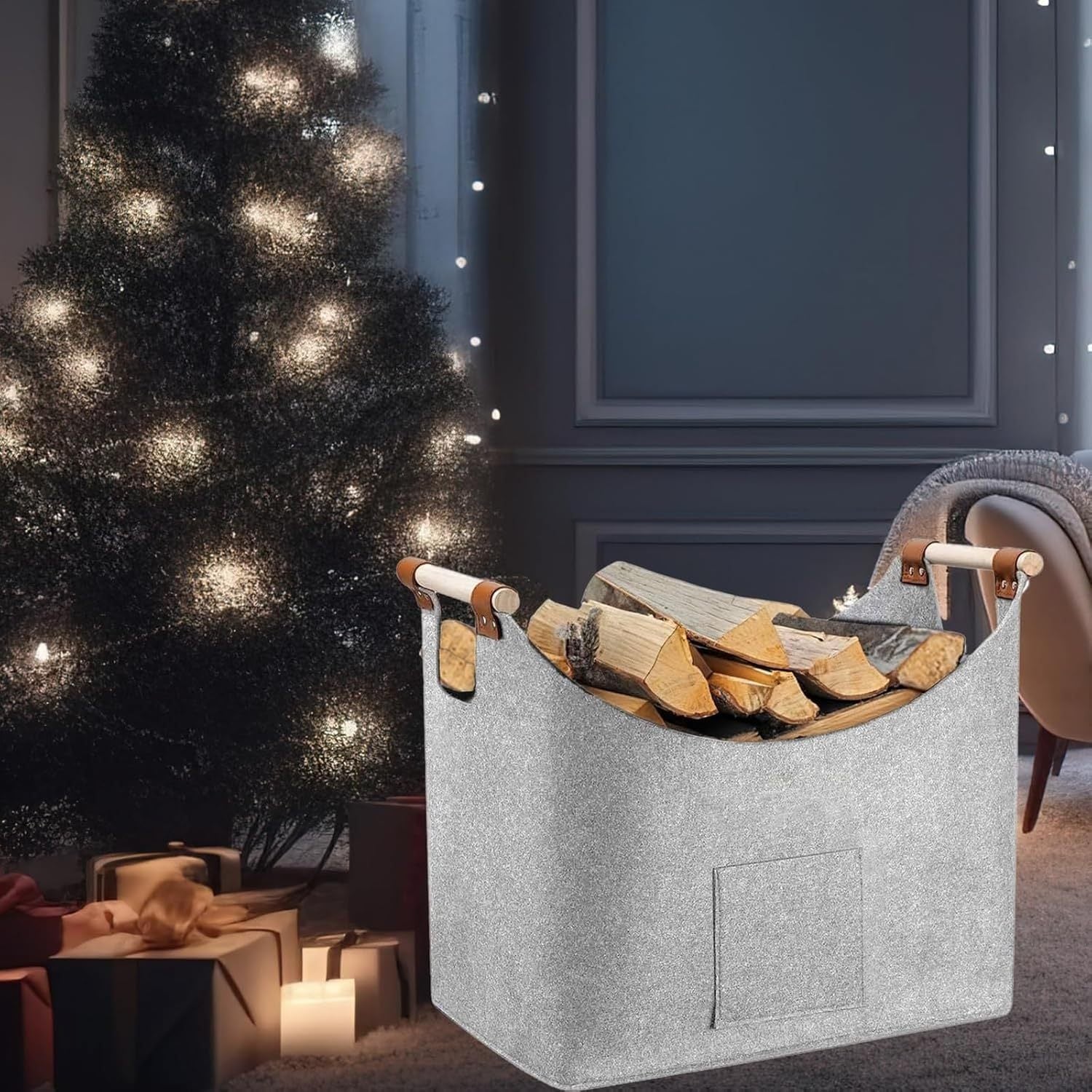 Большая серая корзина для дров из прочного ПЭТ-материала с ручками, очень толстое войлочное хранилище для дров, настенный держатель для дров для камина, емкость 36 кг/46 л, размеры 45x40x32 см