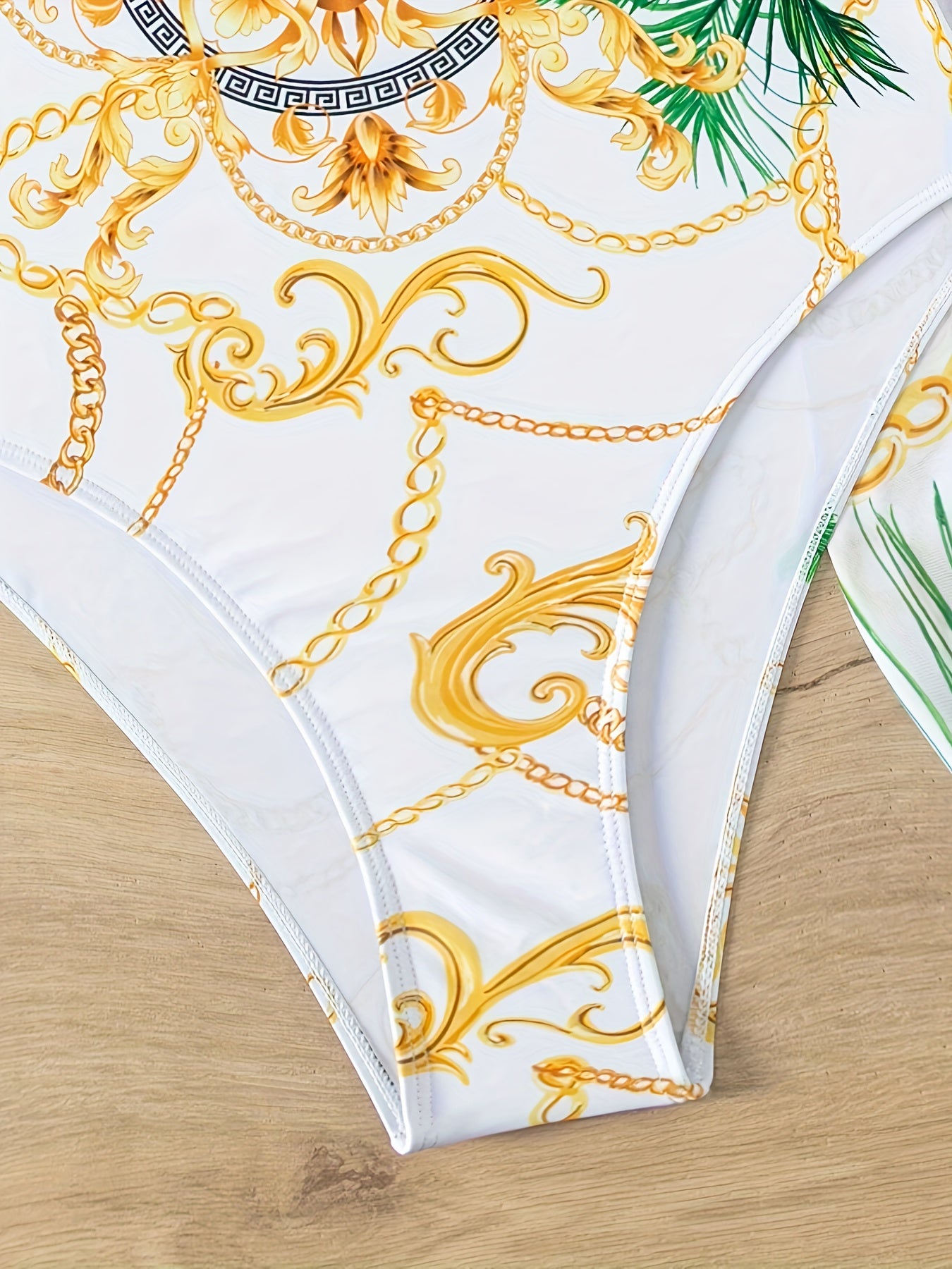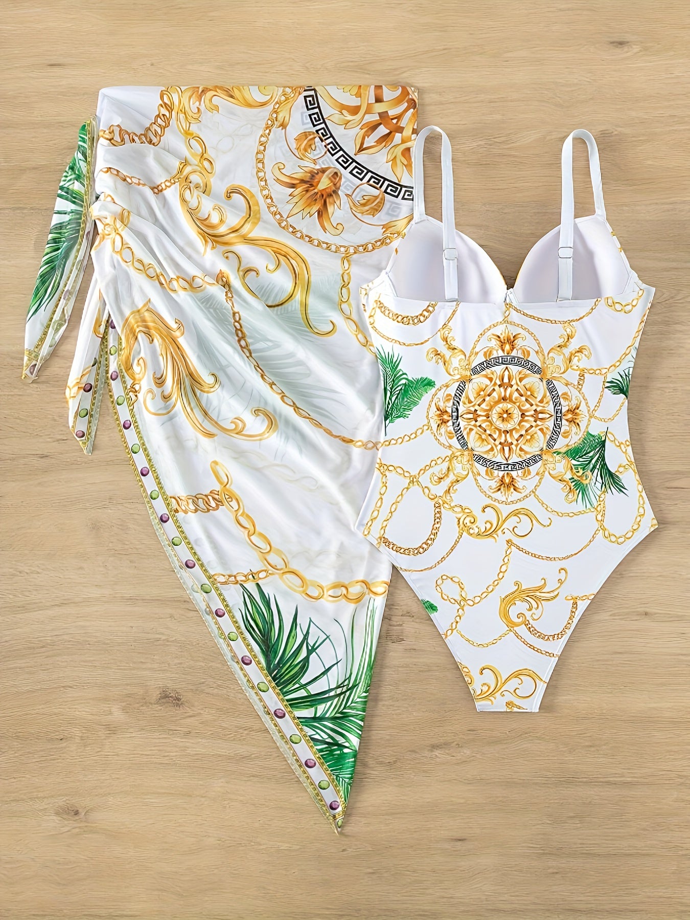 Элегантные купальники из 2 предметов с цепочным принтом и V-образным вырезом, включает в себя купальник с пуш-апом и тонкими бретелями, а также юбку-обертку. Идеально подходит для коллекции женской пляжной одежды.