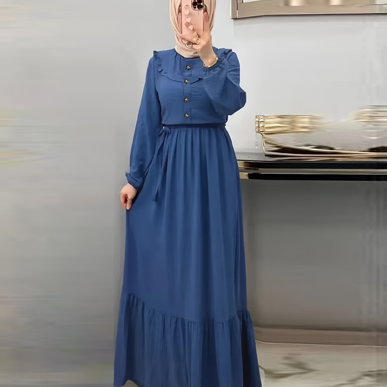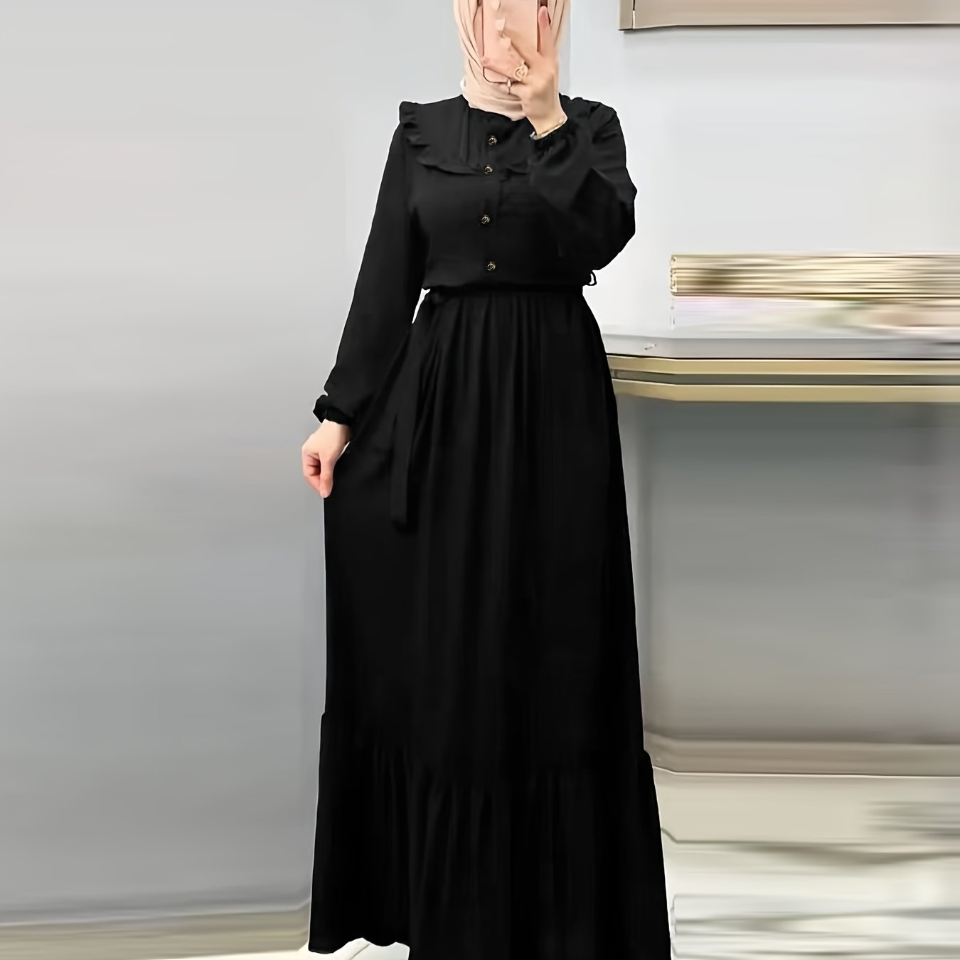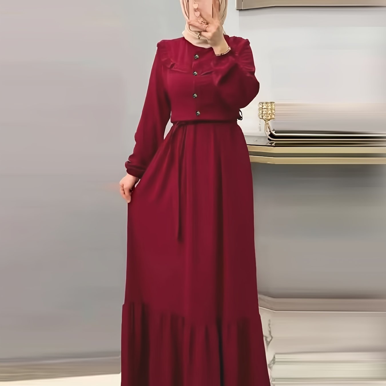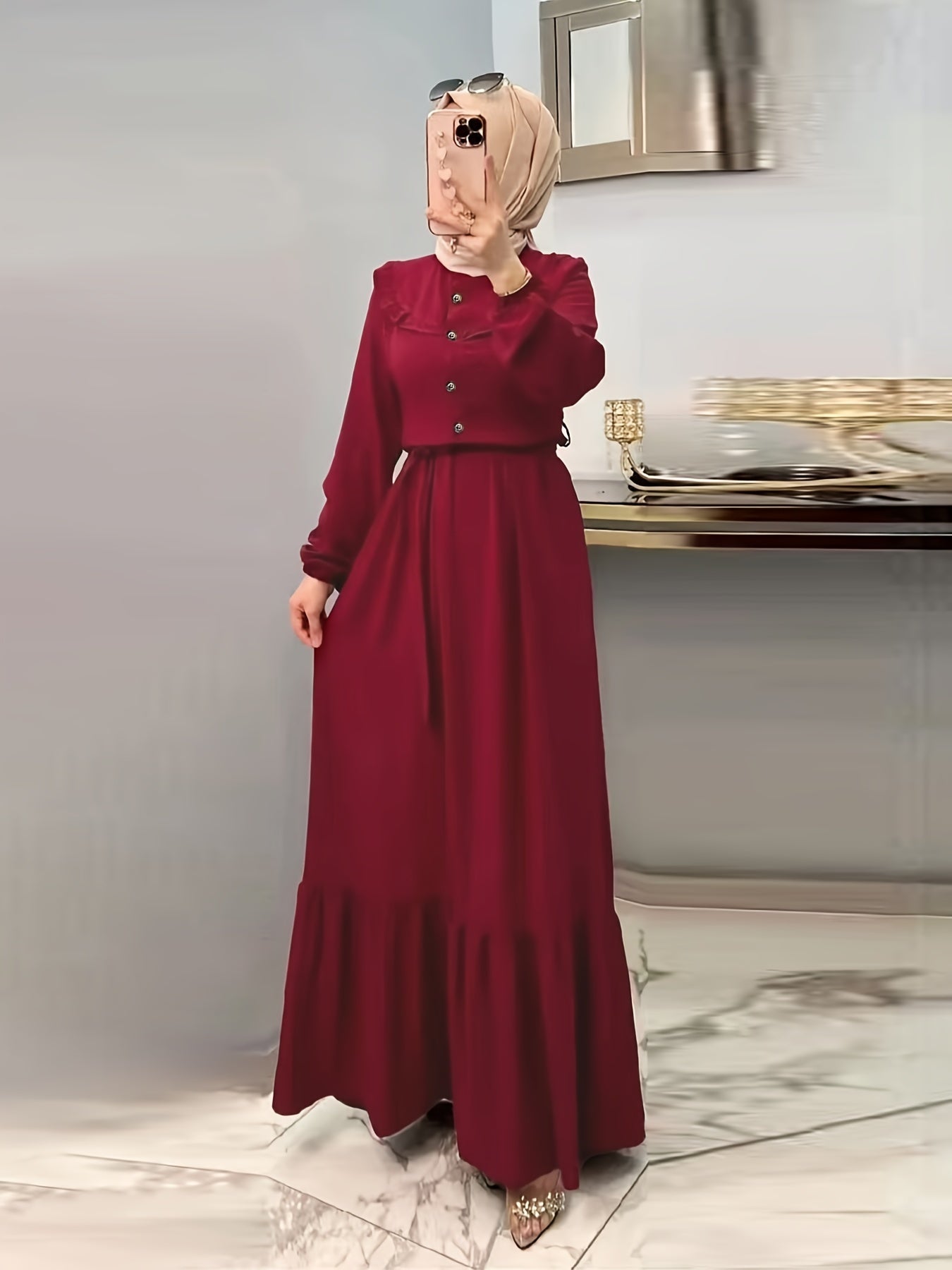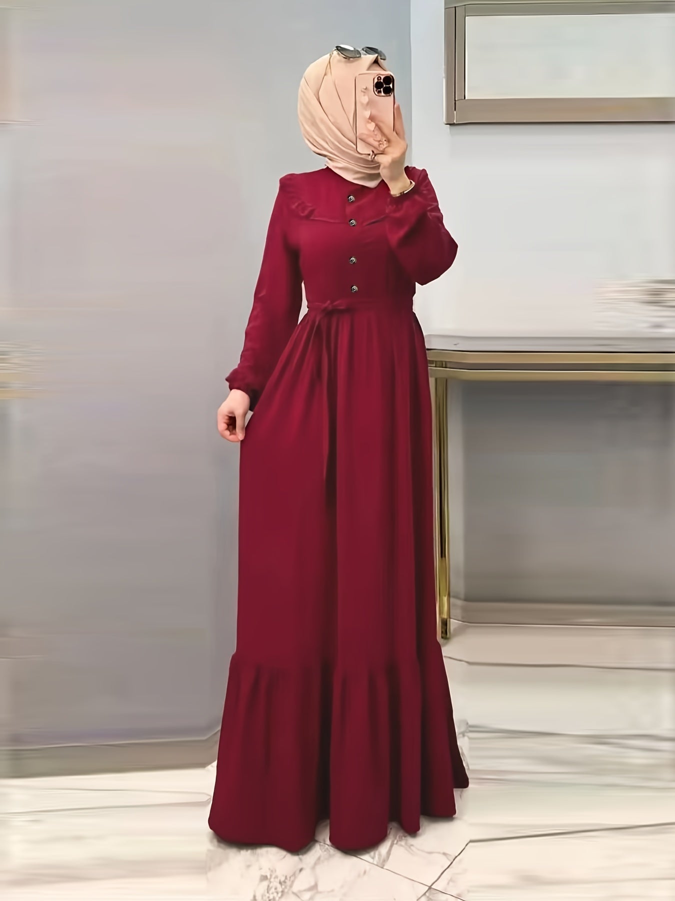 Элегантное бордовое макси-платье для мусульманских женщин с длинными рукавами, на пуговицах, однотонное, из полиэстера и спандекса, повседневное