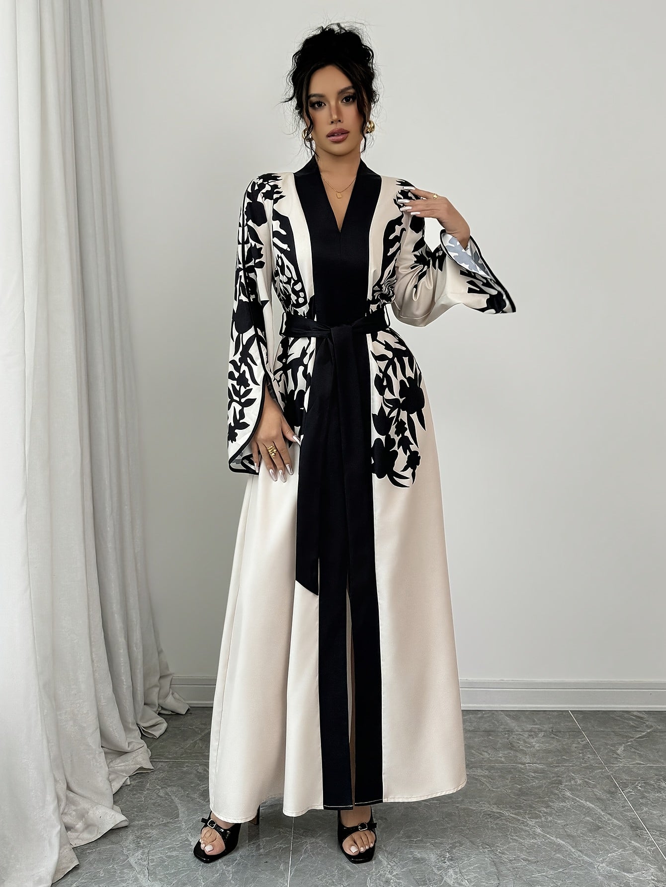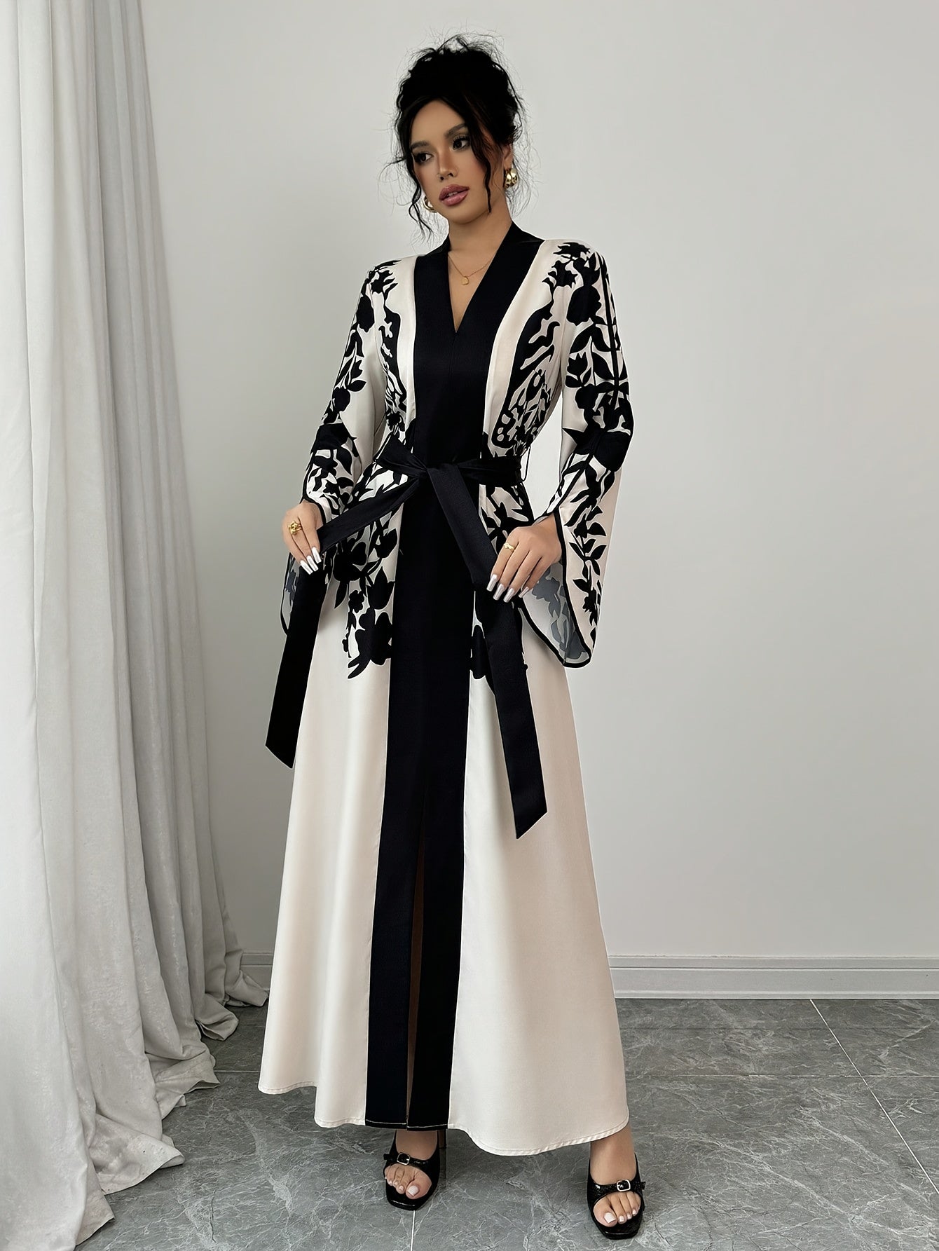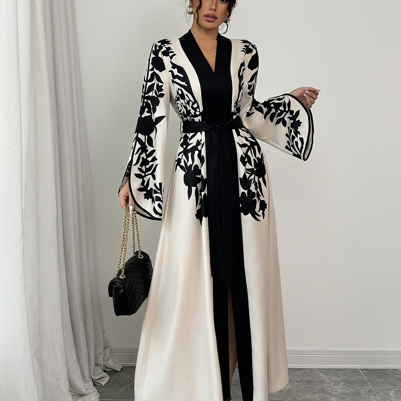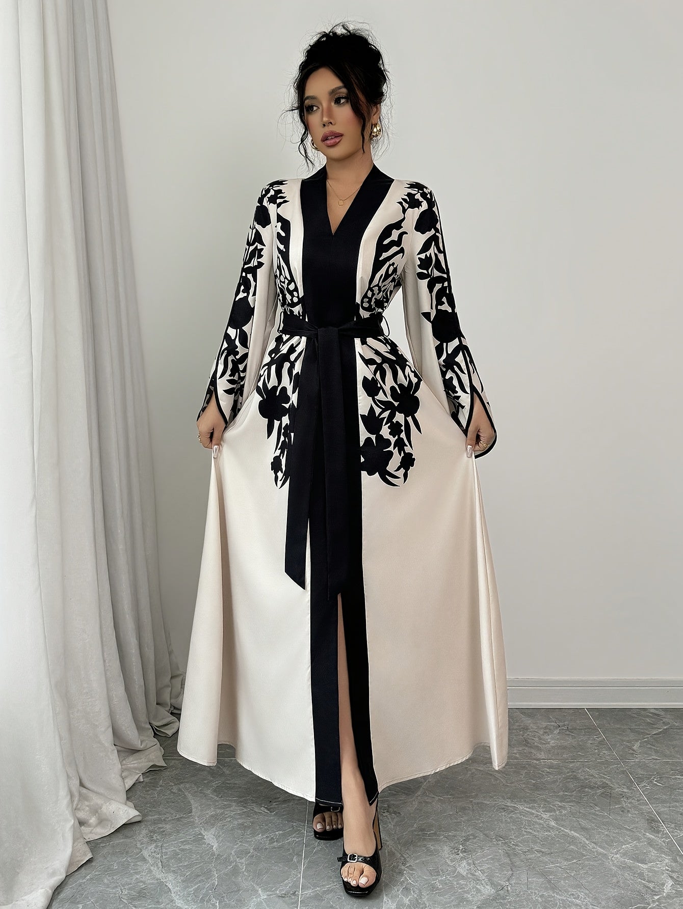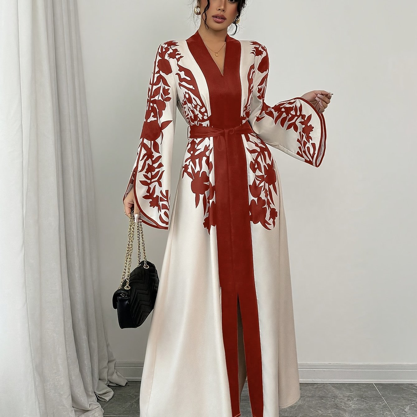 Элегантное длинное платье-макси с длинными рукавами, поясом с цветочным и животным принтом, V-образным вырезом и широкой юбкой-каскадом