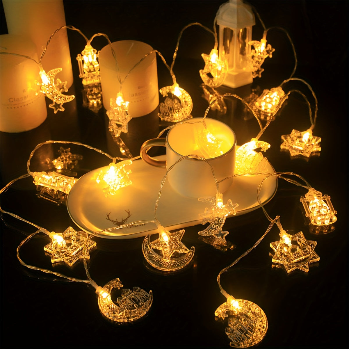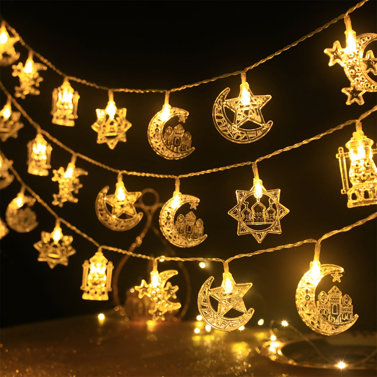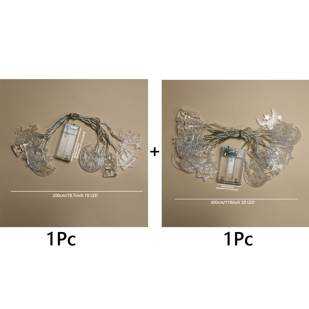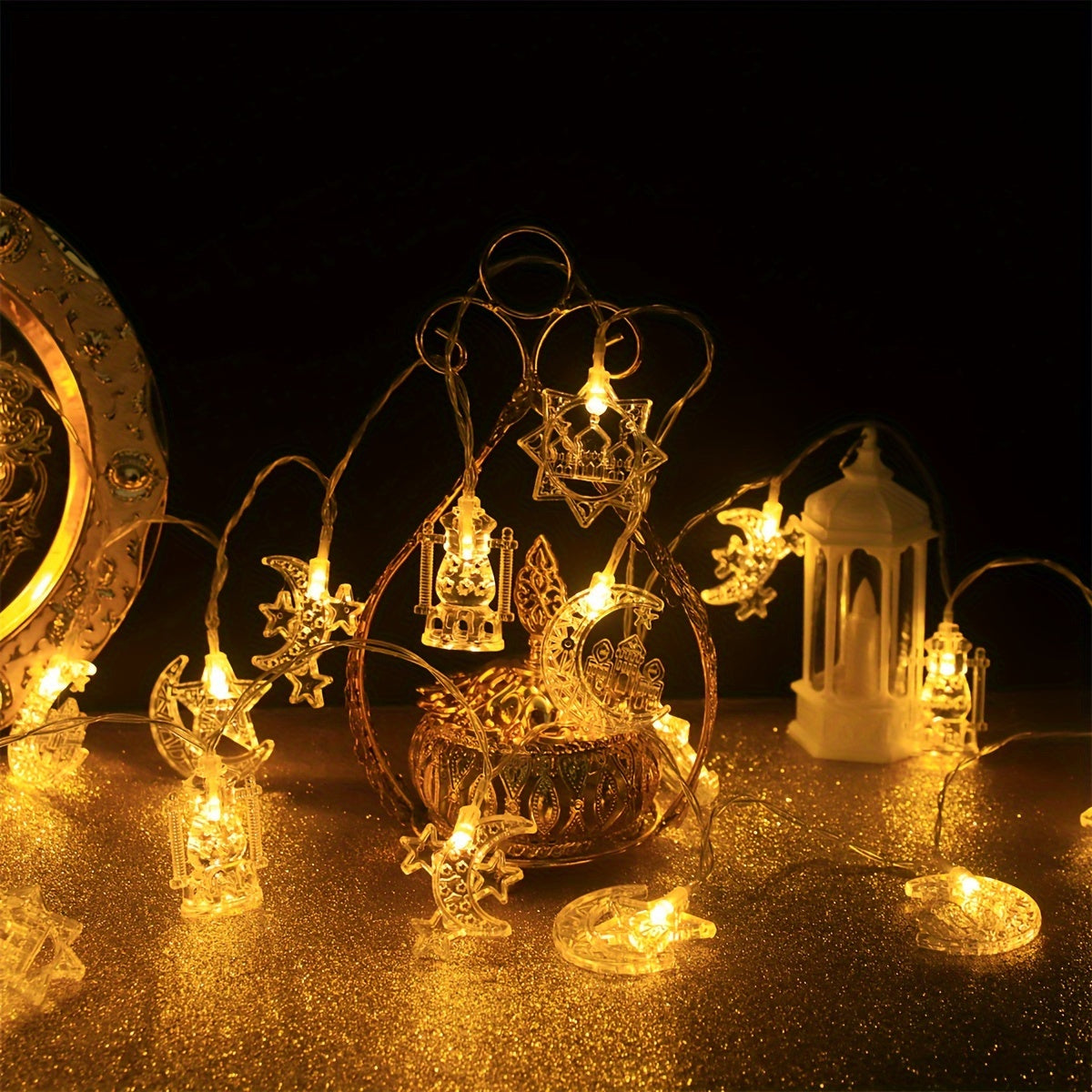 Элегантные рамаданские гирлянды - Доступно в длине 2 м или 3 м - Особенности: 10 или 20 светодиодов в дизайне полумесяца и звезды. - Излучать теплое золотистое сияние - Работает от батареи - Идеально для дома