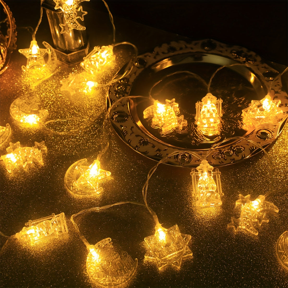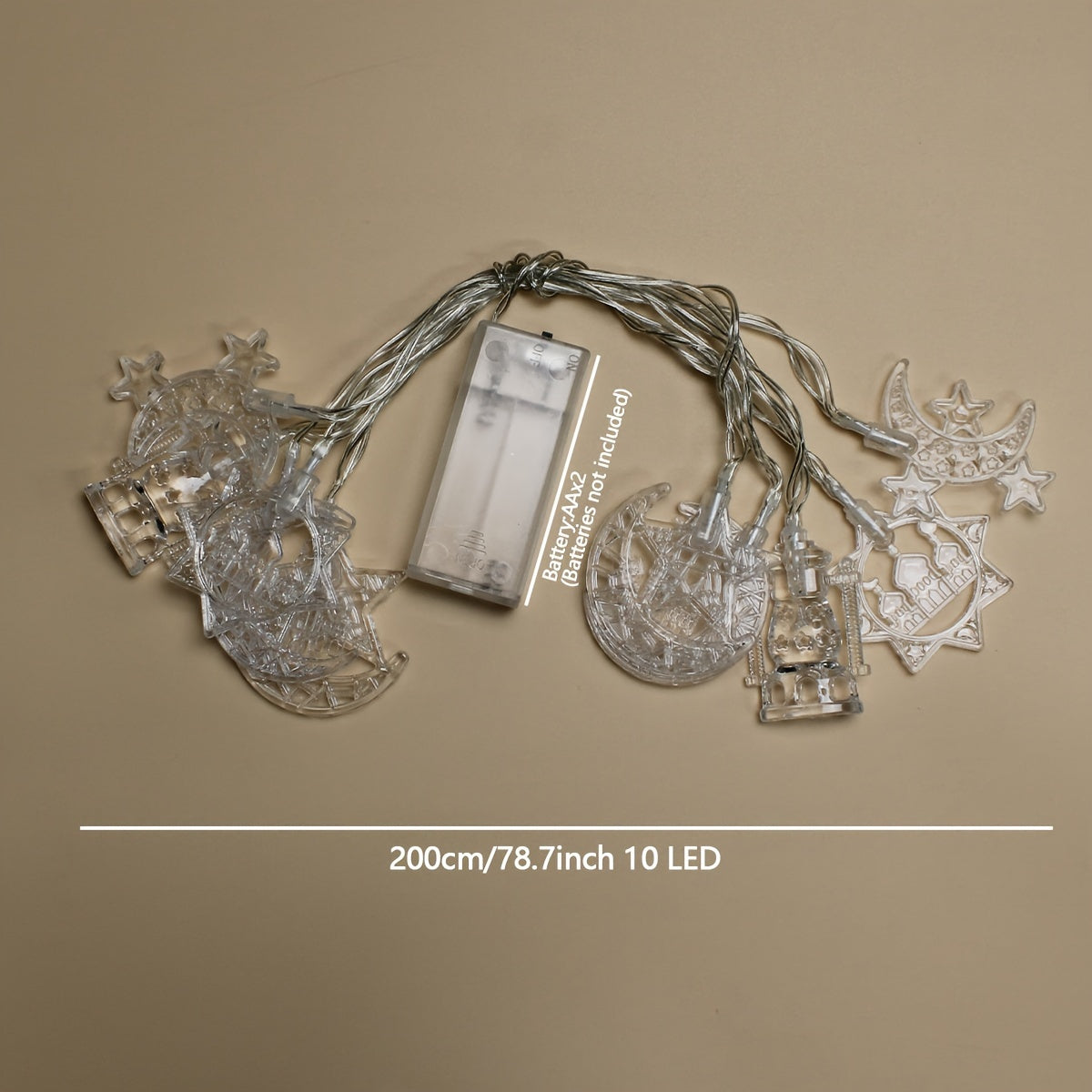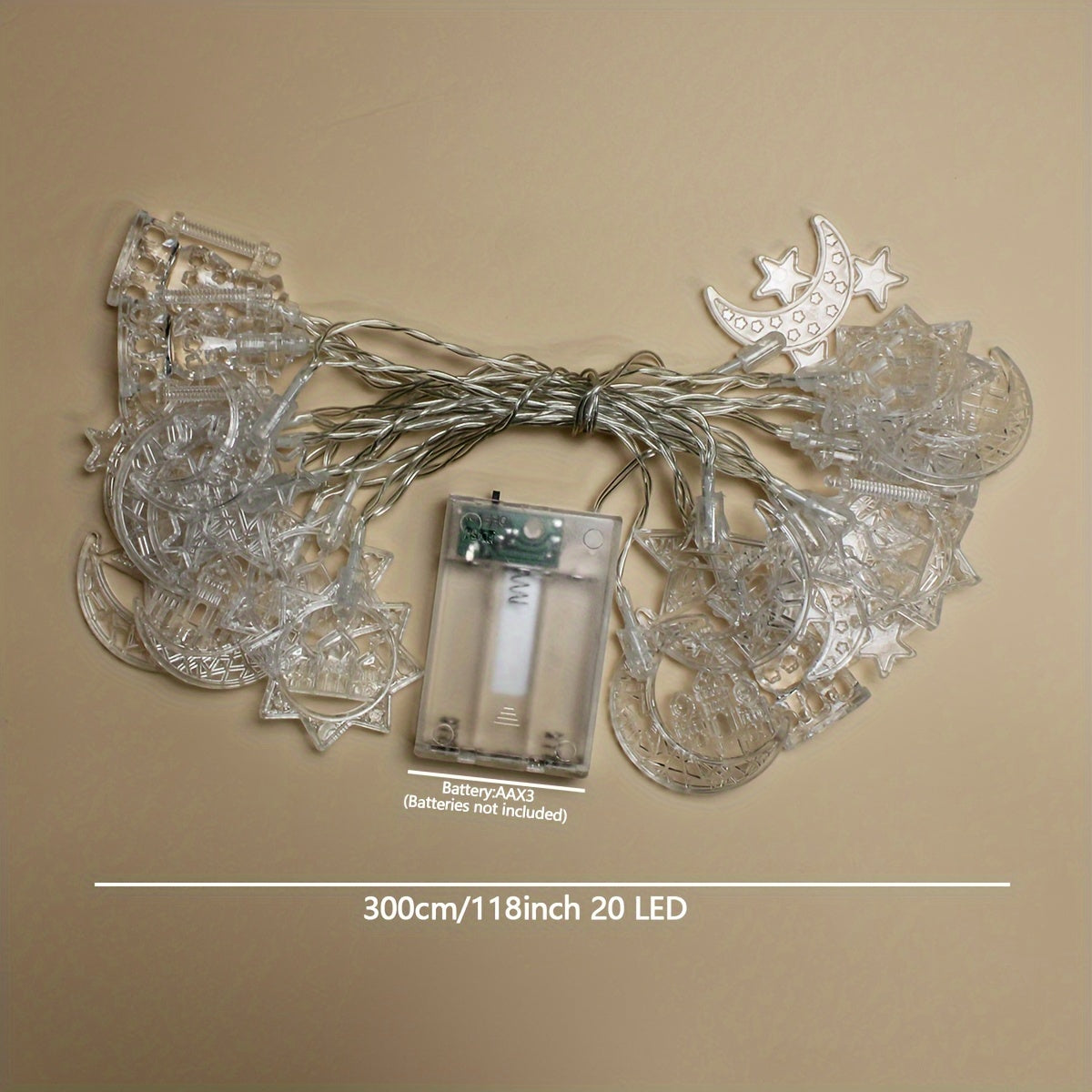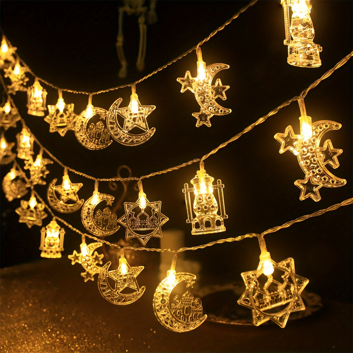 Элегантные рамаданские гирлянды - Доступно в длине 2 м или 3 м - Особенности: 10 или 20 светодиодов в дизайне полумесяца и звезды. - Излучать теплое золотистое сияние - Работает от батареи - Идеально для дома