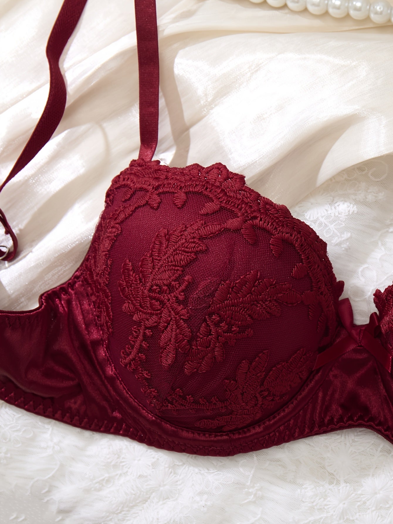 Элегантный комплект красного кружевного нижнего белья с бюстгальтером высокой поддержки и трусиками с заниженной талией, удобная одежда для вечеринок с несъемной прокладкой. Изготовлен из смеси полиэстера и эластана, подходит для взрослых женщин.