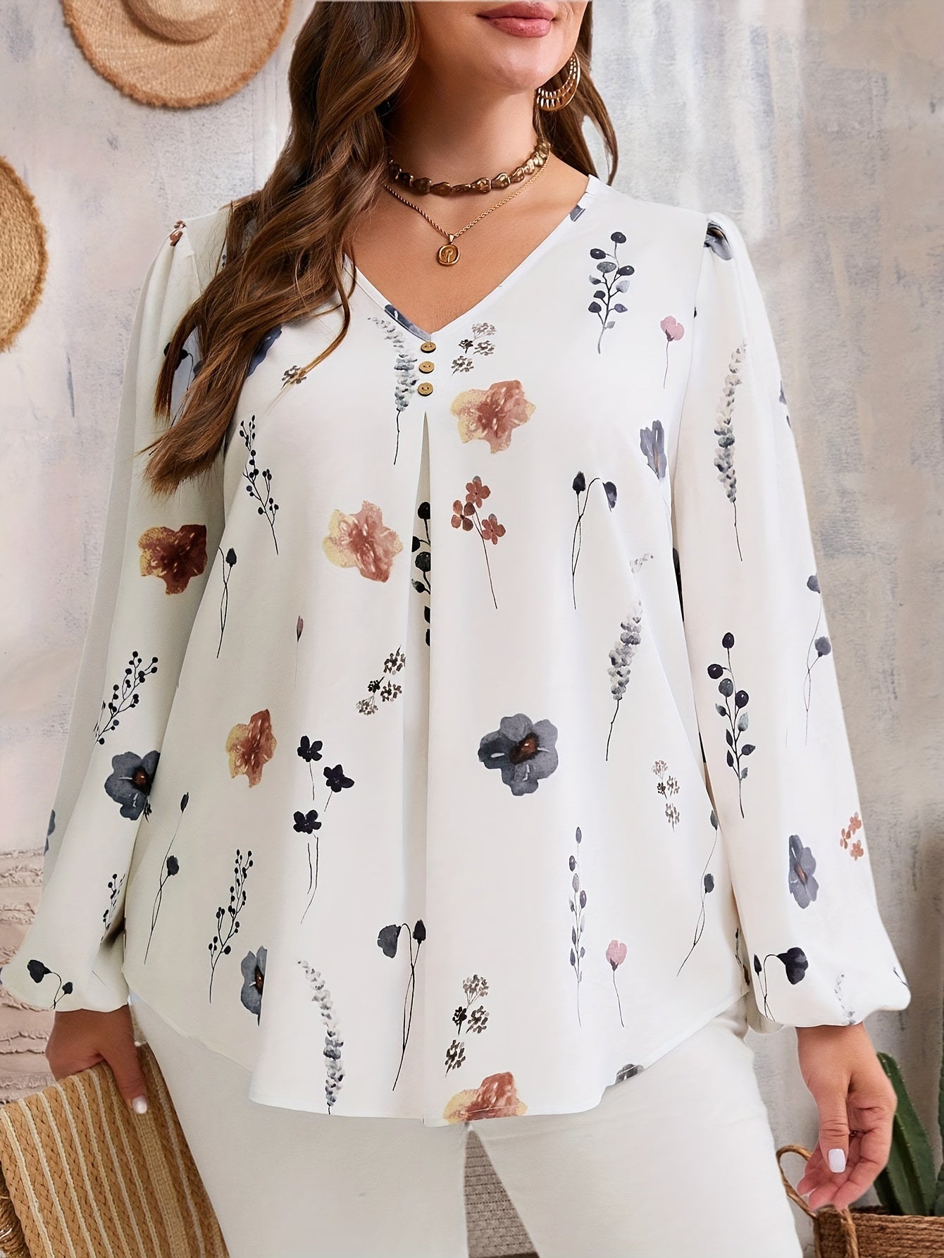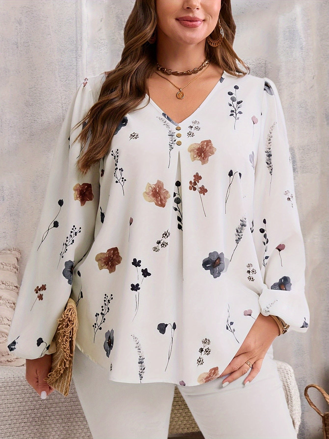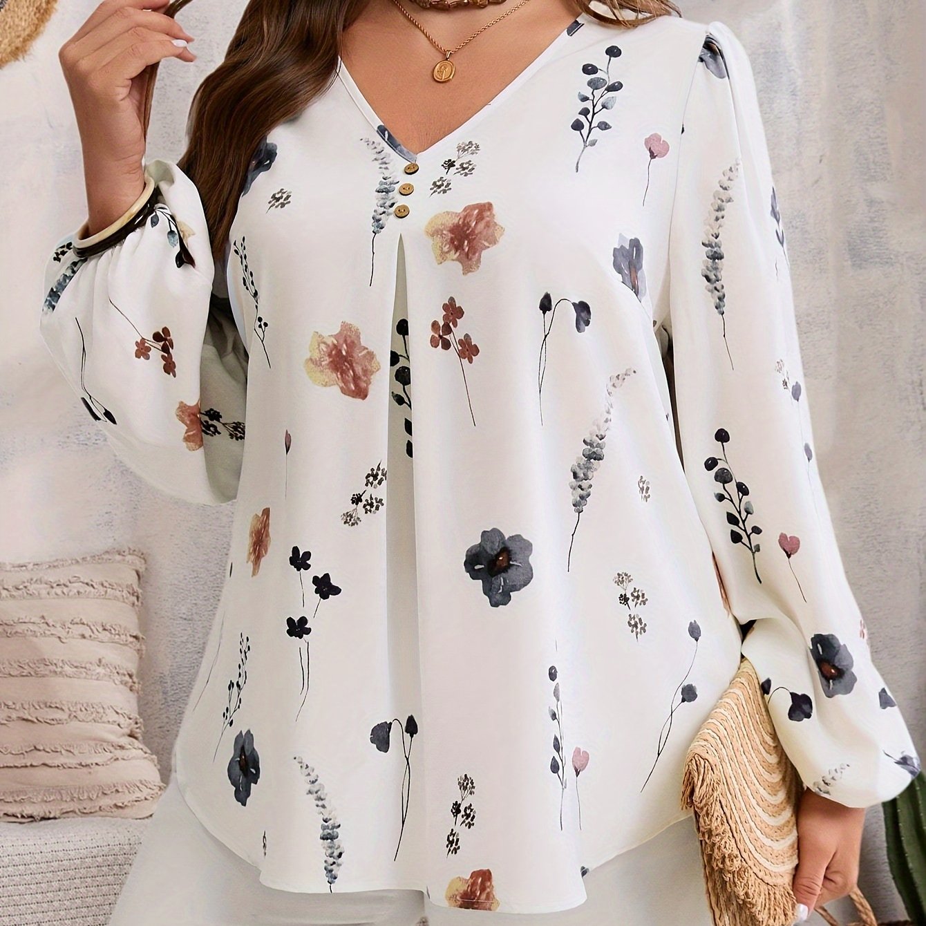 Блузка с цветочным принтом и V-образным вырезом для полных с рукавами-фонариками на весну и осень