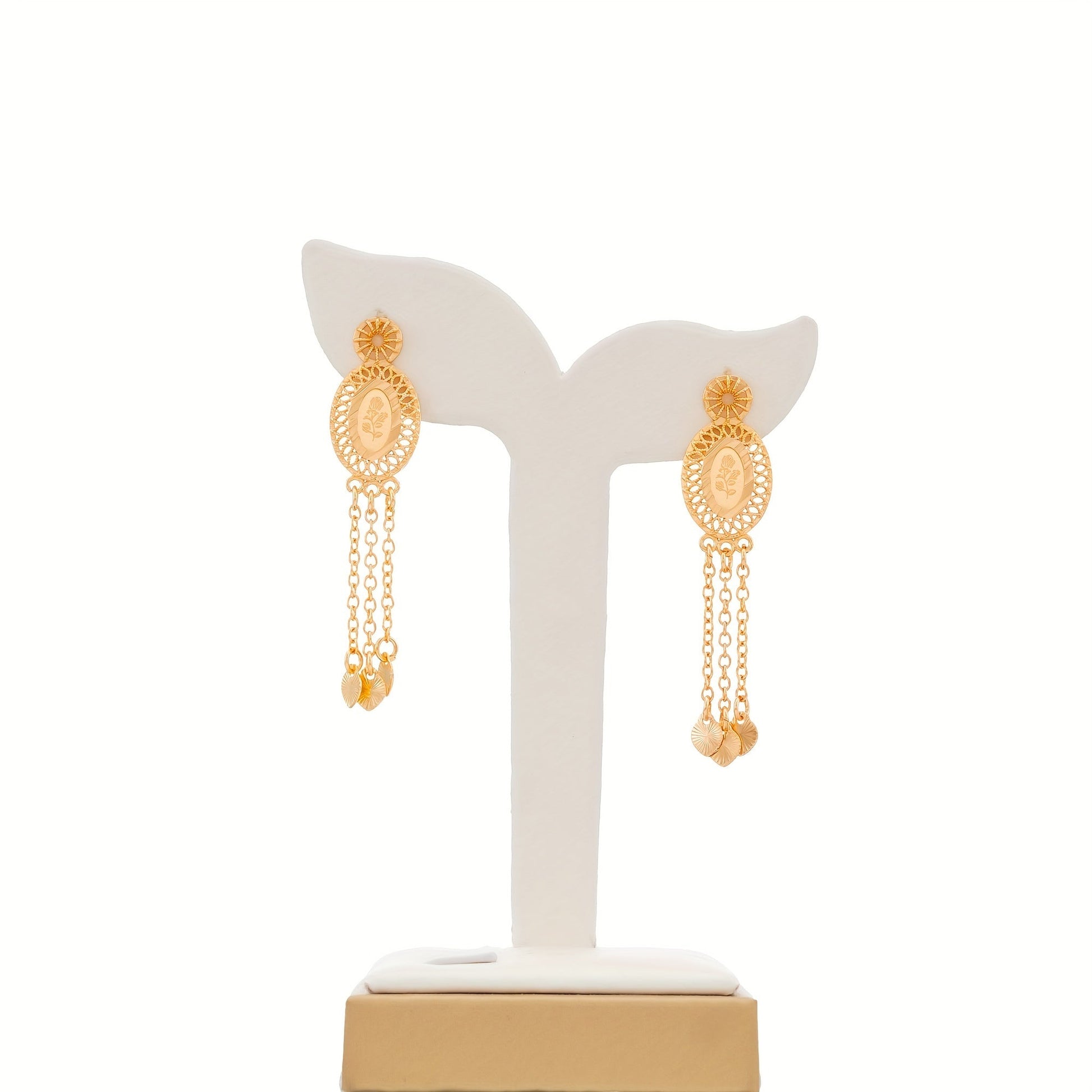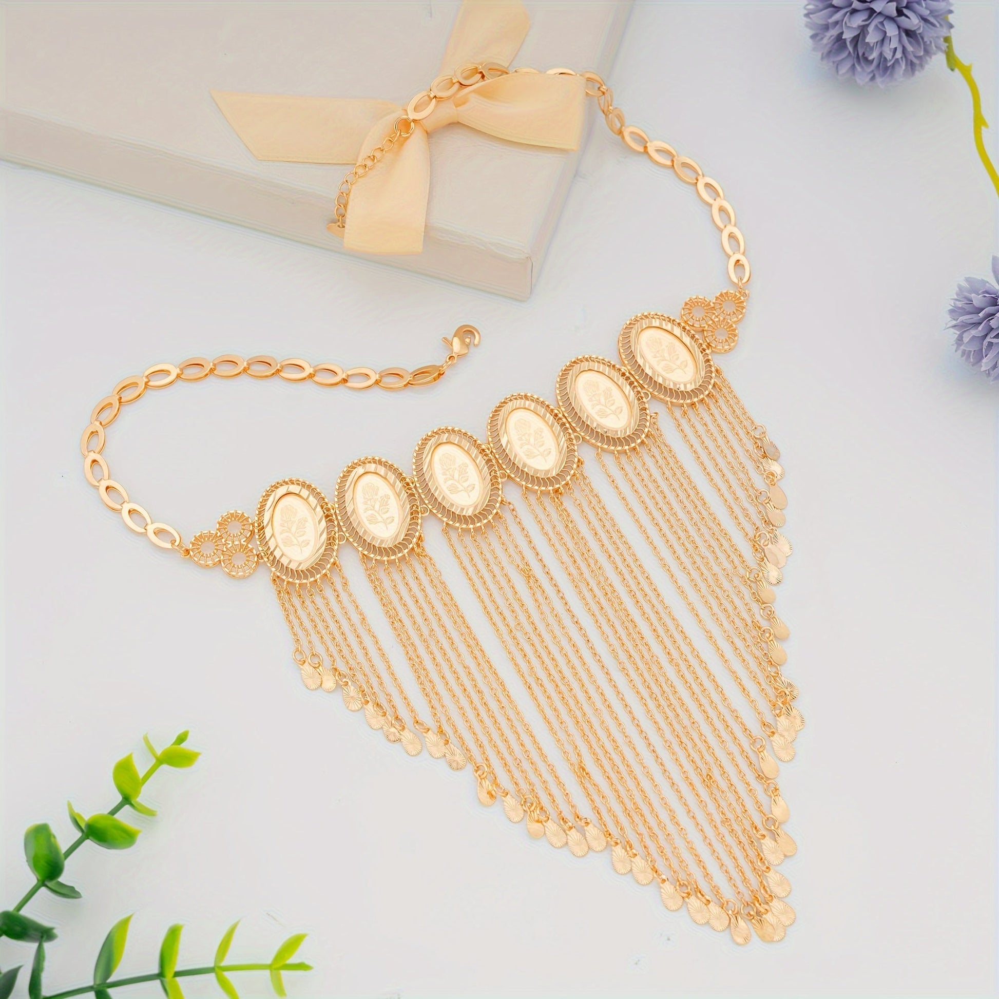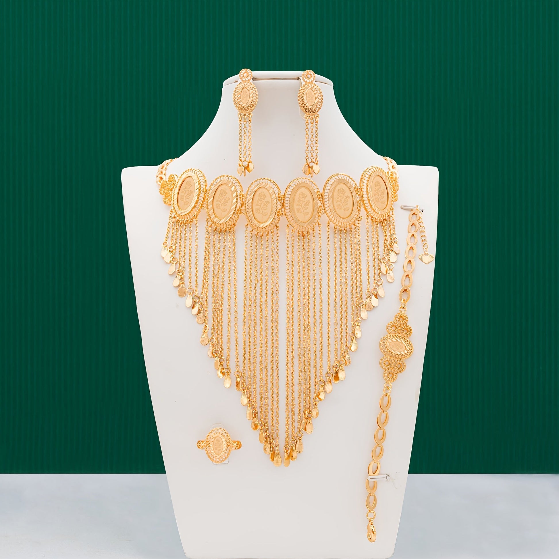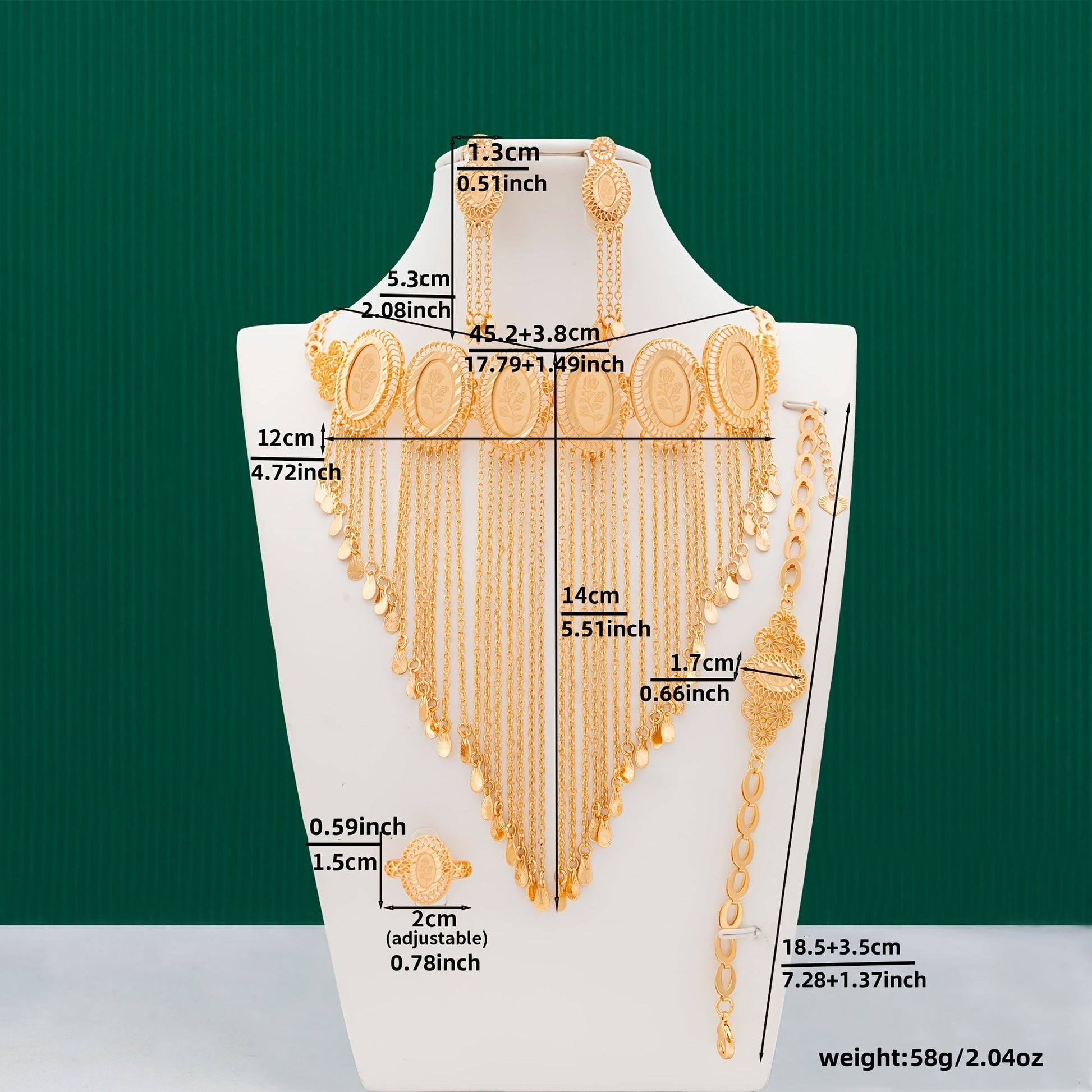 Изысканный набор ювелирных изделий с кисточками и розовым принтом в арабском стиле - изготовлен из высококачественной меди и прочного шампанского покрытия - идеальная коллекция для невест на свадьбы, банкеты и празднования Рамадана - включает 5 предметов.