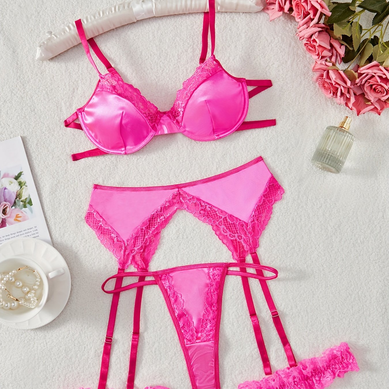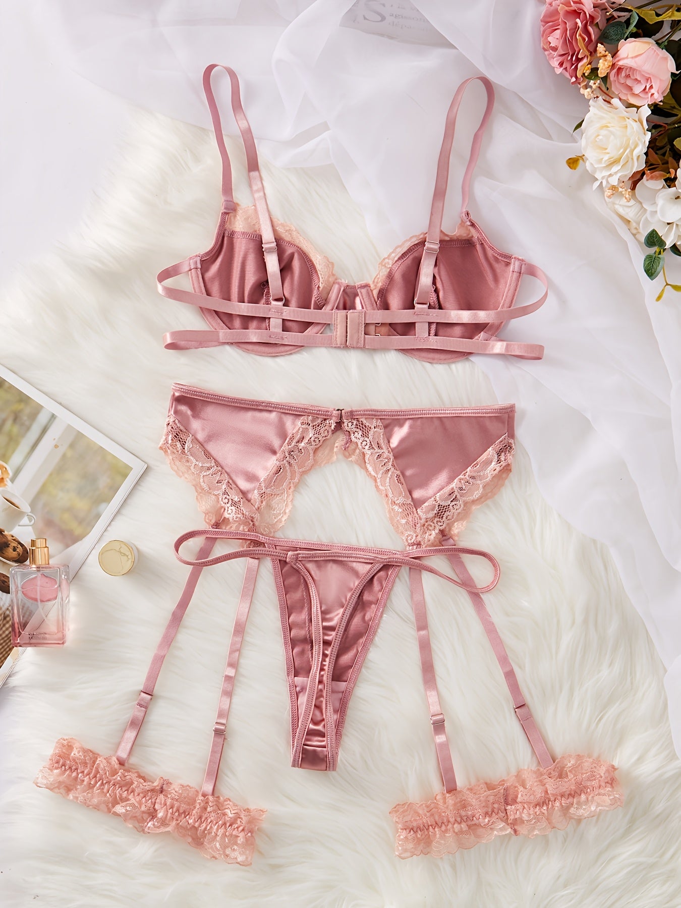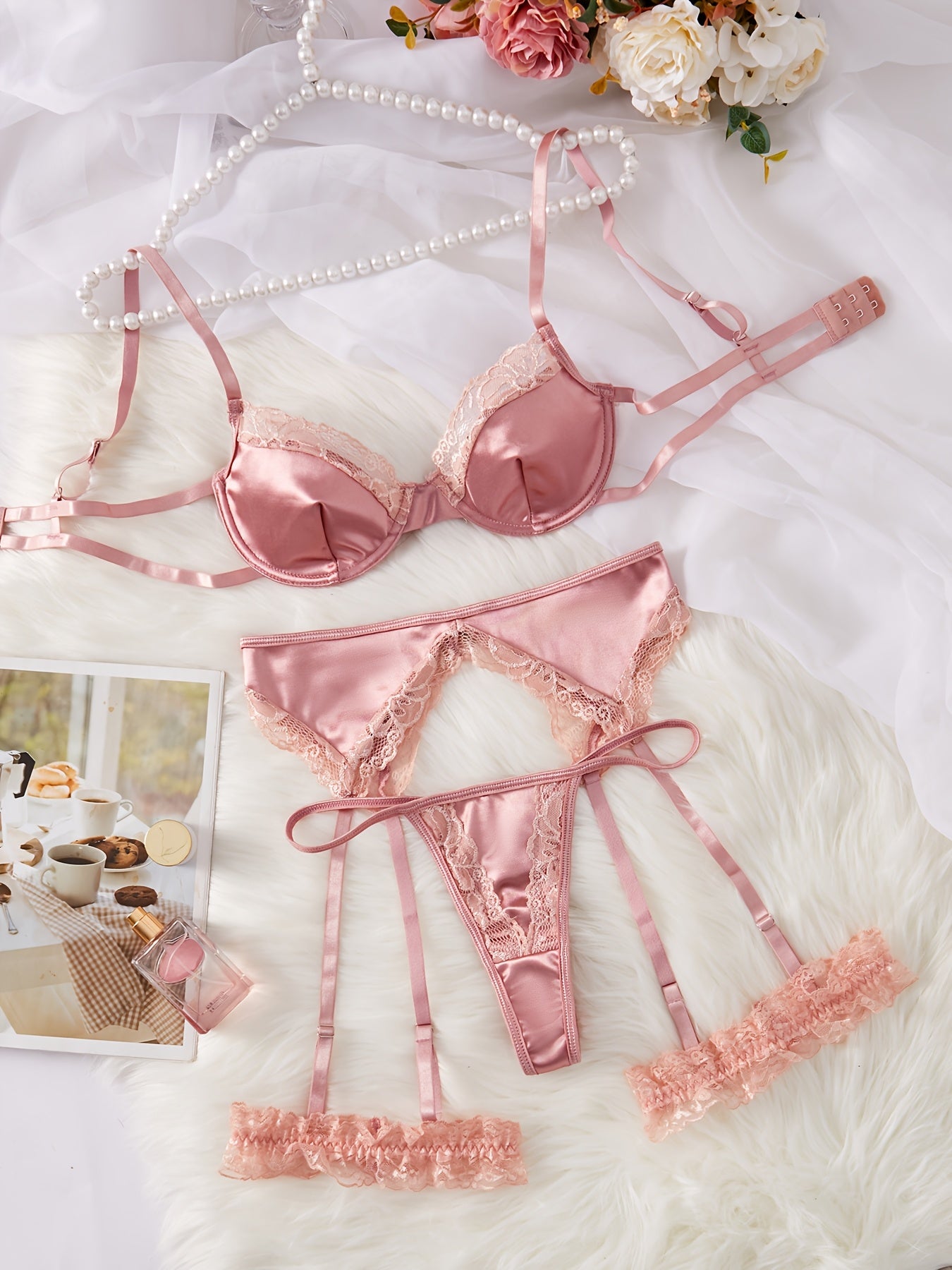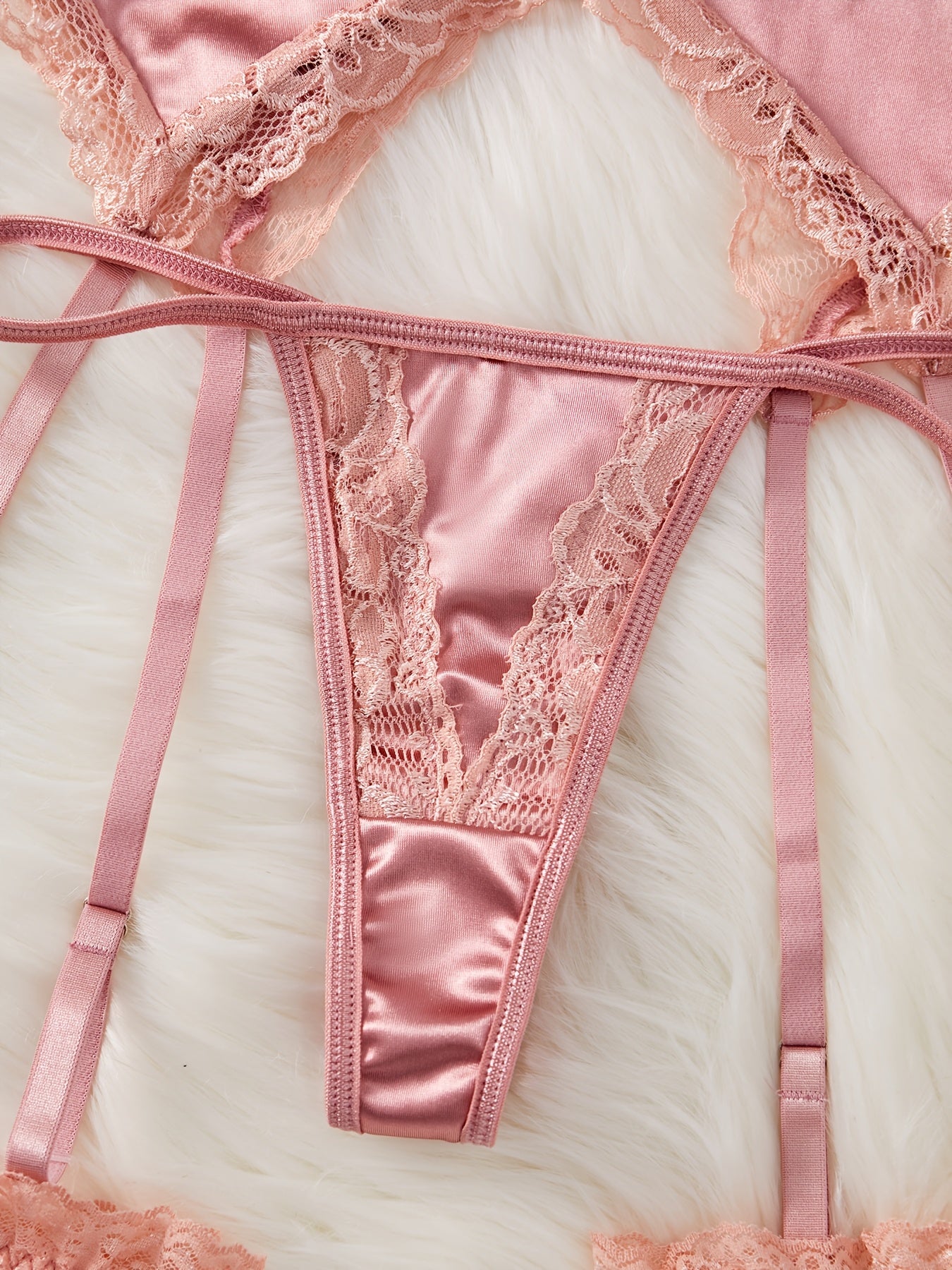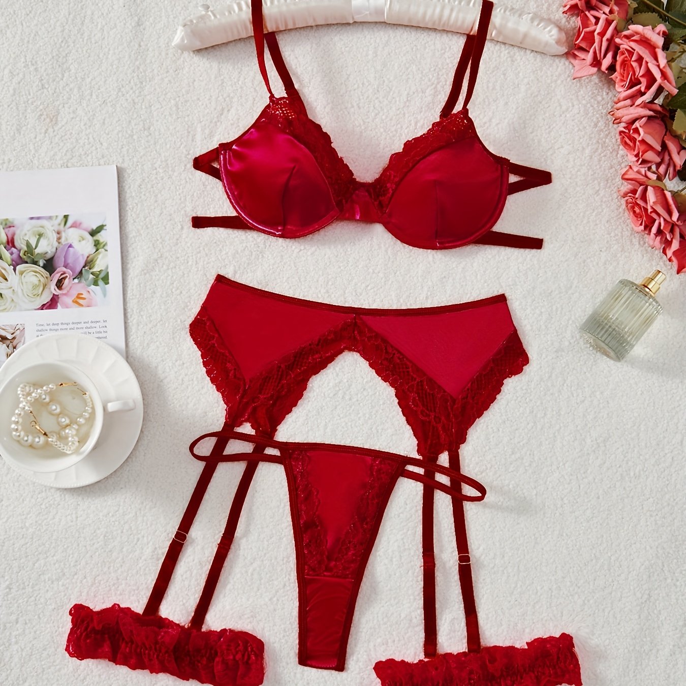 Распродажа Осень/Зима: Женский комплект кружевного бюстгальтера с thong, поясом для чулок и кольцами для ног