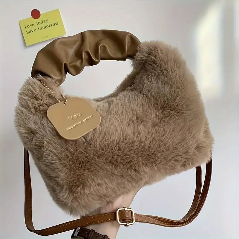 Модная сумка через плечо из искусственного меха для женщин с мягкой текстурой, застежкой на молнии и универсальным цветом, идеальная для осени и зимы.
