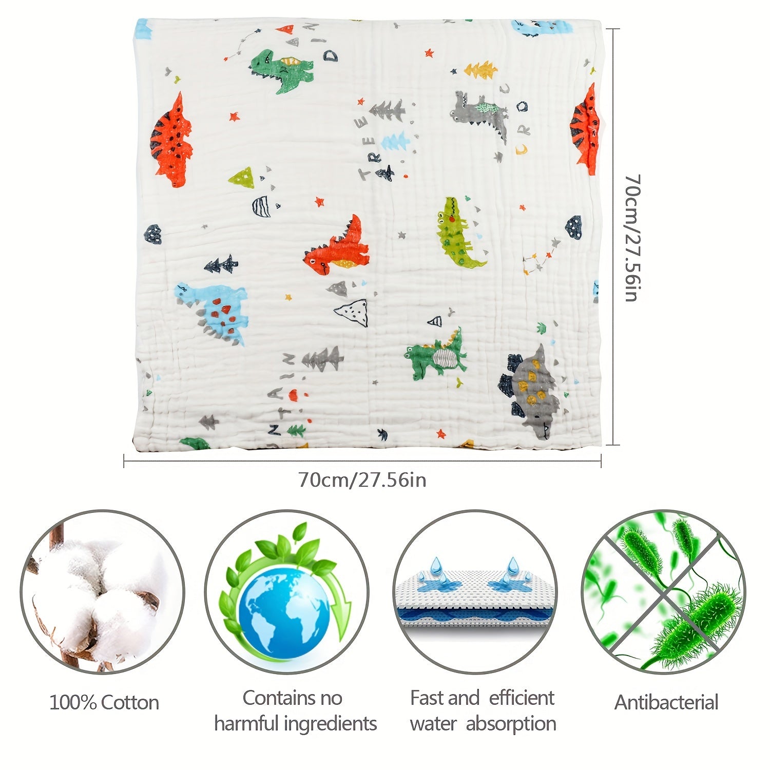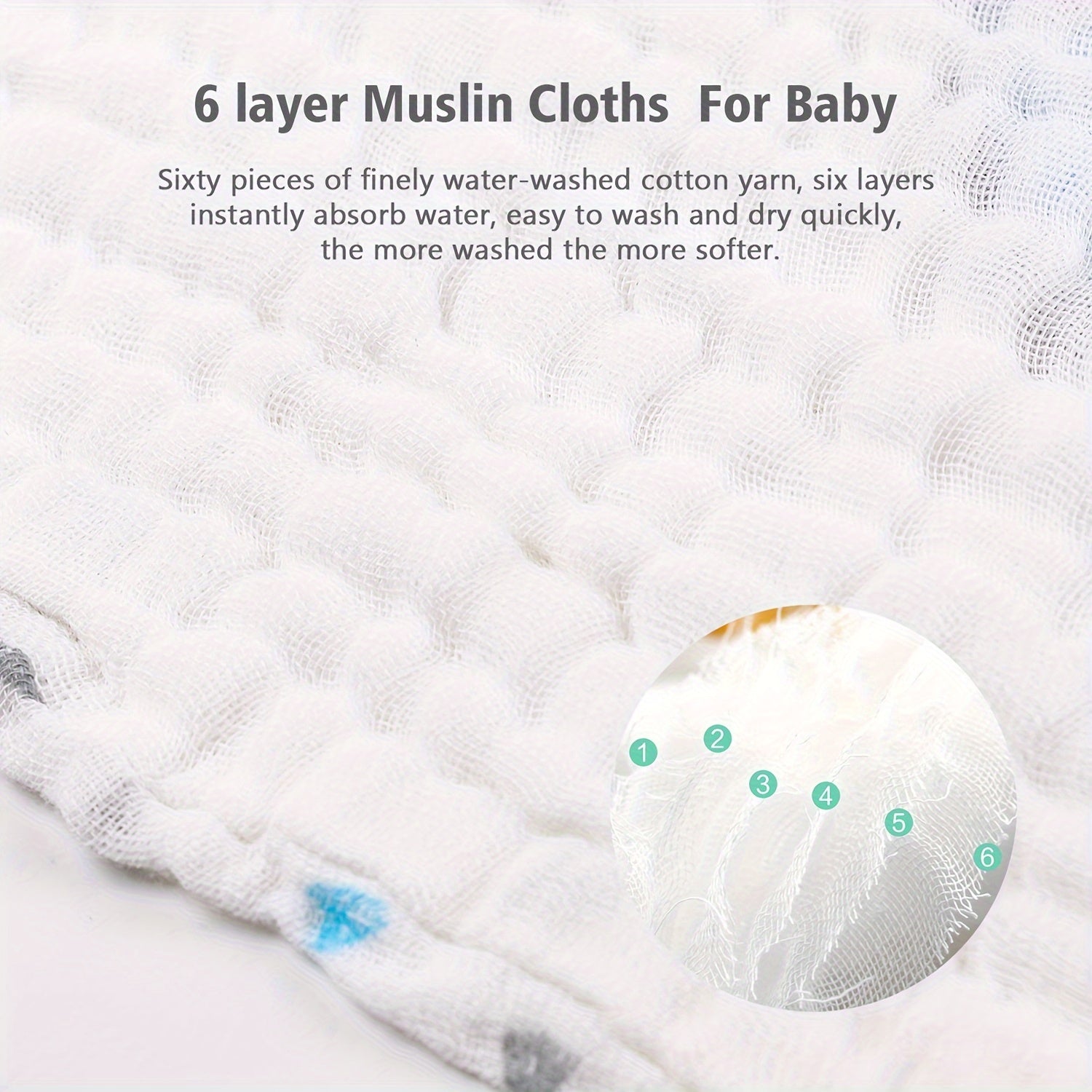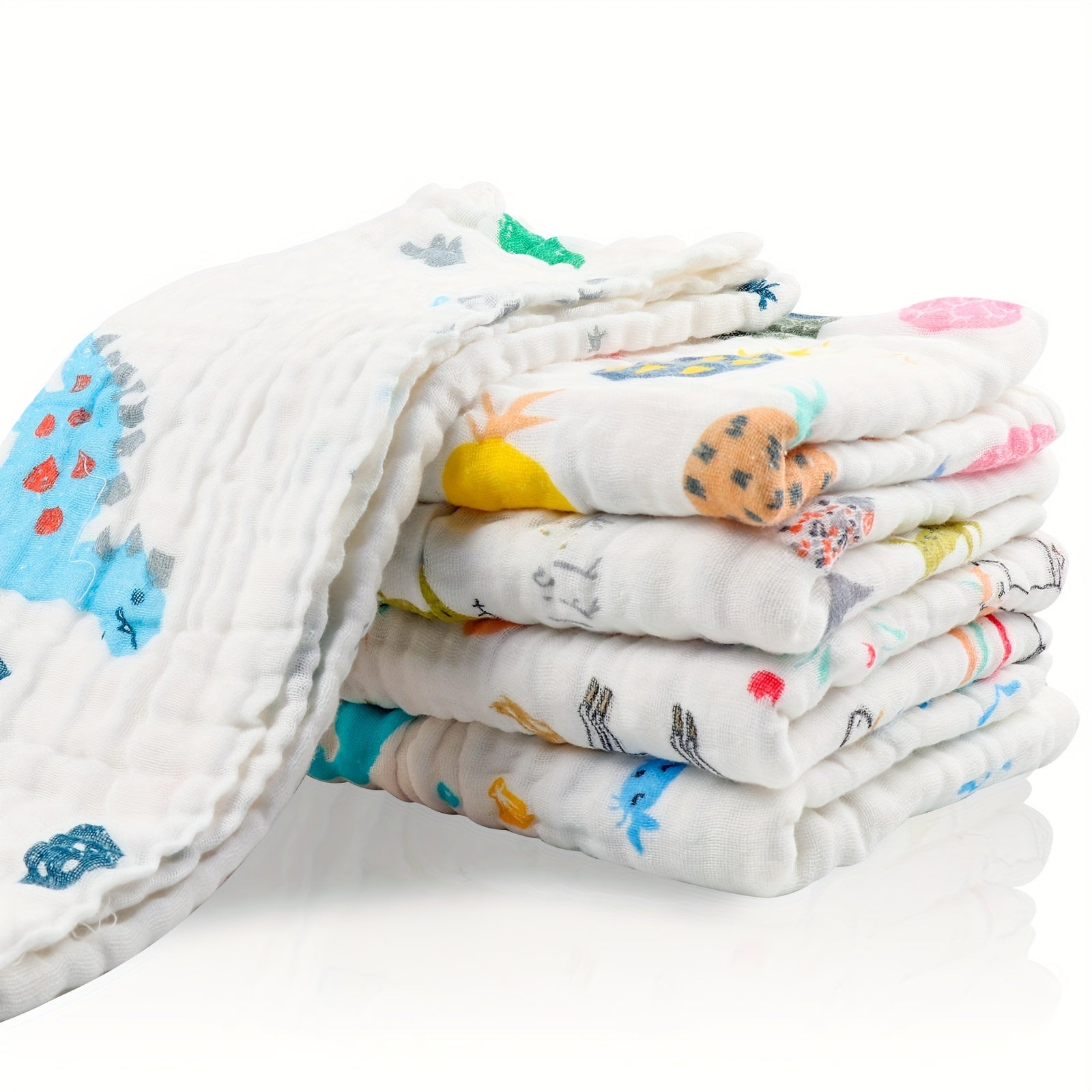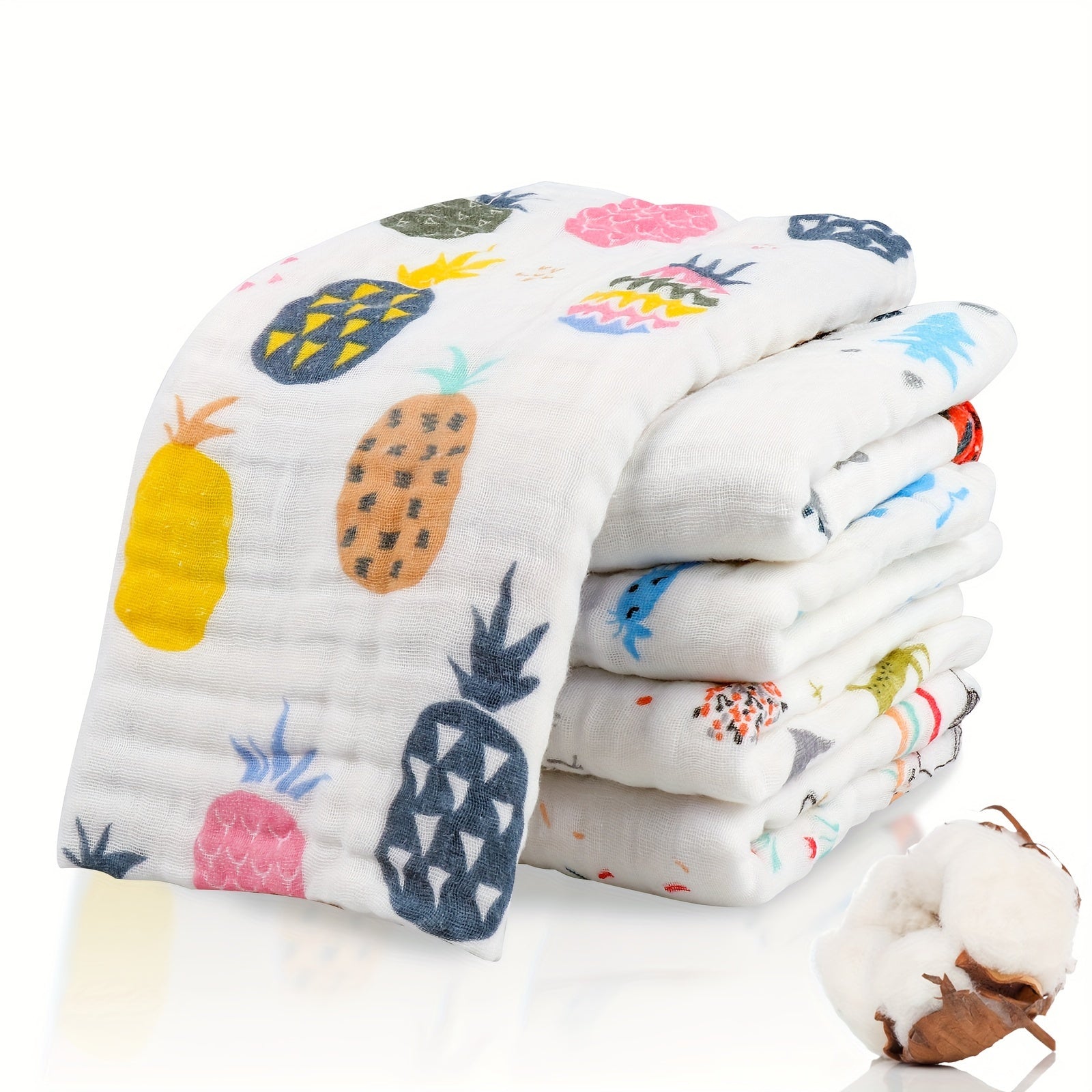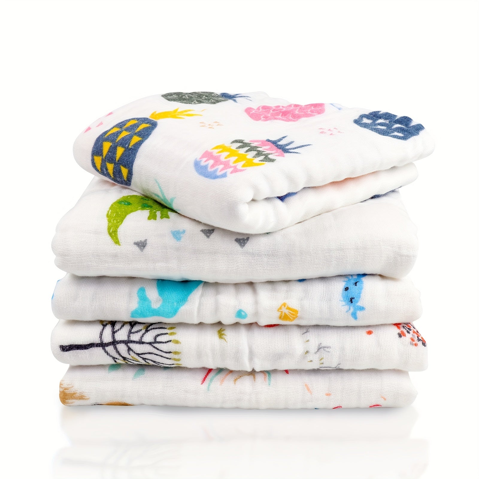Пять штук мягких и впитывающих хлопковых муслиновых полотенец размером 70x70 см, с 6-слойным дизайном, идеально подходящих для использования в качестве банных или лицевых полотенец.