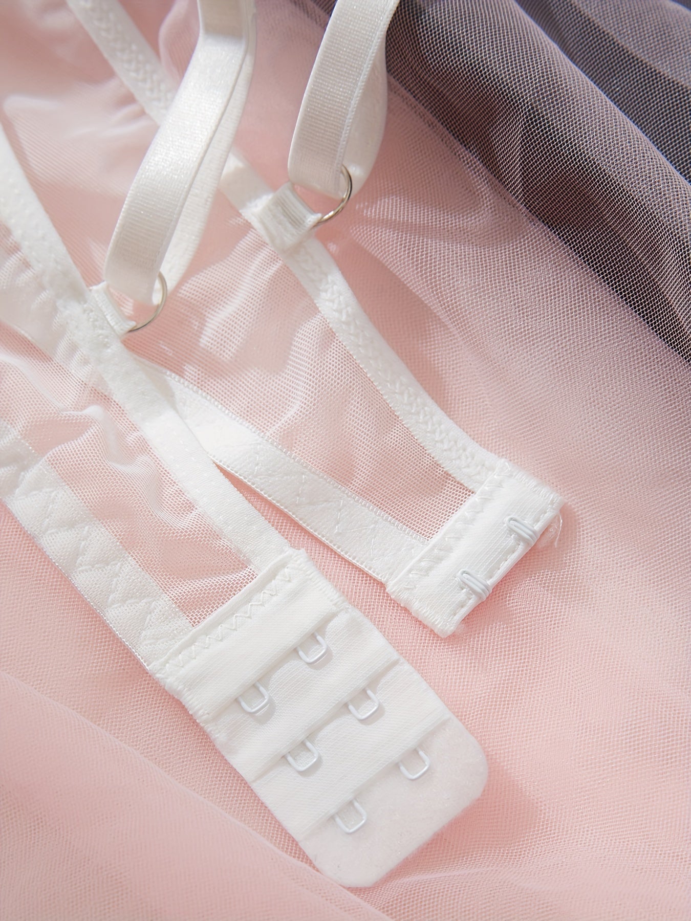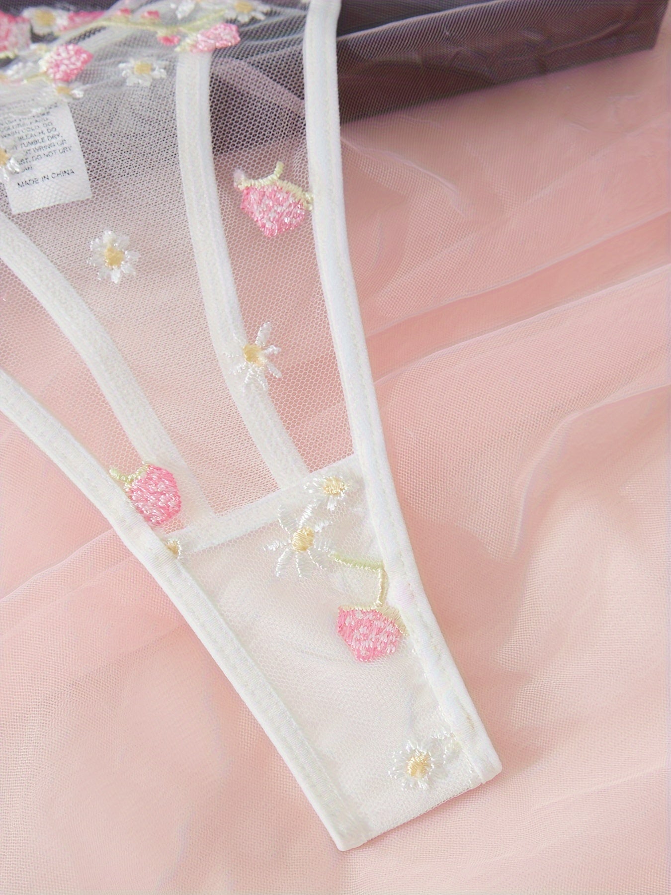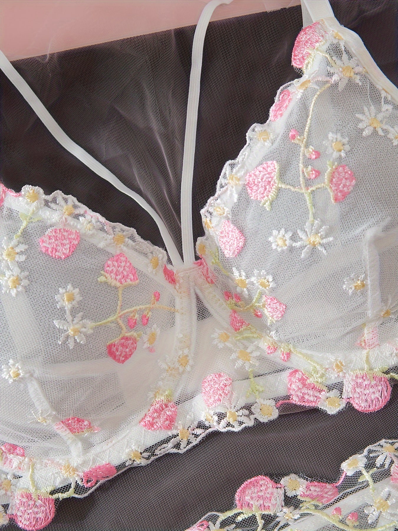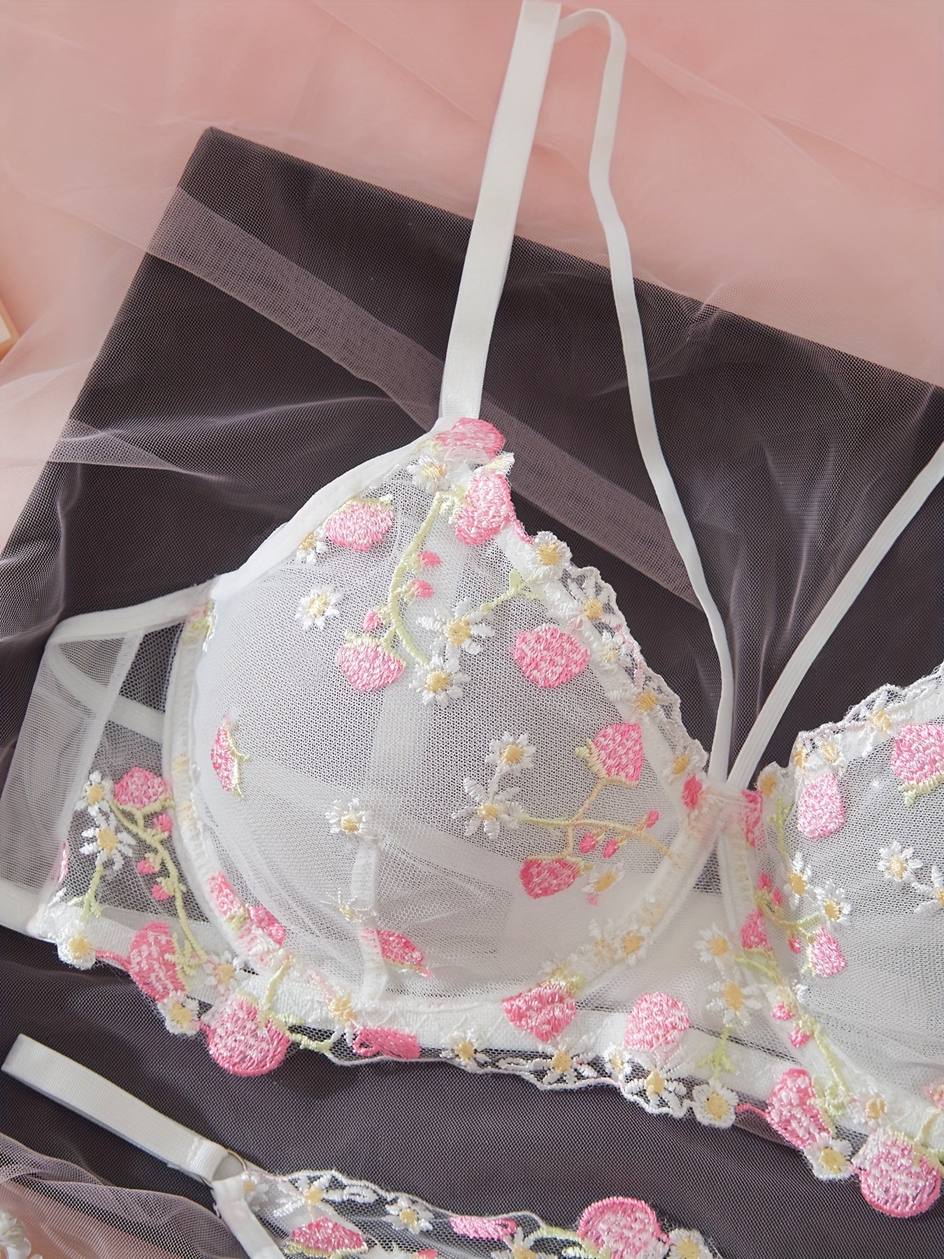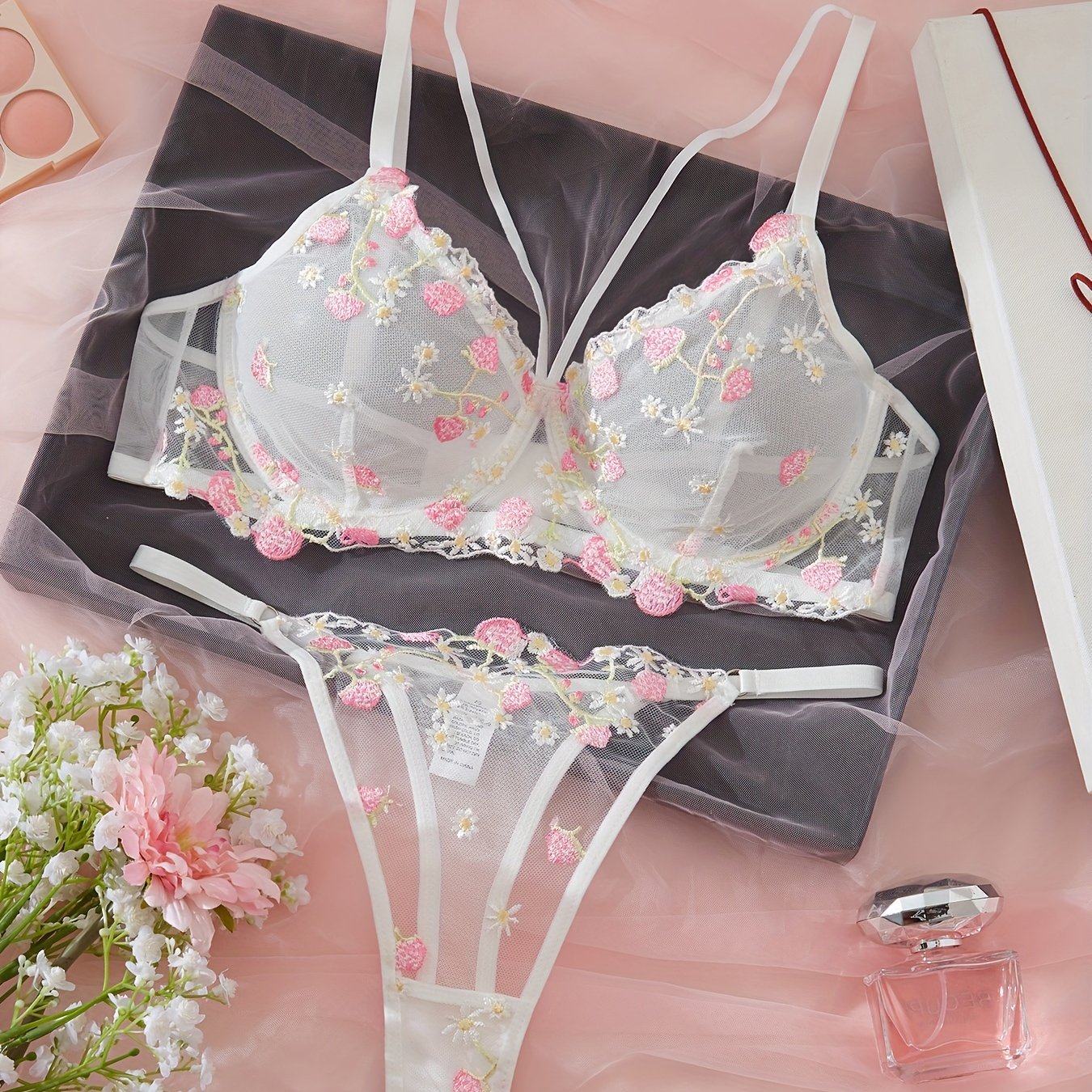Комплект нижнего белья для женщин: бюстгальтер с цветочной вышивкой и стринги.