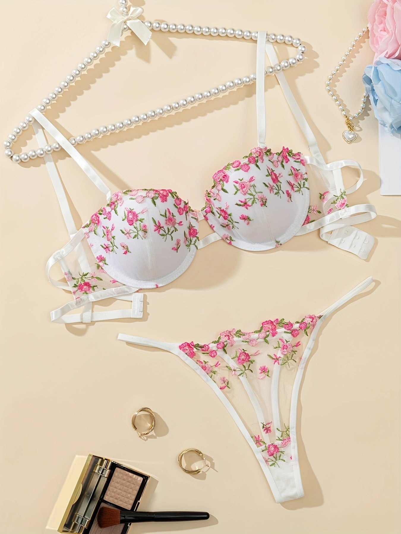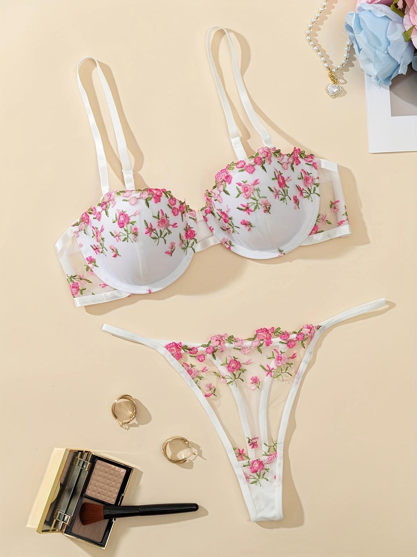 Женский комплект нижнего белья с цветочной вышивкой - бюстгальтер на каркасах и сетчатые стринги, дышащая полиэстеровая смесь, несъемные чашечки.