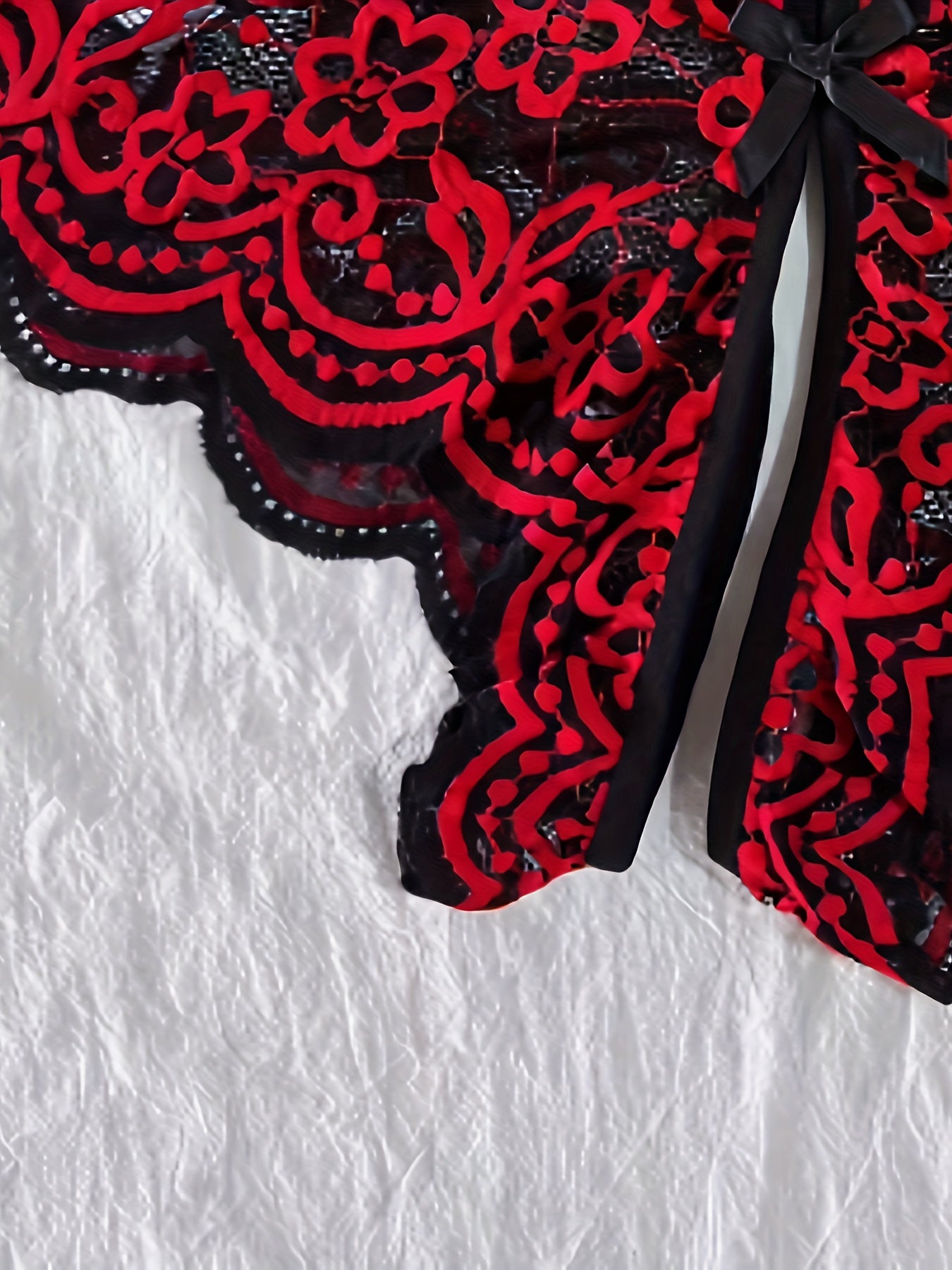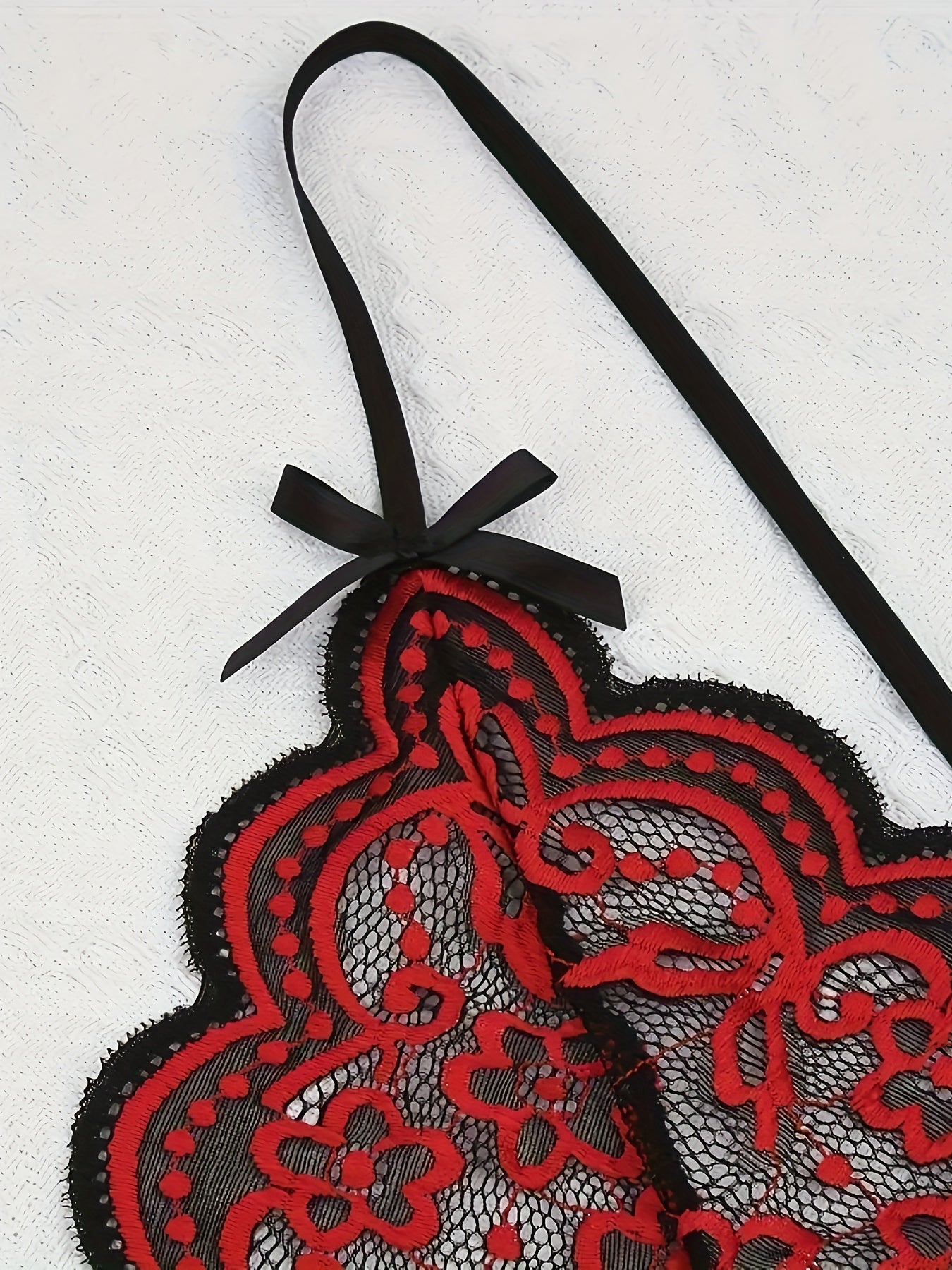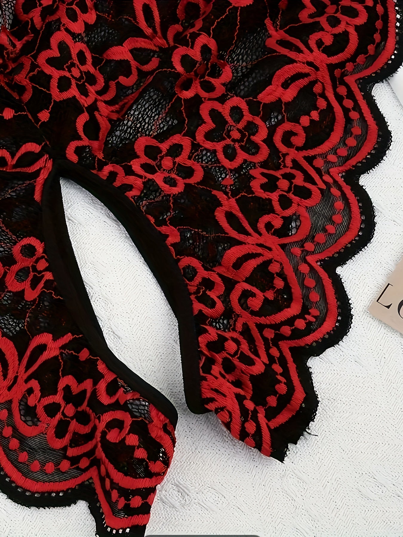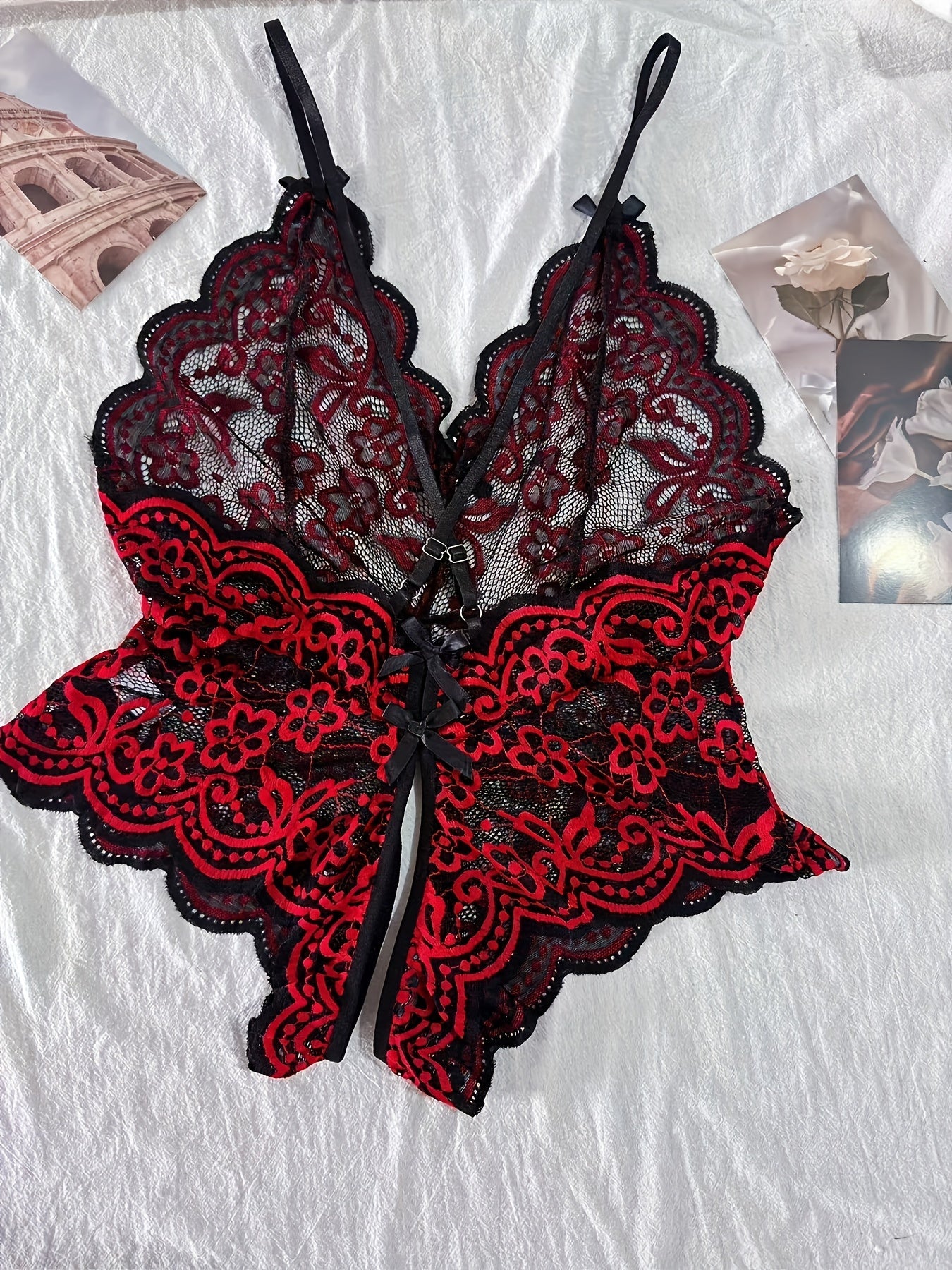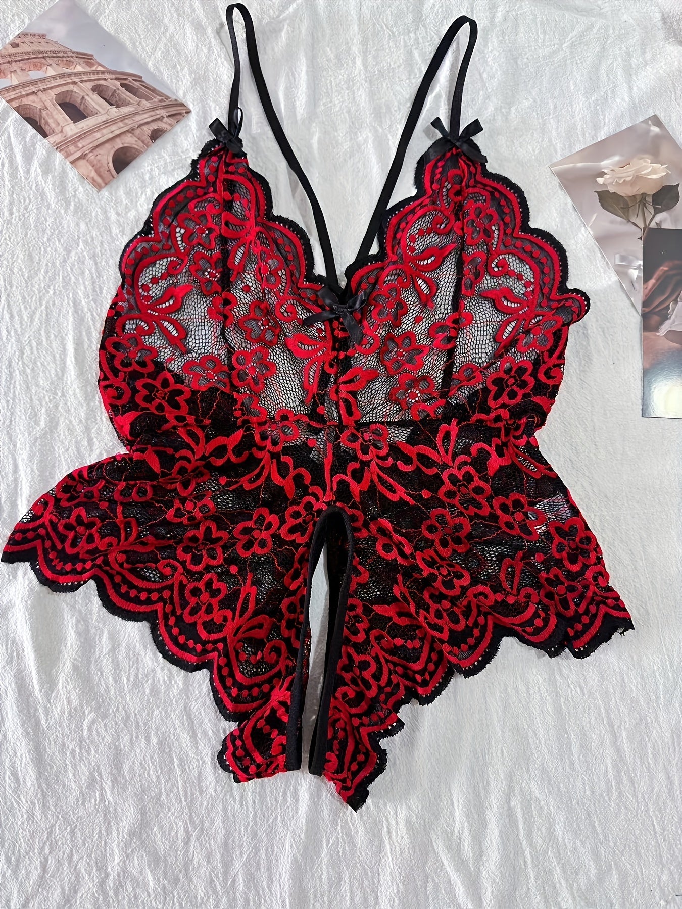 Кружевное кружево с волнистым краем, комбинезон с V-образным вырезом и открытым шагом - сексуальное женское белье.