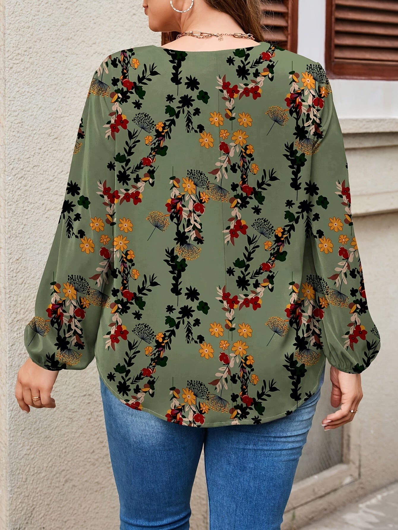 Блузка с цветочным принтом и V-образным вырезом для полных с рукавами-фонариками, повседневная, из полиэстера, для всех сезонов