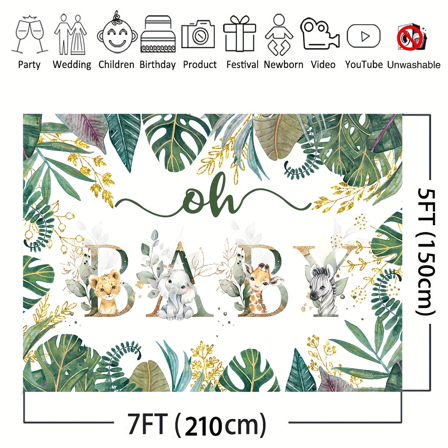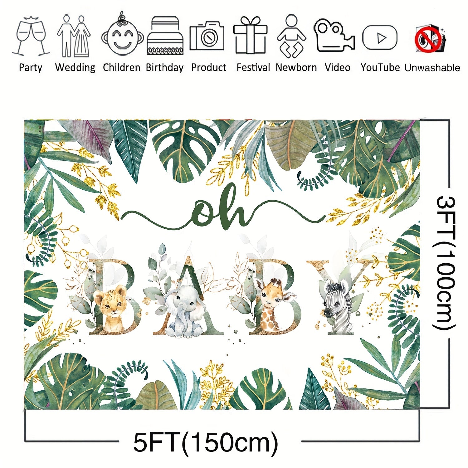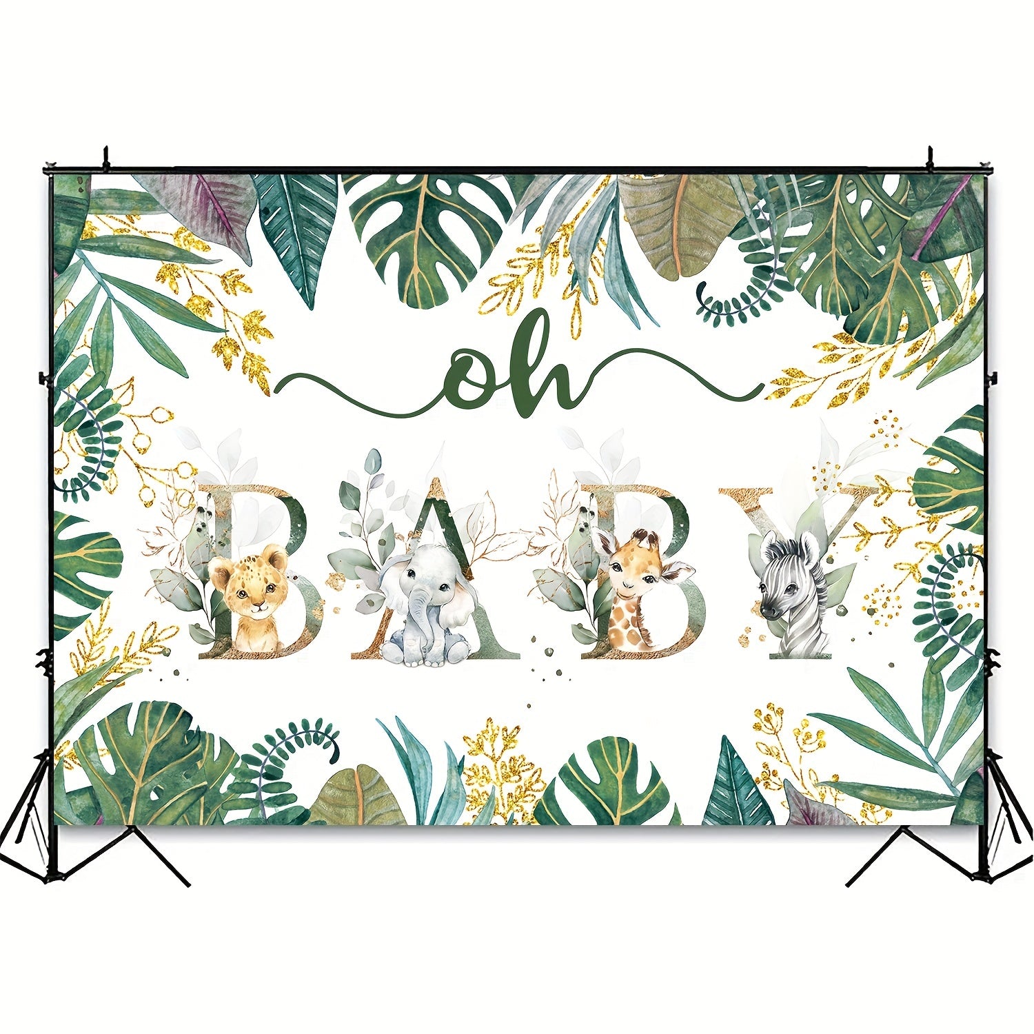Гендерно-нейтральный фон для джунглей для душа или дня рождения, с золотыми акцентами, зелеными листьями и милыми иллюстрациями животных. Размеры 213,36x152,4 см.