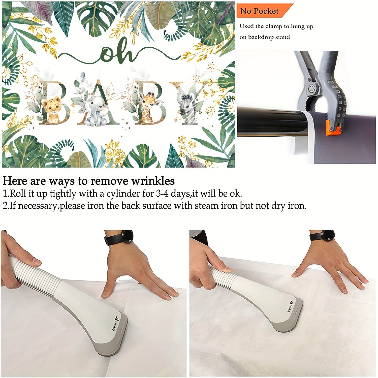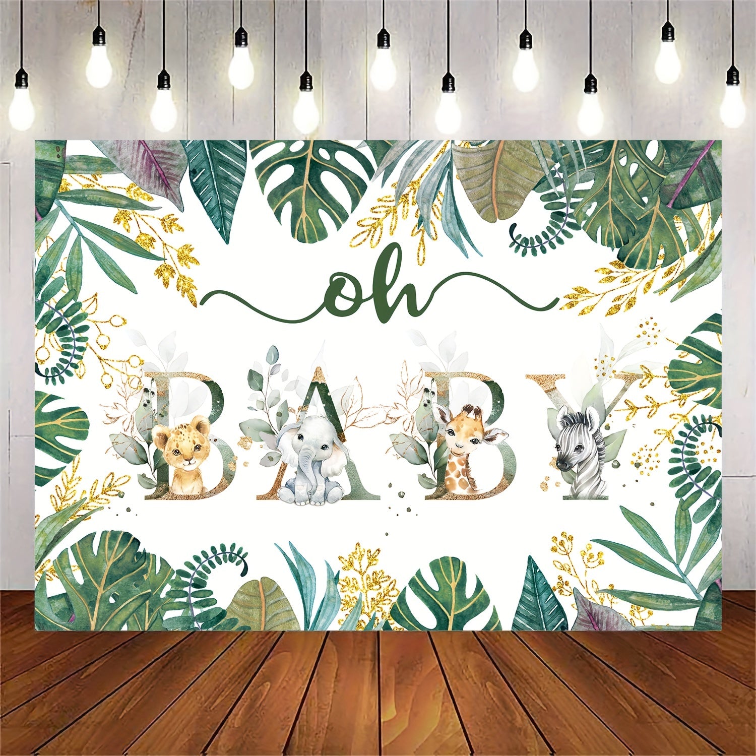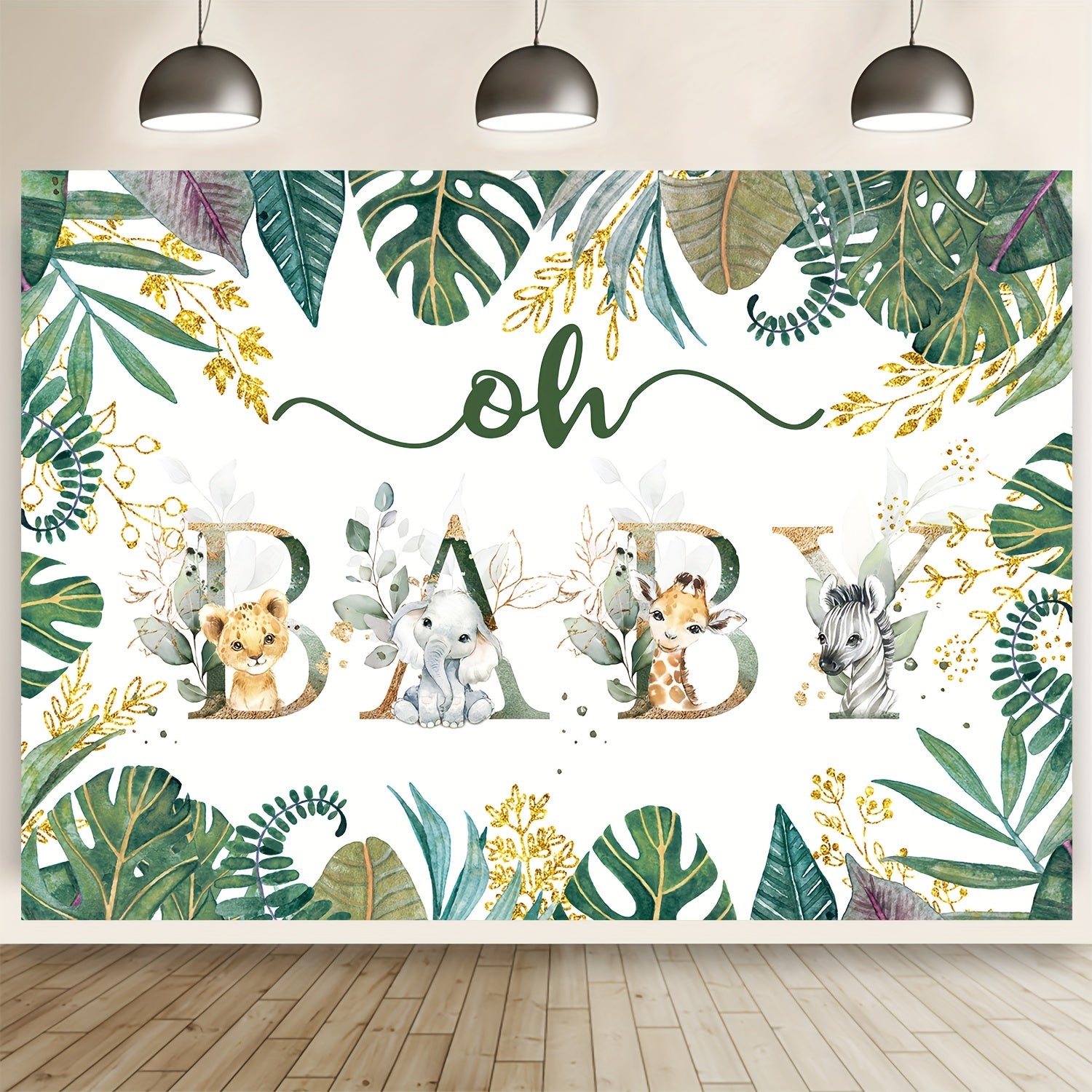 Гендерно-нейтральный фон для джунглей для душа или дня рождения, с золотыми акцентами, зелеными листьями и милыми иллюстрациями животных. Размеры 213,36x152,4 см.