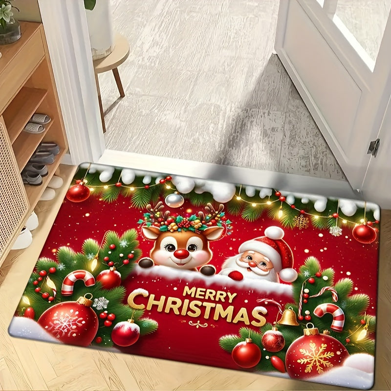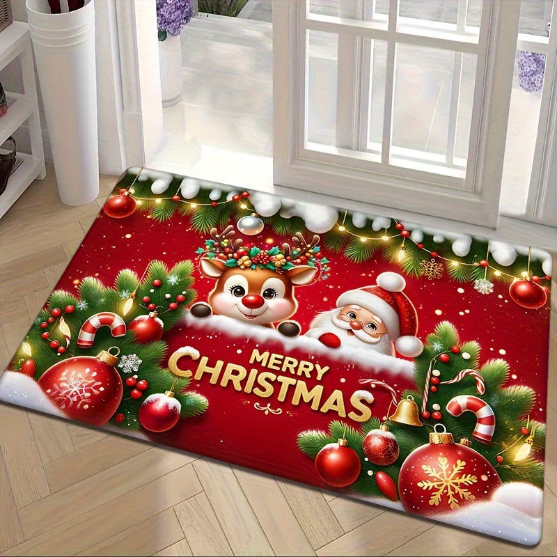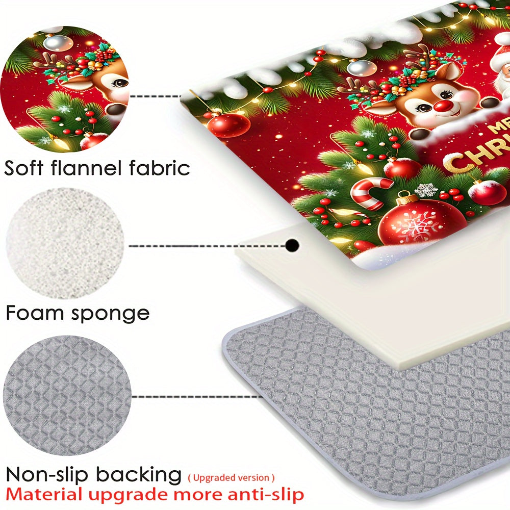 Красный фланелевый рождественский коврик на дверь, нескользящий, с узором Санты и оленя, утолщённый поролон