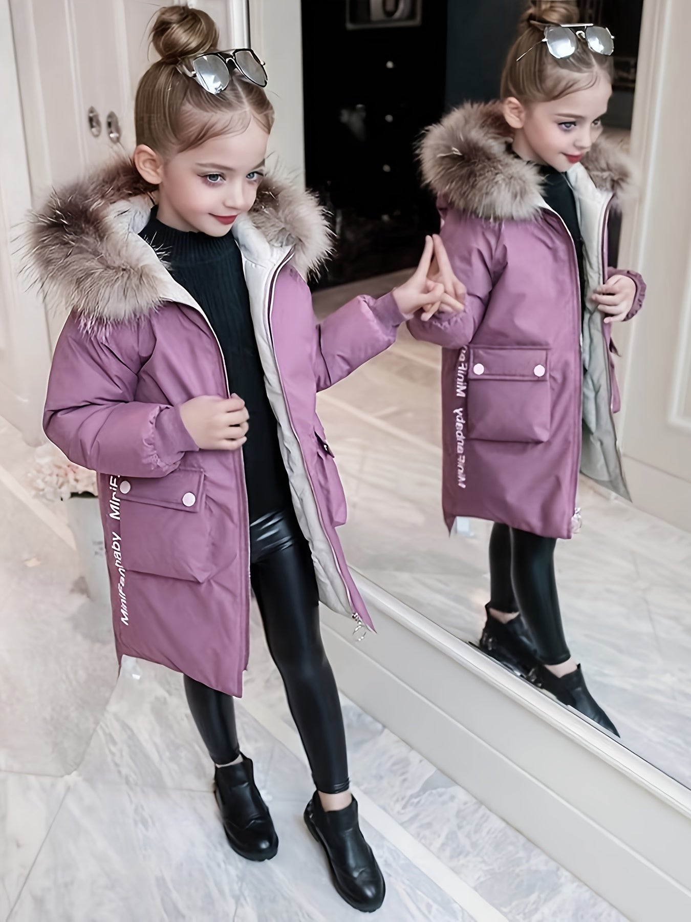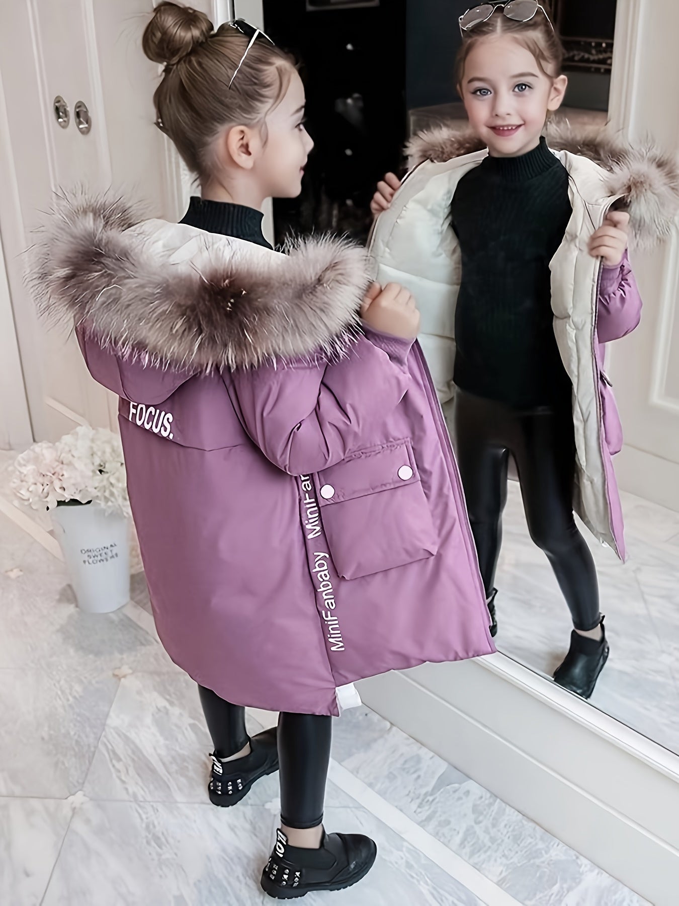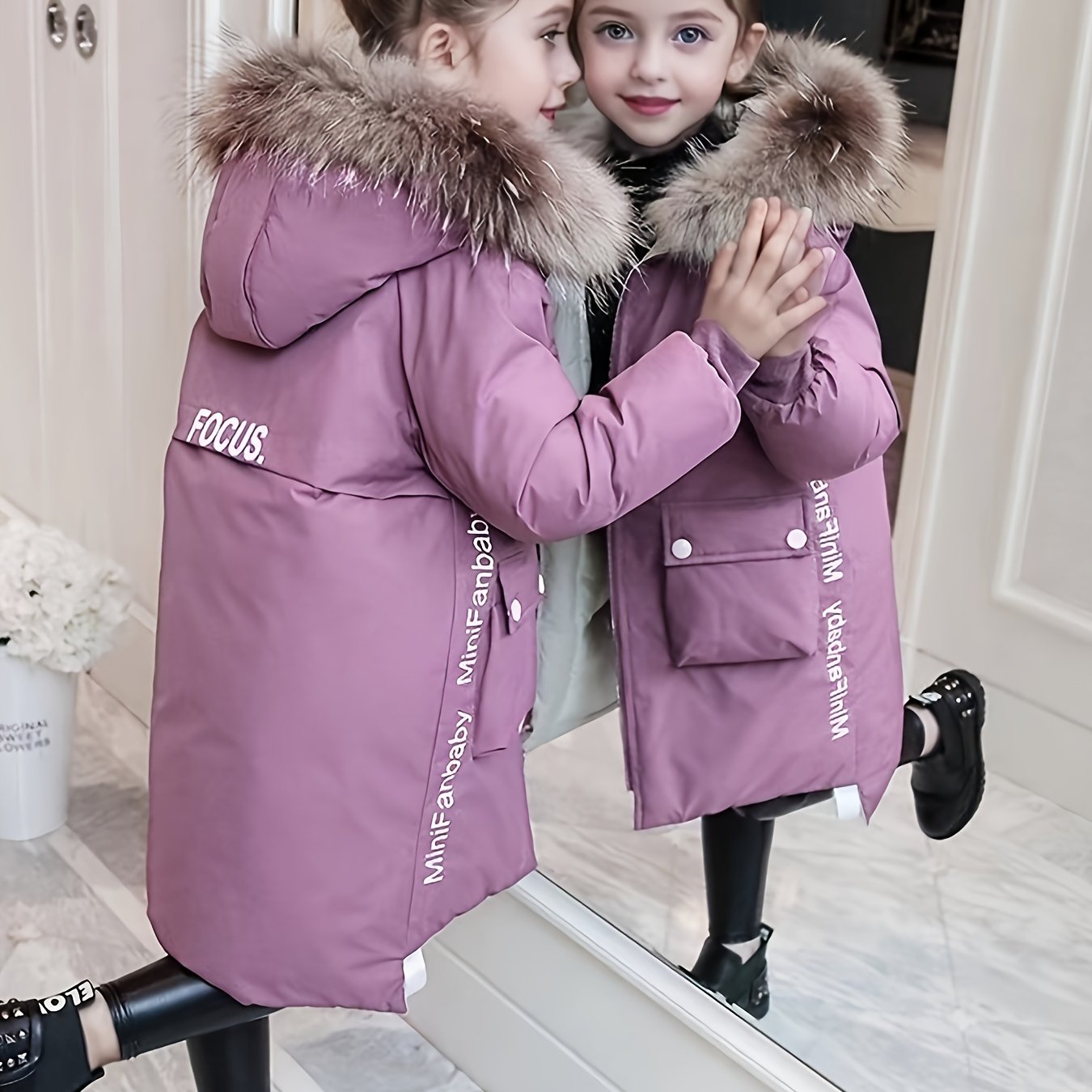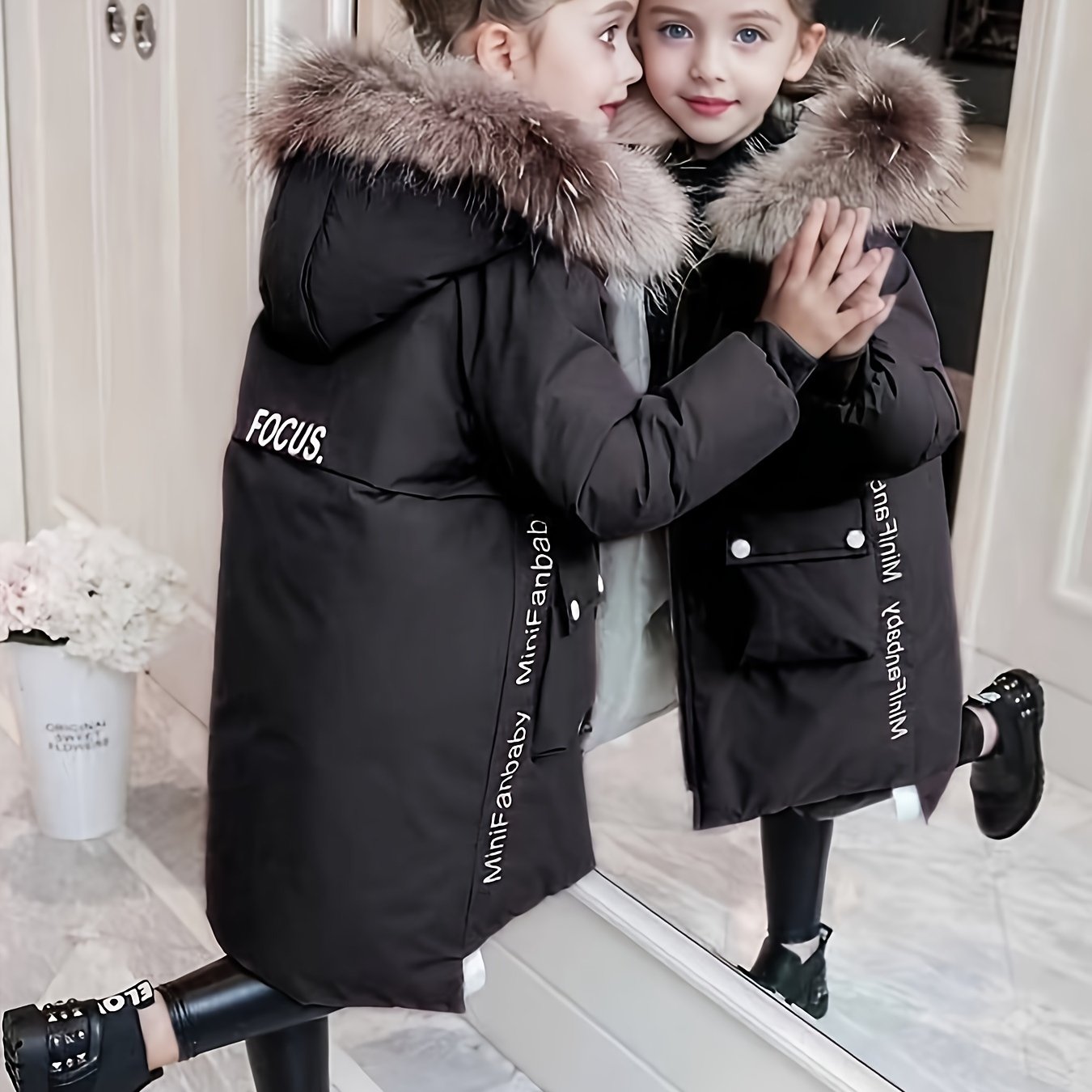 Демисезонное зимнее пальто для девочек с искусственным мехом и алфавитным узором, с капюшоном, на молнии