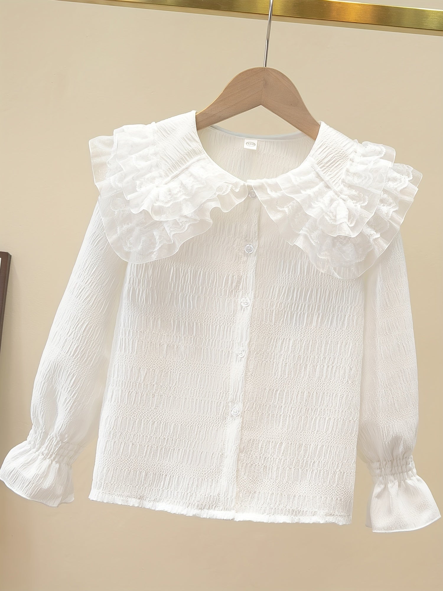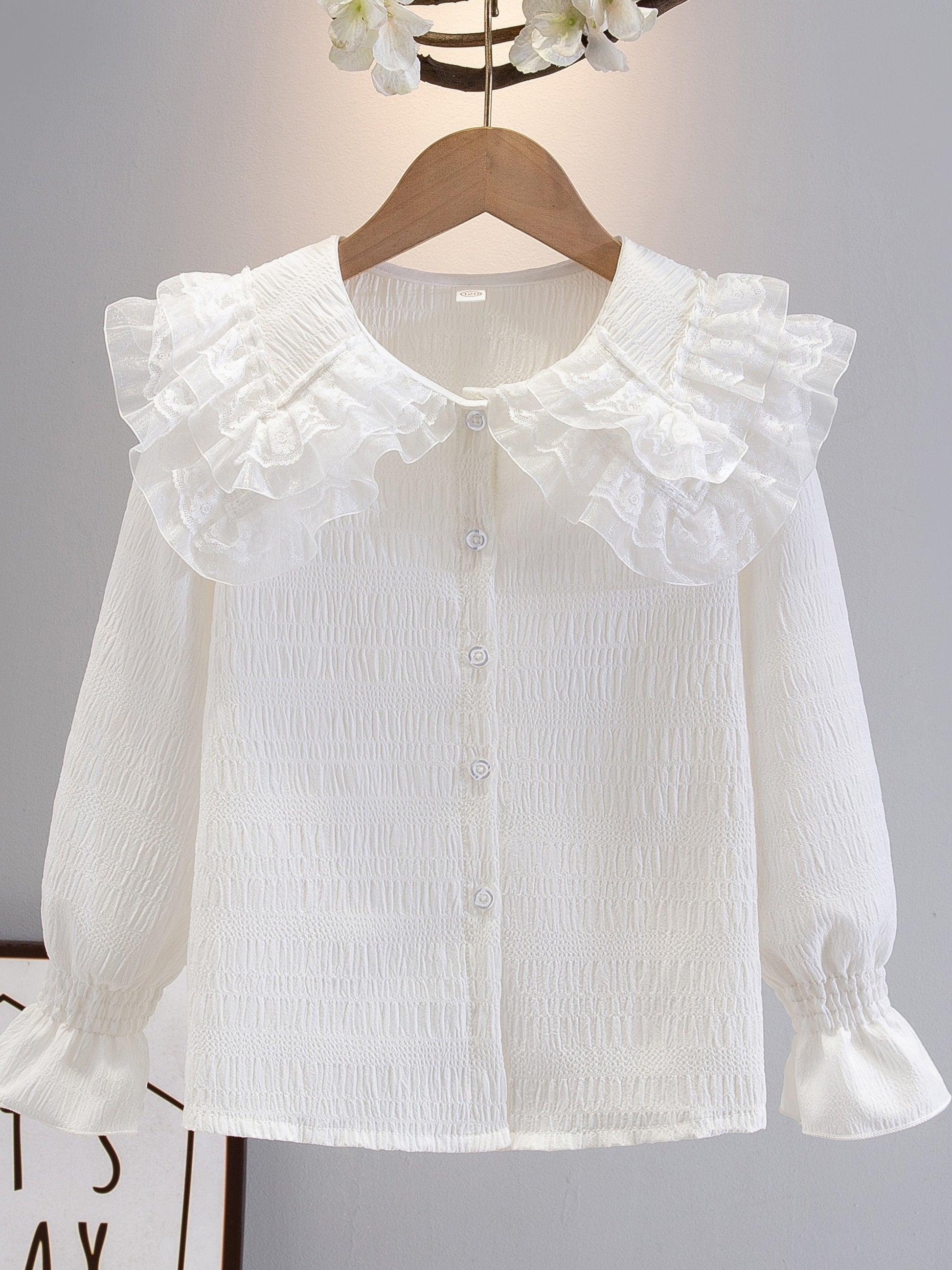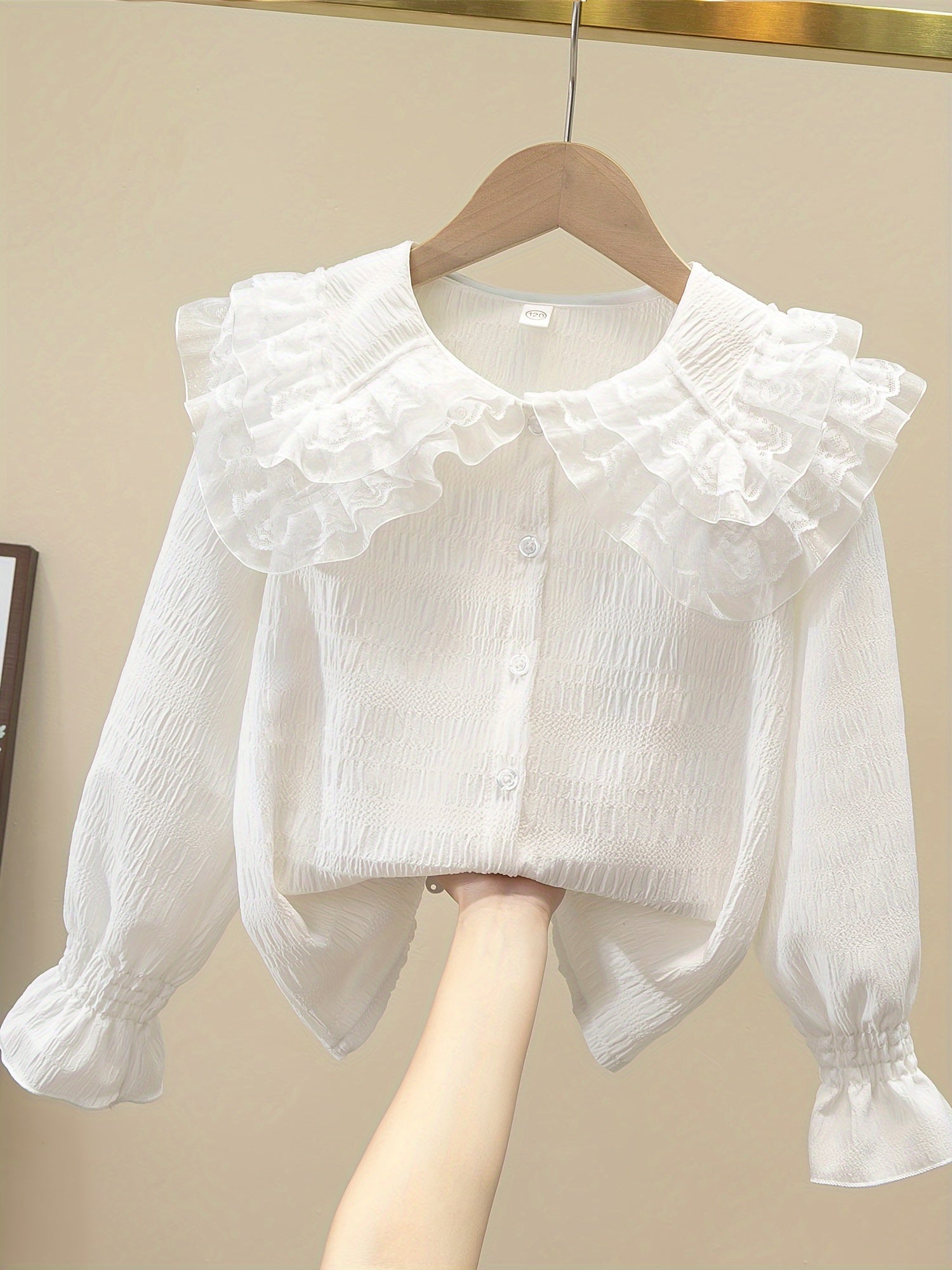 Девичья блузка с длинными рукавами из шифона с рюшами на воротнике однотонного цвета, идеально подходящая для милого академического стиля весной/осенью. Изготовлена из полиэстера, идеально подходит для повседневной носки.
